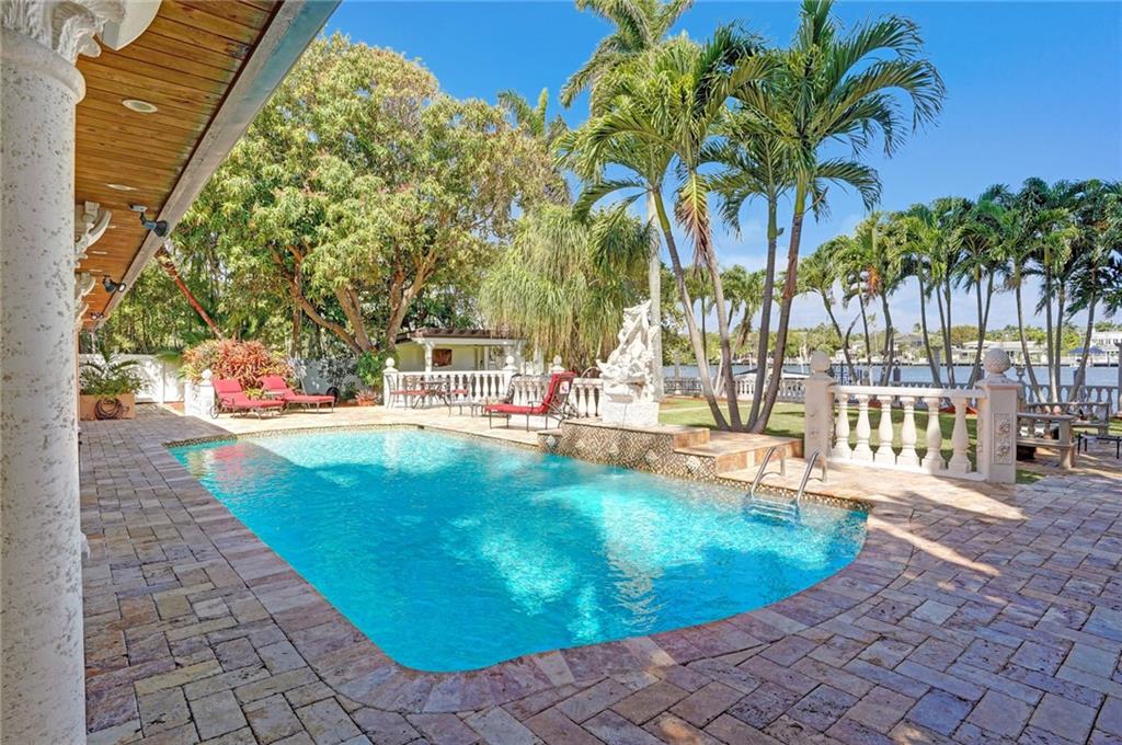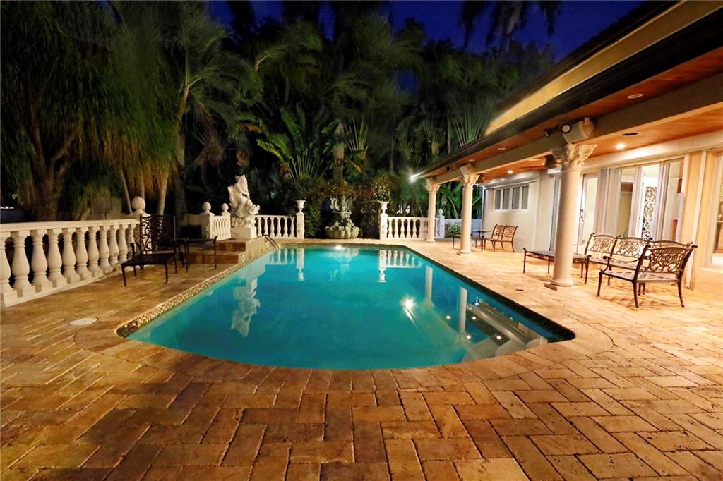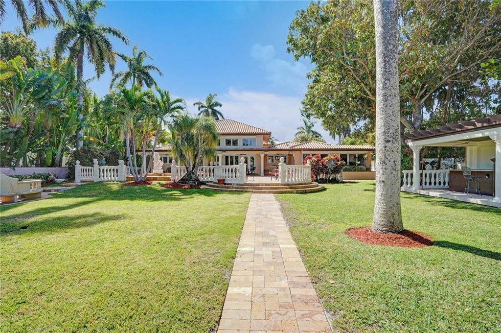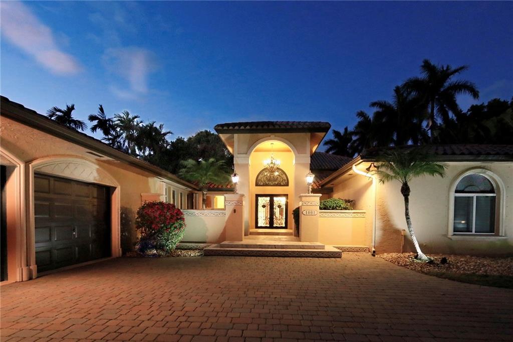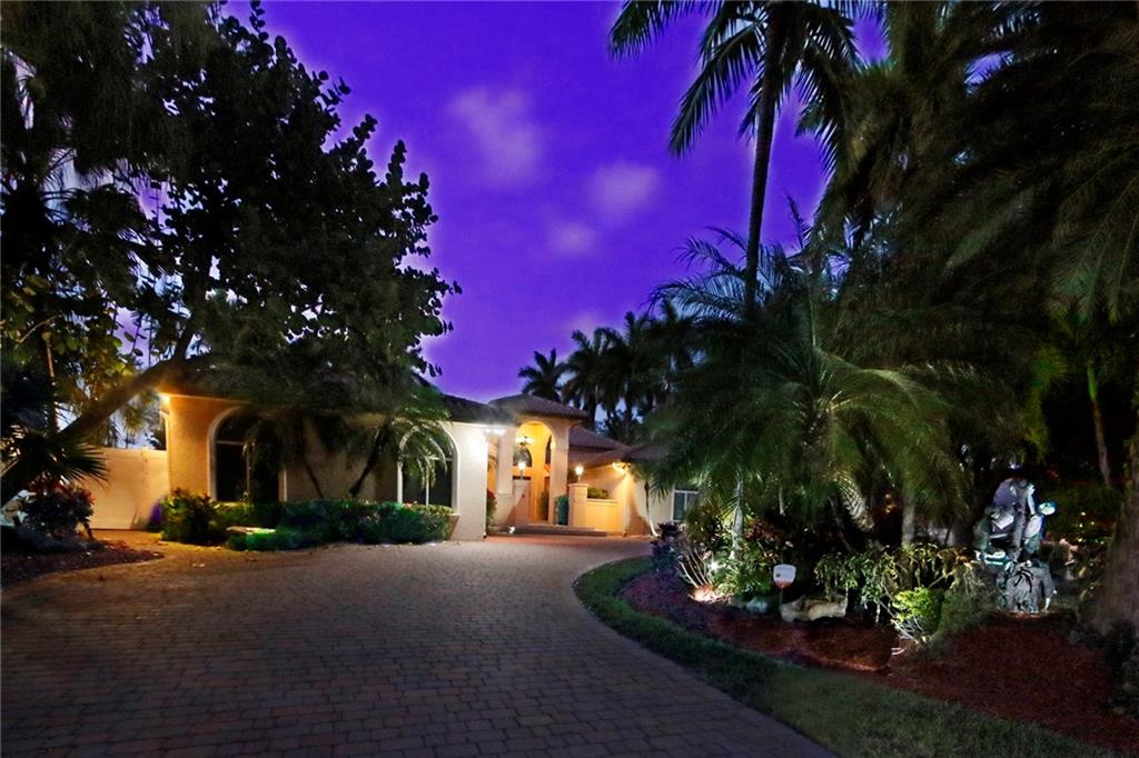 Located on a quiet tree lined street in Hollywood Lakes, elegant 1 story custom estate surrounded by tropical landscaping. Private 1/2+ acre corner property, 100’ water frontage, 75’ deep water dock, w/boat lift a boaters paradise, no fixed bridges. View 360° Virtual Home Walkthrough Tour, just copy paste: https://bit.ly/2vHSX9c or view Drone View: https://bit.ly/2xdQqUu Electric/accordion hurricane shutters, newer AC. Enjoy the magnificent water views from the Loggia surrounding the pool. Outdoor fountains, wet bar, Pizza oven, lounging areas evoke a feeling of resort style living at its best. Living room has a custom bar w/etched glass paintings, Kitchen has 6 Burner commercial grade gas stove, granite counter tops. Large master suite has hard wood floors, Master bath has steam shower