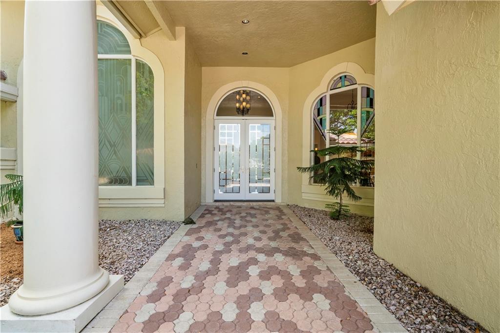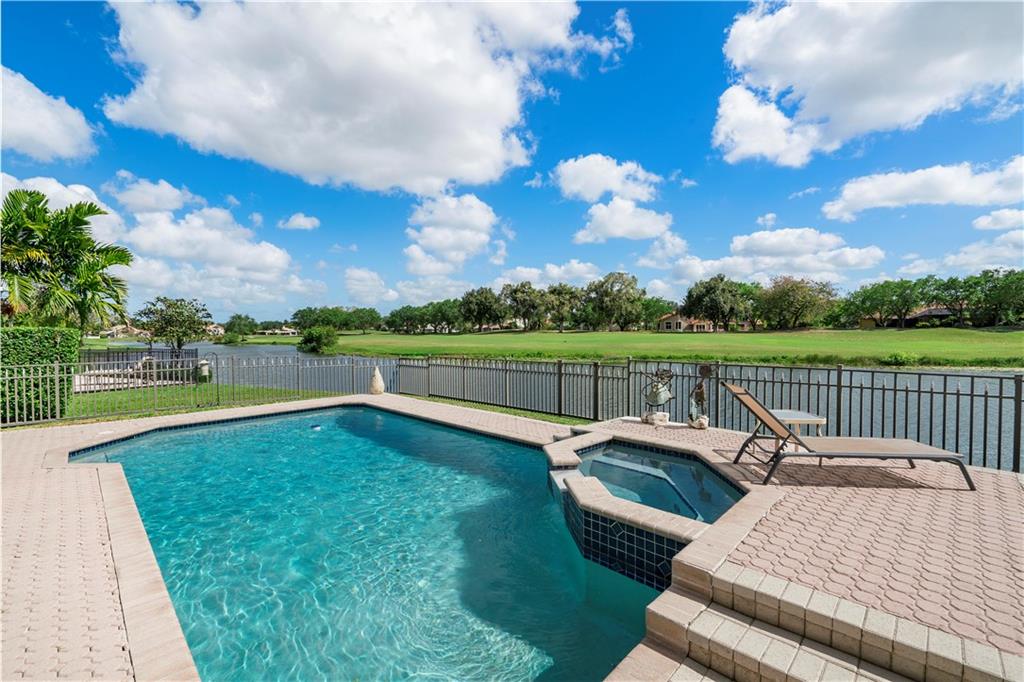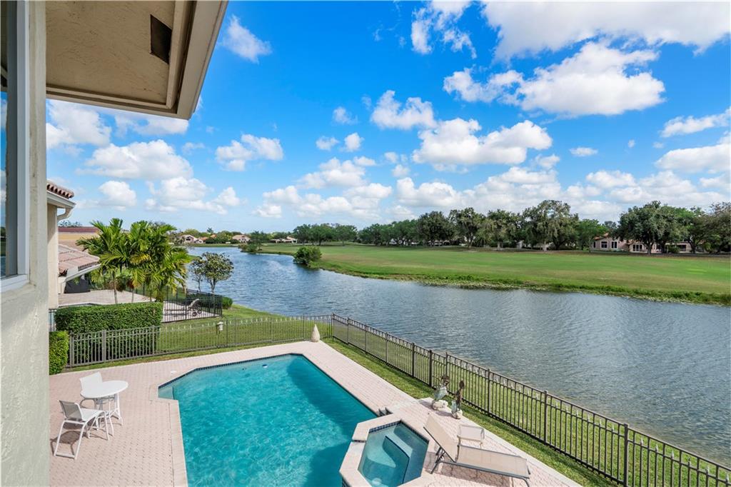 Spectacular 5 Bed 3 full and 2 half bath custom home on wide waterfront lot with panoramic golf course views. Rolling greens and flowing waterway provides million dollar views from living areas, pool, over sized patio and 2nd floor balcony. Chef's Kitchen has granite counters, stainless steel appliances including, 4 Burner Gas Cook-top, side by side refrigerator and more!! All Impact Windows and Doors! (Except 3 Windows in Front). Interior freshly painted. All bathrooms remodeled. Spacious family room with custom entertainment style wet-bar. Gorgeous bamboo wood and lucite staircase to 2nd Floor master suite & large sitting room. Built in closet systems. Neutral marble,bamboo wood and tile floors. Huge circular drive, 3-Car Garage,3-zone A/C. Security & central vac systems.