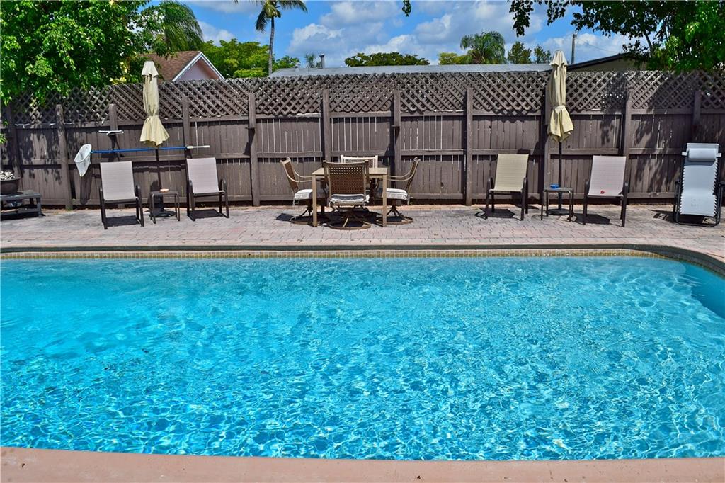 Beautiful remodeled pool home offering open floor plan. The amazing home features an updated & expanded kitchen w/granite countertops, center island/bar top, newer appliances including gas stove, lots of counter & cabinets space & wine rack. Tile throughout living areas w/ wood/laminate flooring in bedrooms. Knockdown textured walls & ceilings (no popcorn). Crown molding. Master bedroom features custom walk-in closet w/ remodeled master bath. This home also features a private backyard paradise offering sparkling pool w/ expanded paver pool deck great from entertaining or relaxing pool side. All impact doors throughout including 3 sets of french doors (no sliders) + accordion hurricane shutter. Other great features included pavered circular driveway & custom block wall. A must see. No HOA