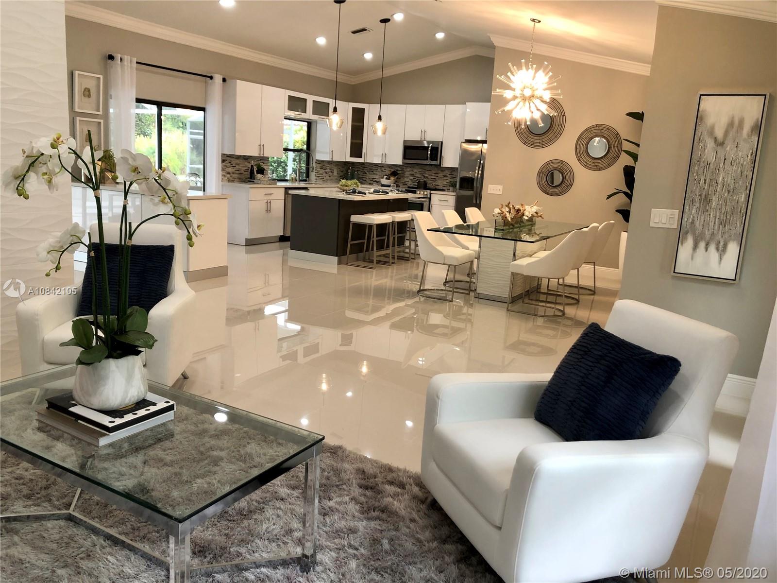 PREMIER PINE RIGE POOL HOME. Beautiful open concept floor plan features new floors, a contemporary eat-in kitchen w/ stainless steel appliances, a huge island w/ soft close drawers and storage on both sides, a built in pantry, recess lighting, a buffet, quartz countertops throughout, crown molding, new washing machine and dryer. The bathrooms feature quartz countertops, LED mirror, and LED state of the art shower heads. New AC and water heater. Perfect home for entertaining. Pool has just been refinished along with cage. All lighting, remote control fans and window treatments stay with the home.Huge back yard with all kinds of fruit trees. Low HOA and no approval necessary. Fantastic family community. Restaurants, shopping, hospitals and expressways all close by. This home is a must see!