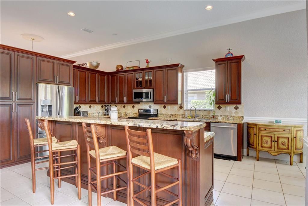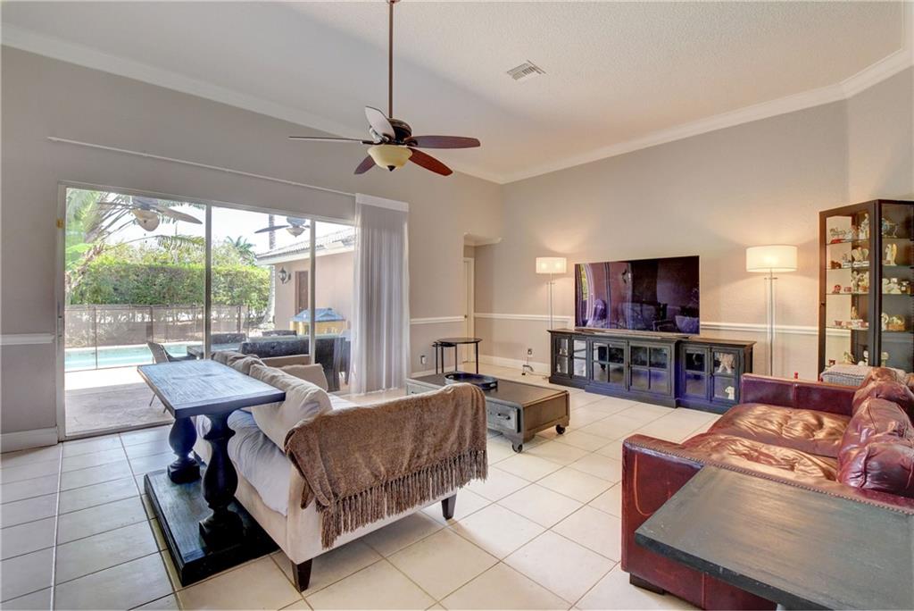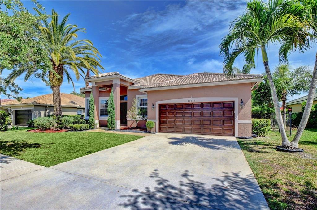 Stunning Coral Springs home in Kensington North. Home features an open, updated, eat-in custom kitchen with Granite counter tops, tumbled marble back splash, under mount sink, 42" real wood Cherry Cabinets, Island breakfast bar, Stainless Steel appliances (double oven). Ceramic tile throughout all the common areas with laminate in the bedrooms. 12' Volume ceilings, Plantation shutters & custom drapes, crown moldings, knockdown walls & ceilings, smart thermostat, and surround sound. Huge master bedroom with tray ceiling and huge California closet. AC and duct work is 3 years old. Built-in, California closets in 3 bedrooms. Front loading washer/dryer under air off of garage. Relaxing patio/pool area with child safety fence. Professionally landscaped with tropical palms. Hurricane panels.