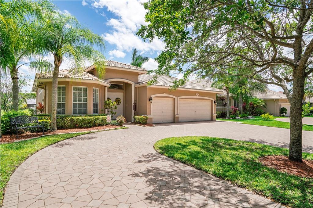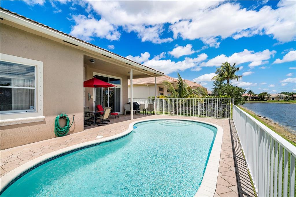 Beautiful and meticulously maintained home in Prestigious Grand Reserve on a waterfront lot. This home could easily be a 4 bdrm, converting the large den w/bay windows which makes it a triple split floor plan...brand new laminate wood floors in all bdrms, 3 full baths, open living area & spacious ,w/volume ceilings, kitchen has granite, double oven and overlooks peaceful pool area & lake, patio is shaded, fenced backyard, sprinklers pull from the lake, circular driveway, plenty of rm in the 3 car gar., can even fit a boat! hurr shutters, Resort style comm w/guard gate, clubhouse, pool, and centrally located.