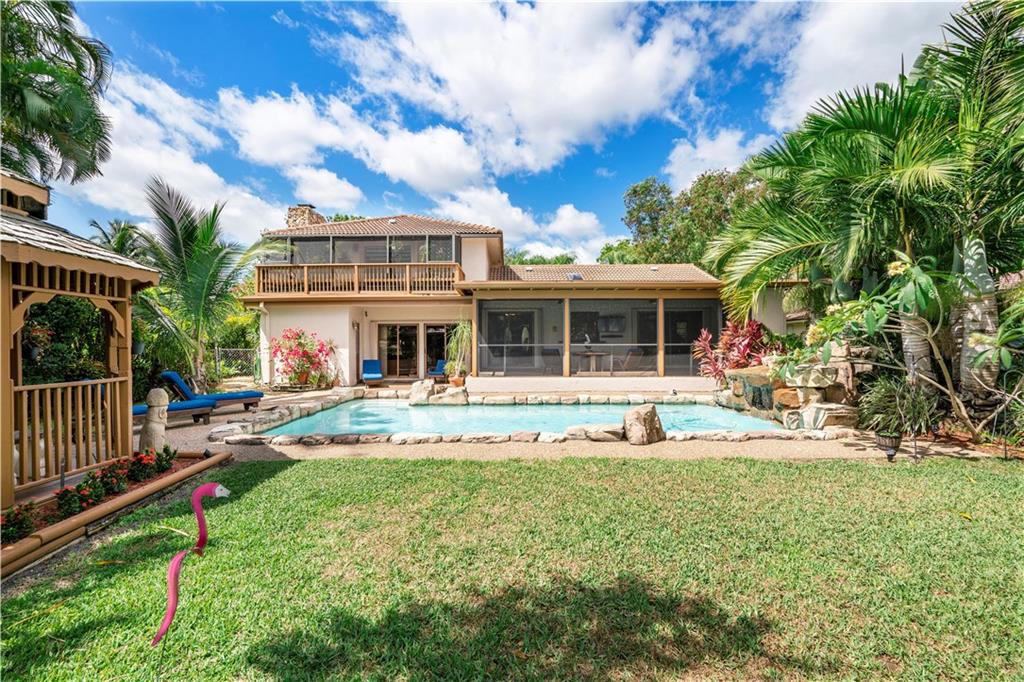 Welcome to your own tropical oasis! Custom-Built 2-Story waterfront home w/ Northern Charm in highly sought after Oak Wood! This 4 BR/3 BA/2 Car Gar, Pool Home on 10,000+ SF lot feat: Expansive Lake Views, 2008 Roof, Newer A/C, Open Floor Plan, Beautiful Wood Vaulted Ceilings, Stone Wood Burning Fire Place, 1 Guest BR/1 BA on 1st Flr. Lrg master suite w/ private balcony overlooking the rock pool/waterfall, lake, & Fenced Backyard on 2nd floor w/ 2 add'l BRs. Remodeled Kitchen w/ SS Appliances, Wood Cabinetry w/ pull-outs, & lots of light. Bathrooms are tastefully redone. Wide-plank wood-look Tile on 1st flr. Carpet on 2nd Flr. Custom Gazebo & Huge covered screen Patio w/ outdoor kitchen offers plenty of room to entertain. Accordion Shutters, Circular DW, lush landscape, NO HOA Fee.
