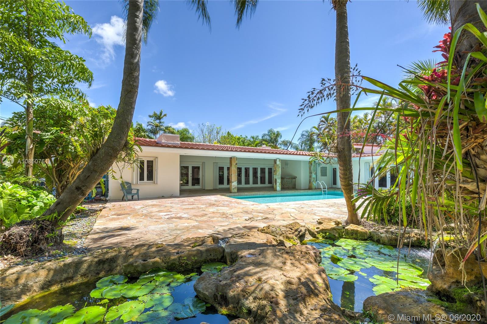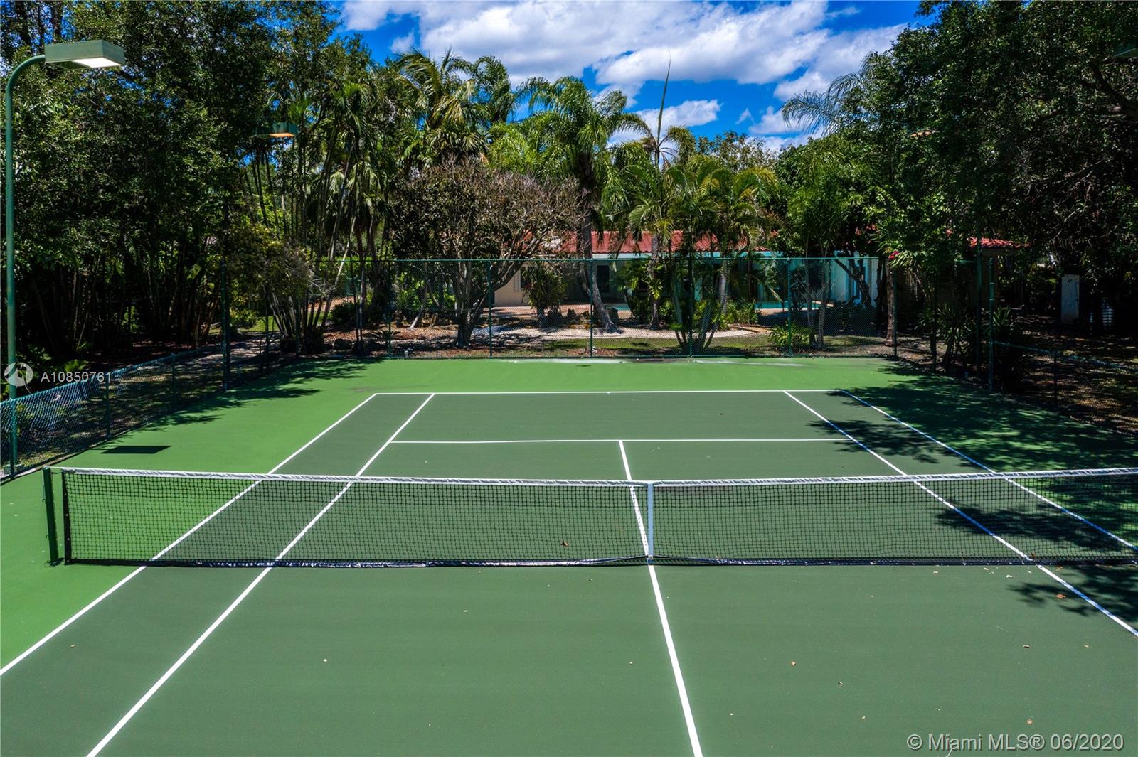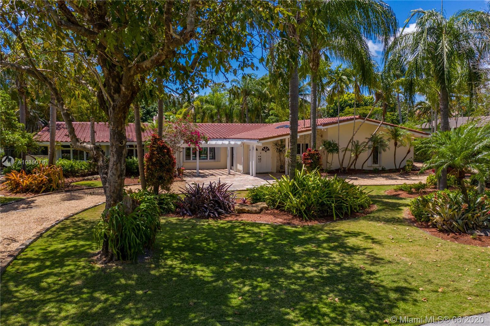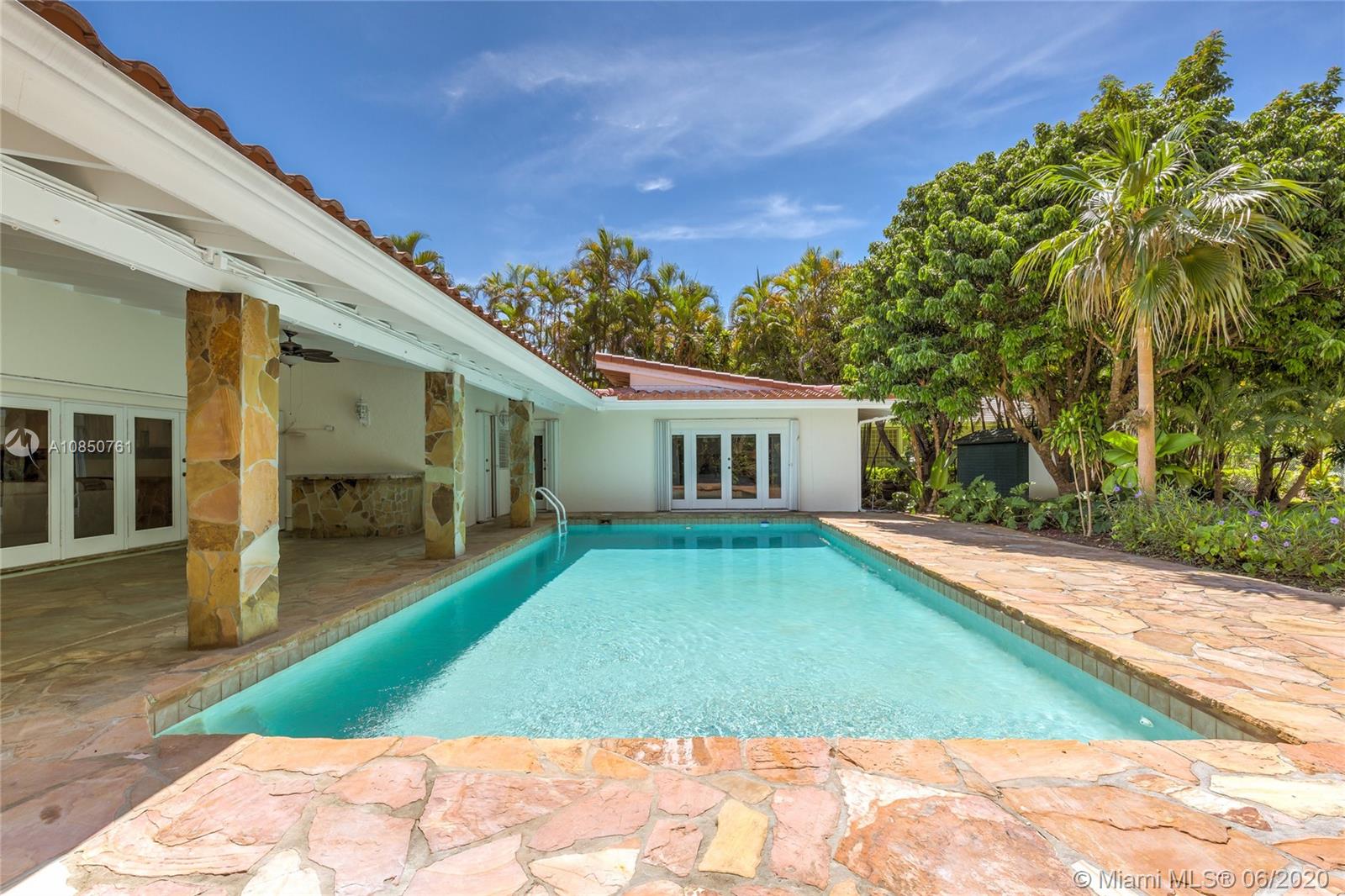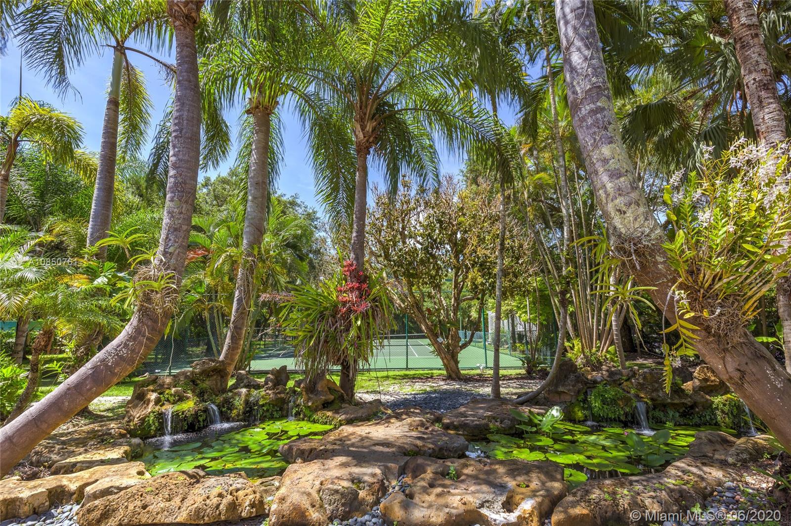 Enjoy a relaxed luxury lifestyle in this Pinecrest family oasis on a deep, private & lushly landscaped acre on a fabulous no-through street. This is the open floor plan you’ve been searching for w effortless flow between living, dining & family rooms & views of the pool & garden thru an expanse of French doors. A fireplace & sky lights add to the warmth & ambiance. This home was fully renovated in 2000 to include new plumbing, stunning travertine floors, an office + great kitchen w granite counters & huge butler’s pantry w extra frig & storage. The split floor plan has 2 masters w custom closets, built-ins and baths w jacuzzi’s. The quintessential entertainer’s dream w/ heated pool, covered patio, lit tennis court, koi pond, wet bar, bbq & fruit trees. New roof 2019, all Pinecrest schools.