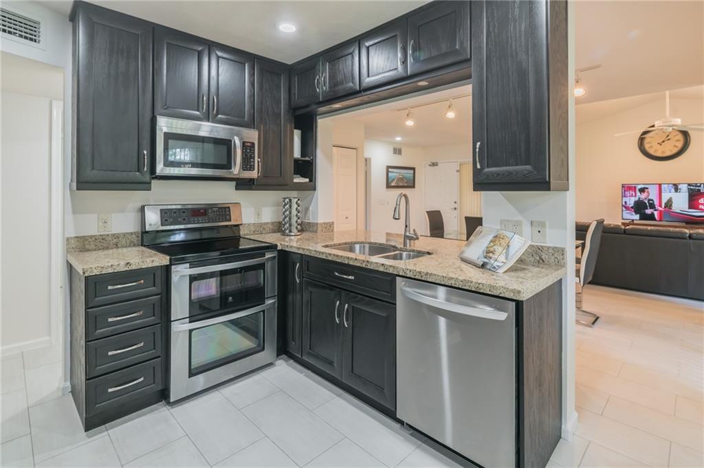 Elegant first floor condo with upgraded bedroom flooring, upgraded bathrooms and fresh paint! Immaculate home with vaulted ceilings, tile flooring, and attached garage. Gorgeous kitchen with stainless appliances, granite counter-tops, double oven, pantry cabinets, and more! Tons of natural light with the many sliding doors and windows. Enjoy coffee on the screened in patio with lovely view of the Banyan Tree. Master bedroom is large with a walk-in closet and master bathroom suite. Great features are accordion shutters, Amazing schools, indoor laundry room, bonus storage closet in garage. Assoc fee covers water, insurance, cable, roof, landscaping and 2 pools. Great location, allows 1 pet under 30lbs.
