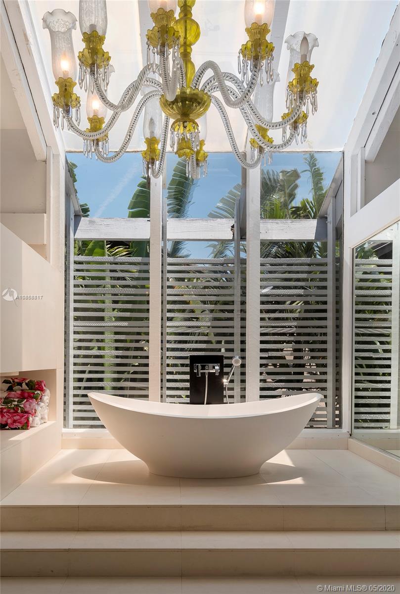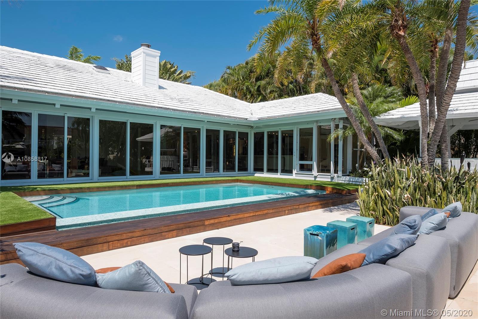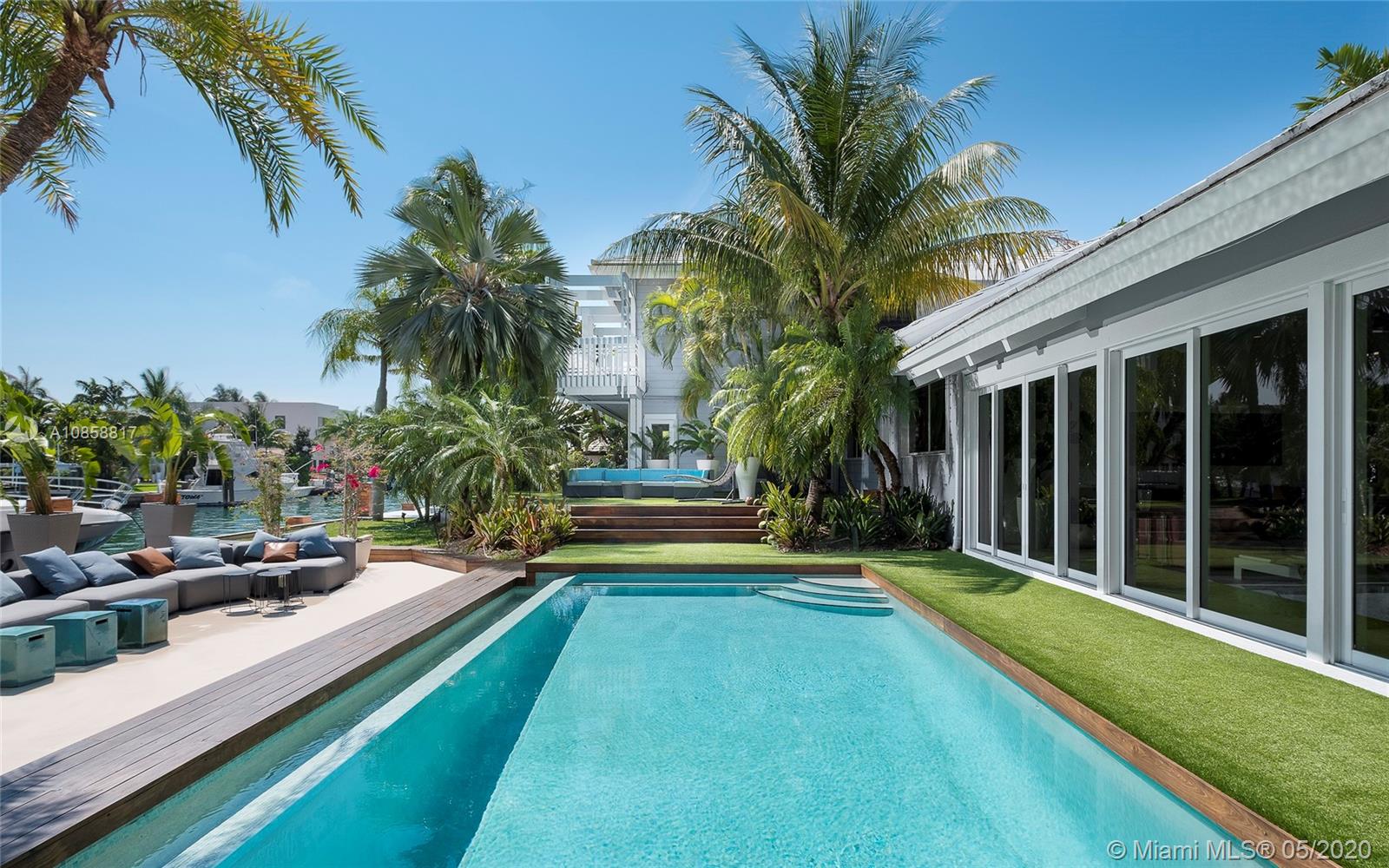 Exceptional St. Barth’s style tropical 18,750 SF double lot estate. Features 6,771 Adj SF area plus professionally designed open layout kitchen/dinning/living provides an ideal lifestyle for large dinner parties, entertaining or lounging w/family. High ceilings & impact sliders bring in natural light making for an incredible indoor/outdoor feel. Private master suite encompasses entire 2nd level & features high beamed ceilings, living area, office & 2 walk-in closets. Luxurious limestone master bath w/free-standing deep soaking tub, glass shower & access to huge private terrace offering open water bay views. Exterior features infinity edge pool, covered bbq/bar pavilion, curated landscaping, 150 FT dock w/no fixed bridges & direct ocean access. Minutes to Bal Harbour shops & beach.