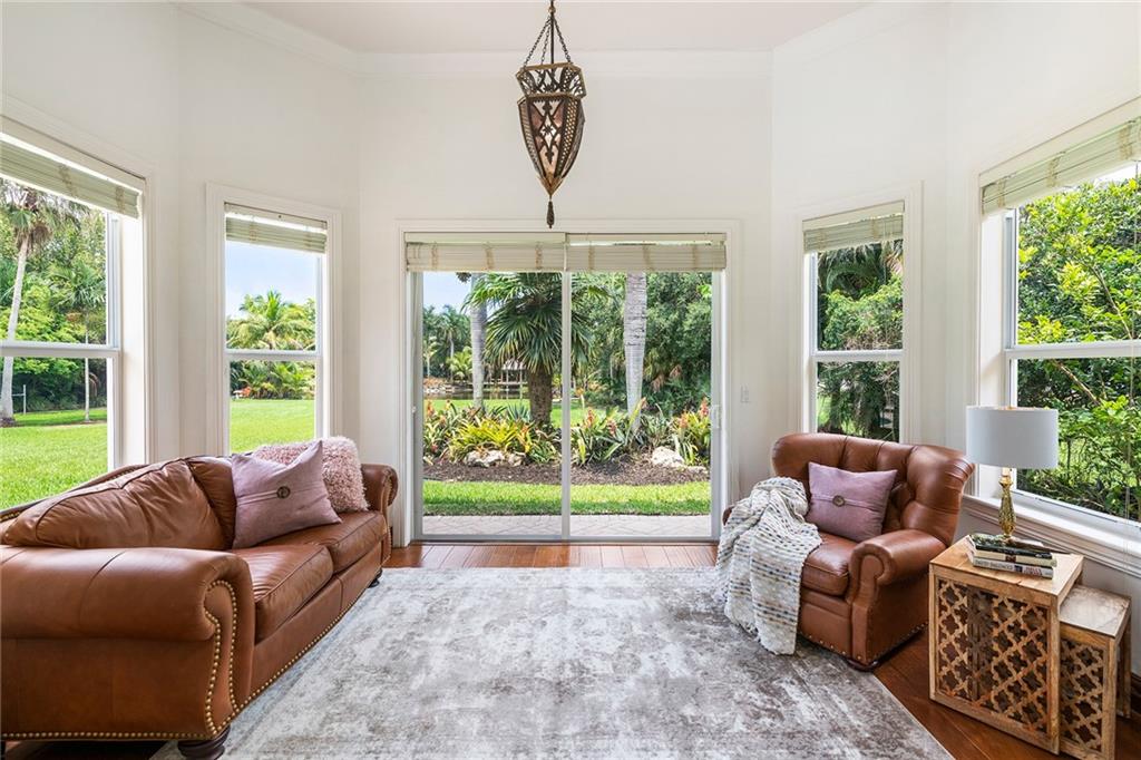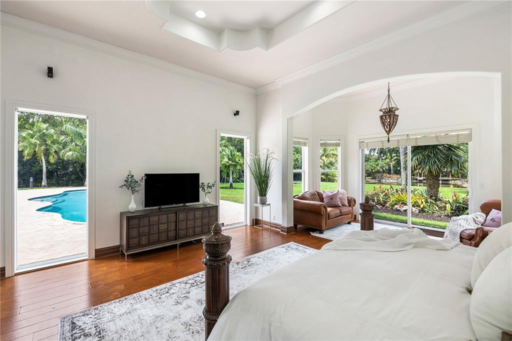 One of a kind custom built private estate in prestigious Sunshine Ranches. Updated kitchen w/white quartz counters. High volume ceilings & expansive windows offer indoor outdoor living.Fully fenced & electric gates. Seven bedrooms and a separate office, 6.5 bathrooms. Upgraded features: hurricane impact windows,generator with 500 gallon below ground propane tank, 2 tankless water heaters,, reverse osmosis water purifier, security system, 50FT pool,summer kitchen, fully paved driveways, latter access to attic, 4 car garage & Exceptional property drainage system. An impressive fully stocked private lake for fishing w/ pier style dock & Tiki hut. With over 150K in landscaping the lush mature foliage make this home truly unique. Original owner meticulously maintained. Beautiful move in ready.