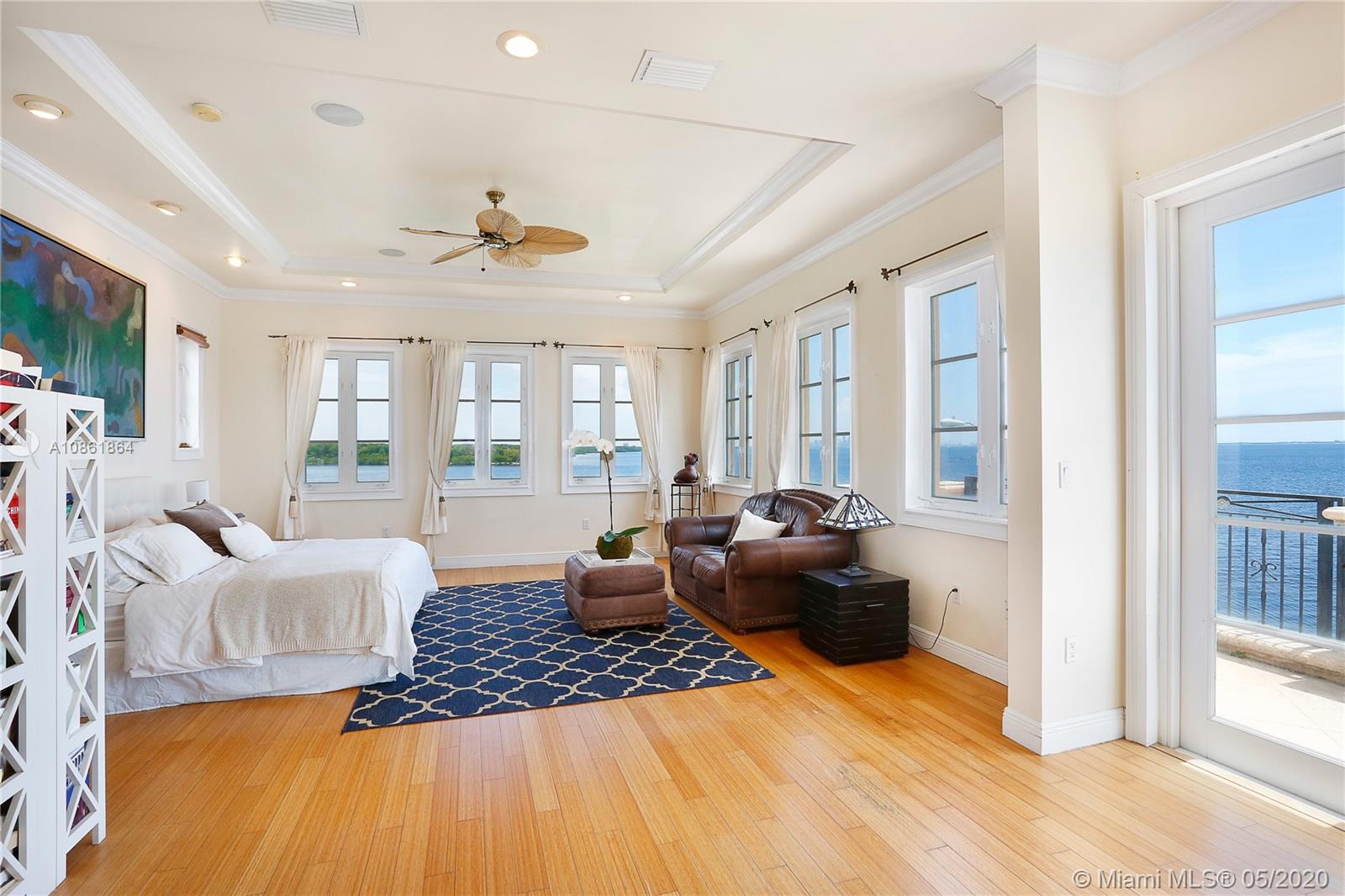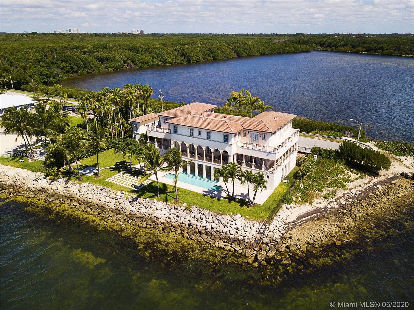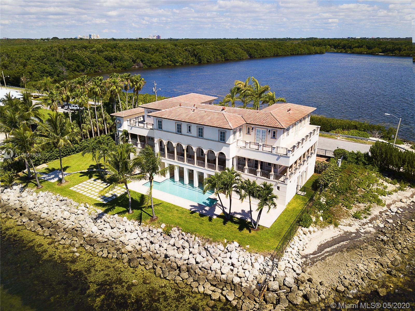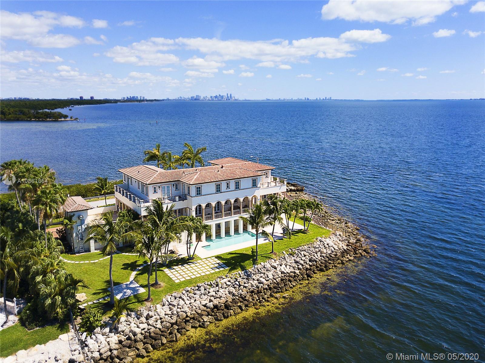 Stunning Palladian style bay front estate commanding the best location in the gated community of Gables By The Sea. Breath-taking views of the bay from the spacious living areas, gourmet eat-in kitchen with top quality appliances, split floor plan with a private balcony access from each bedroom, impressive master suite, marble, wood and slate flooring, open roof top terrace, heated pool, lush landscaping and 2 car garage. New owner can build a dock at this property.