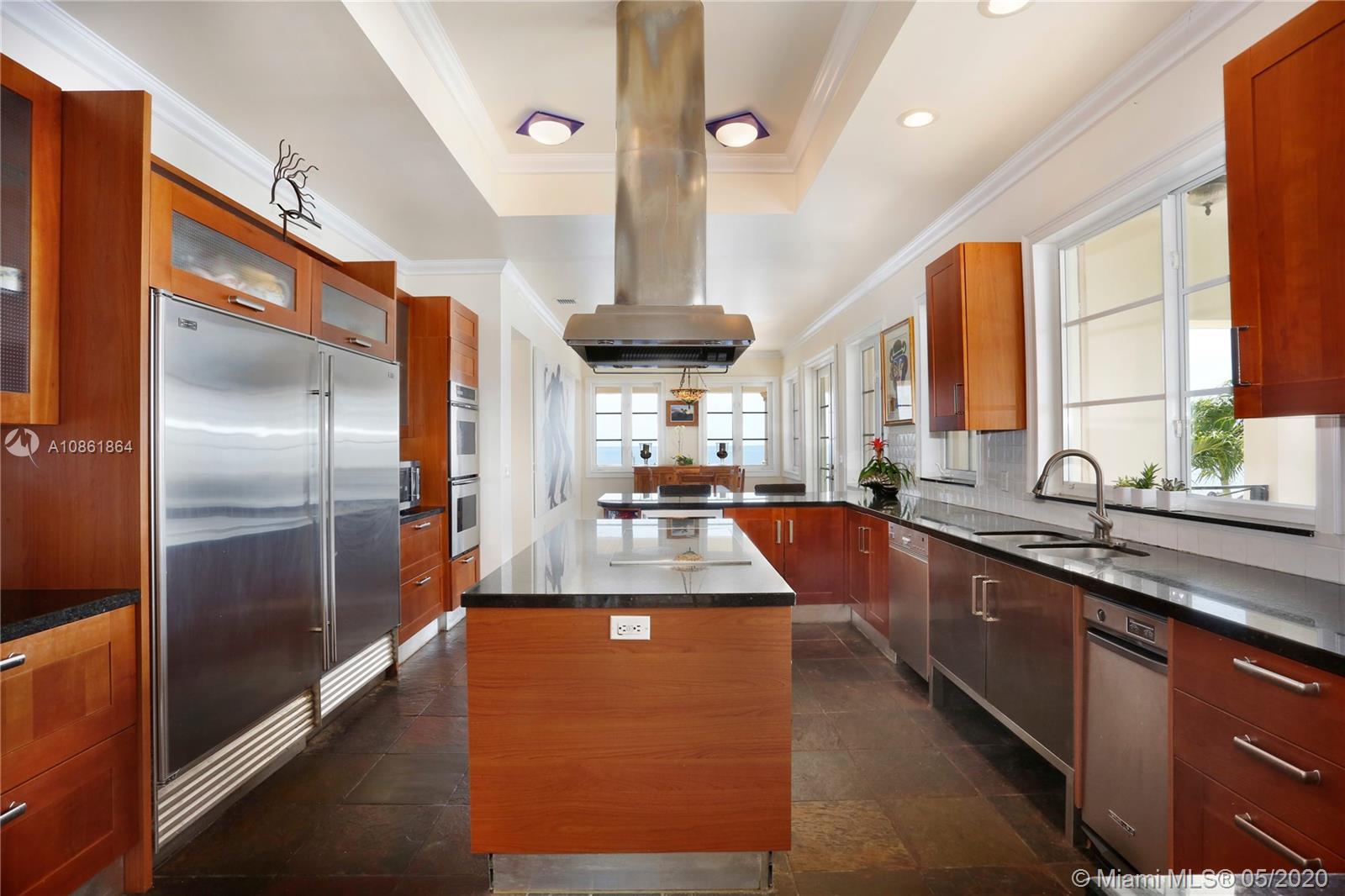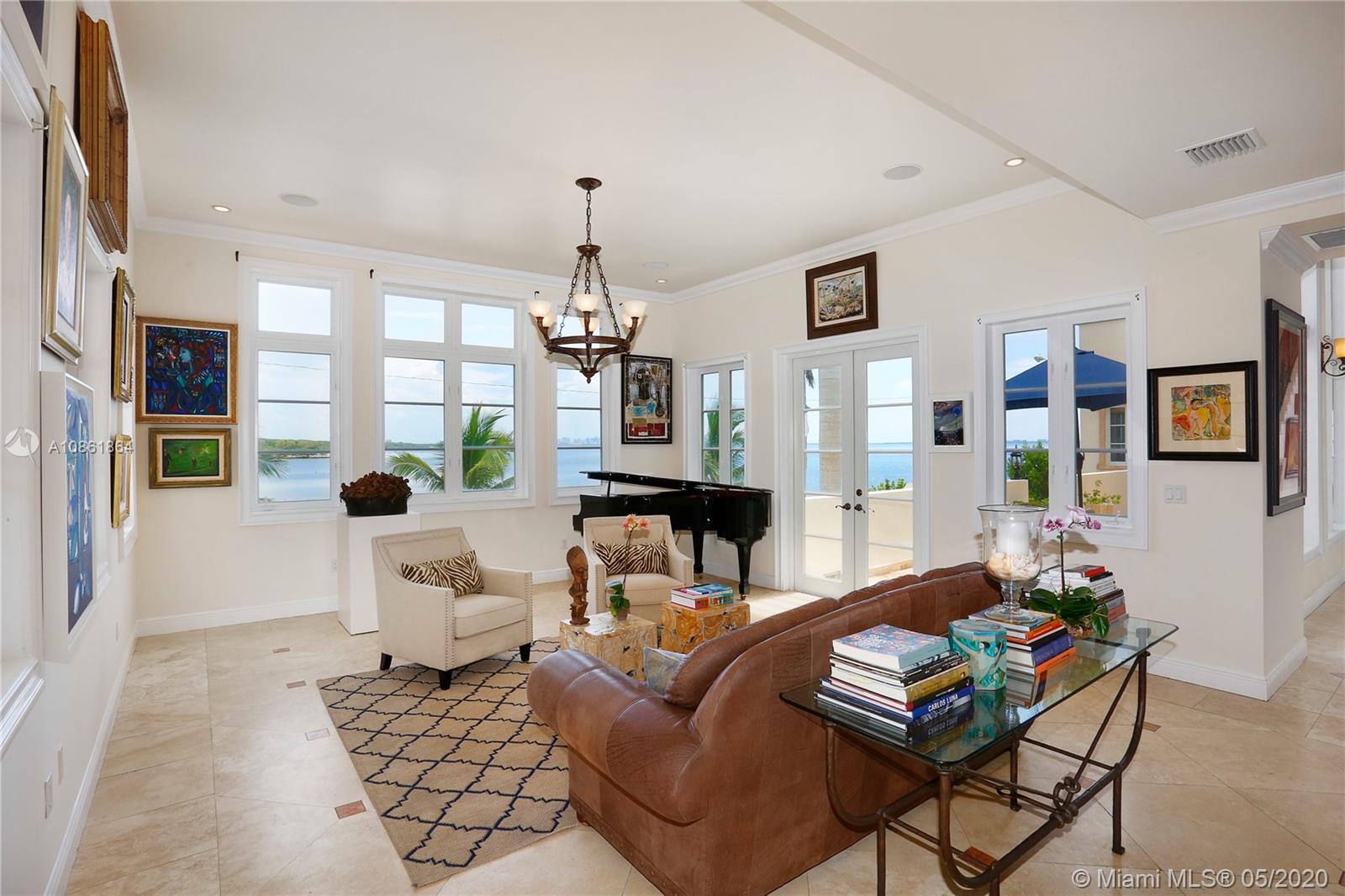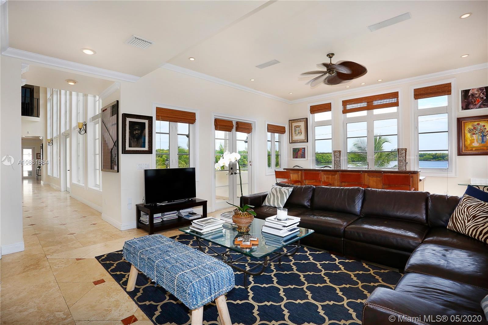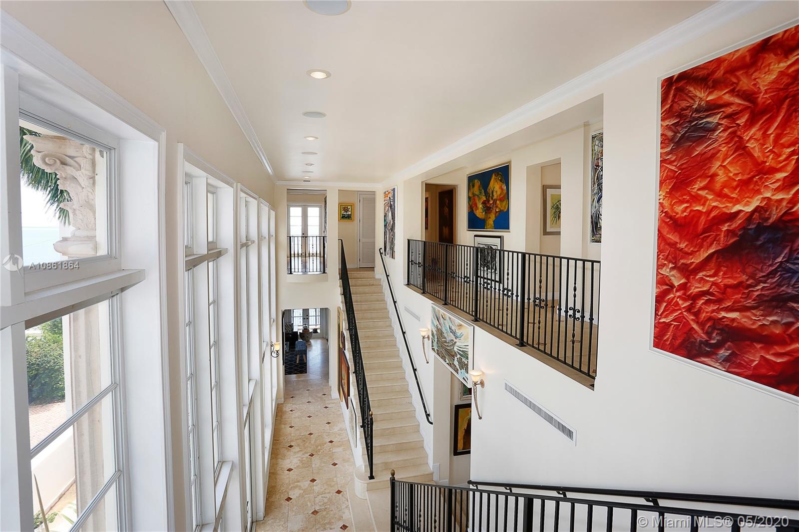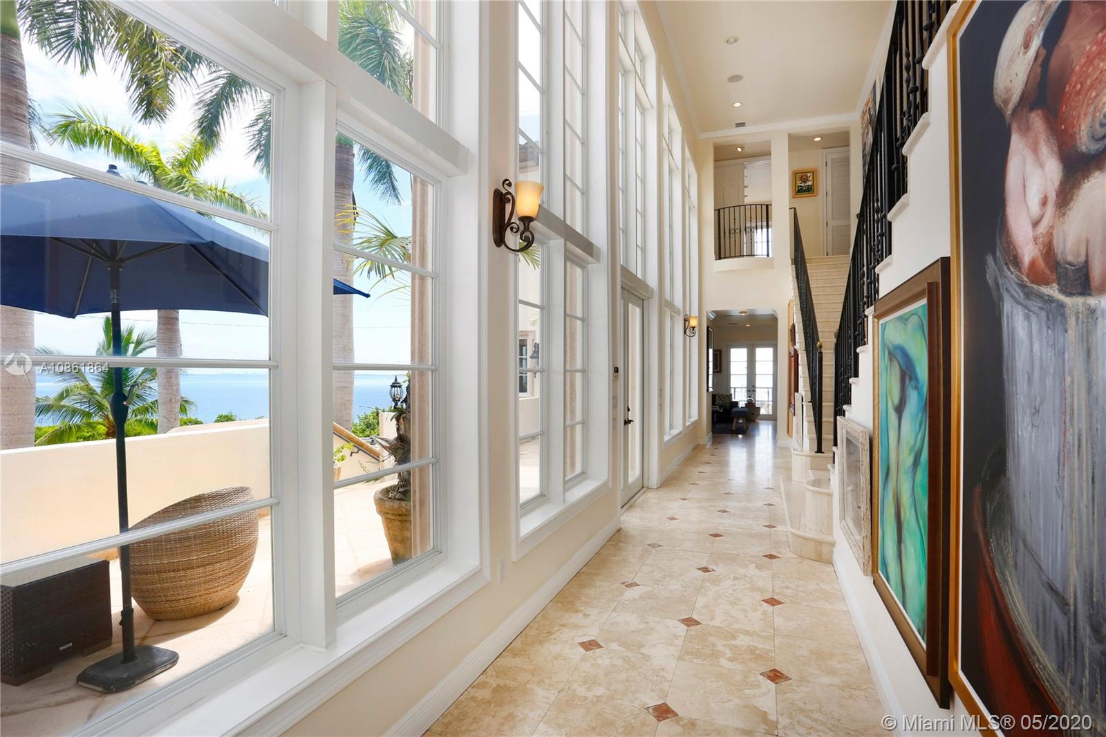 Stunning Palladian style bay front estate commanding the best location in the gated community of Gables By The Sea. Breath-taking views of the bay from the spacious living areas, gourmet eat-in kitchen with top quality appliances, split floor plan with a private balcony access from each bedroom, impressive master suite, marble, wood and slate flooring, open roof top terrace, heated pool, lush landscaping and 2 car garage. New owner can build a dock at this property.