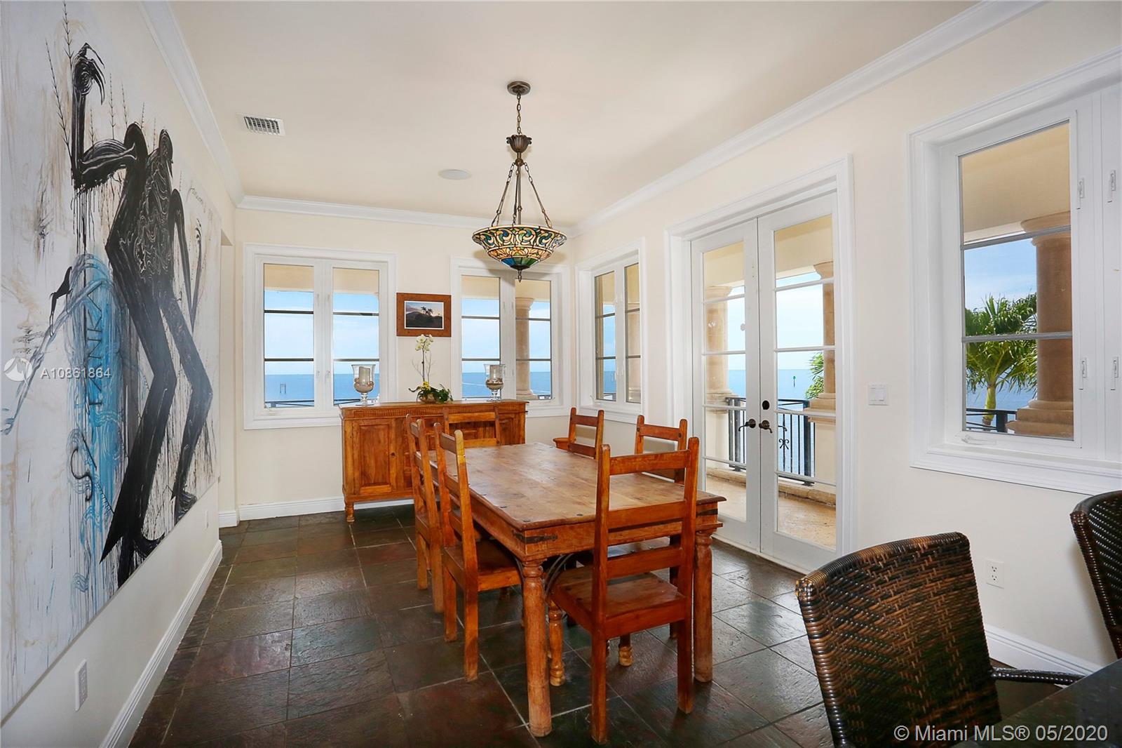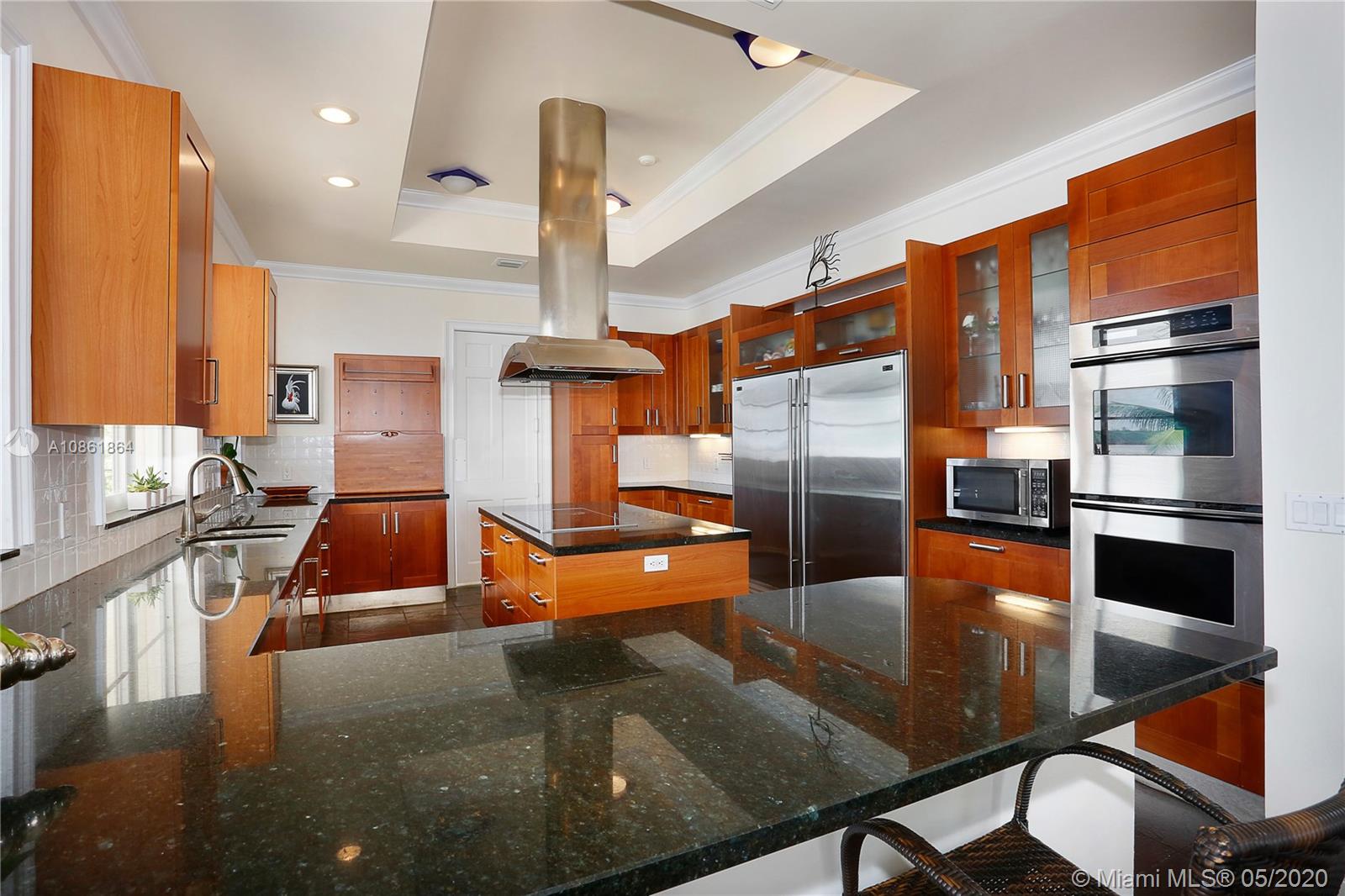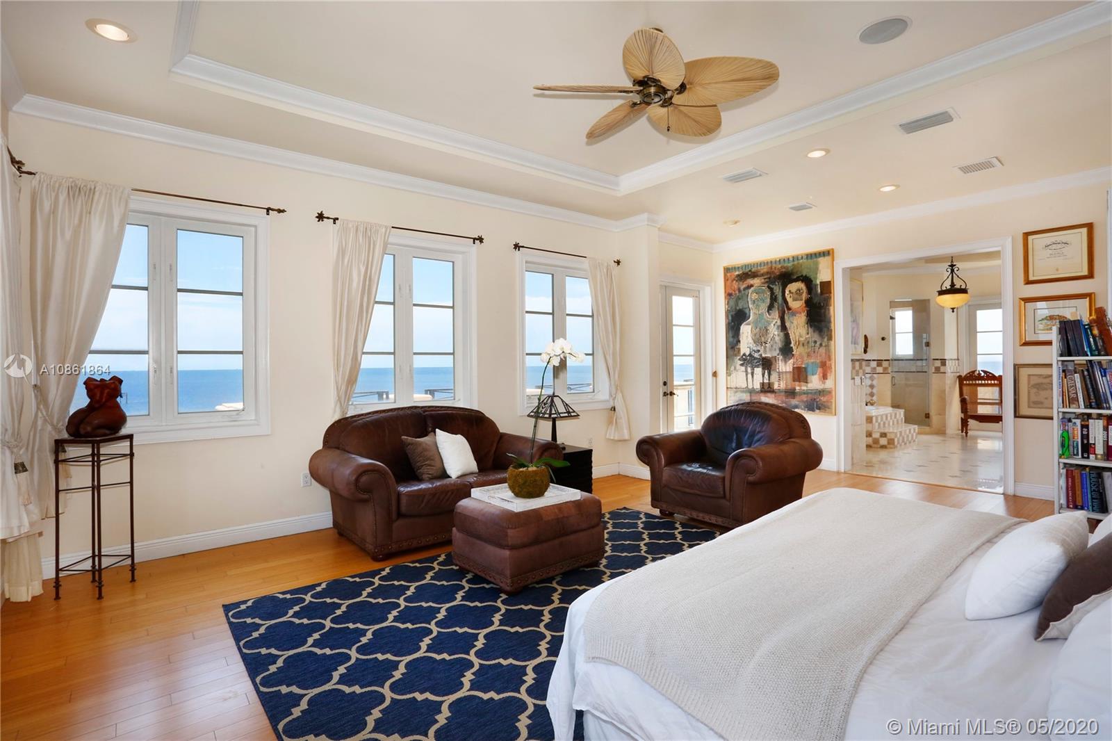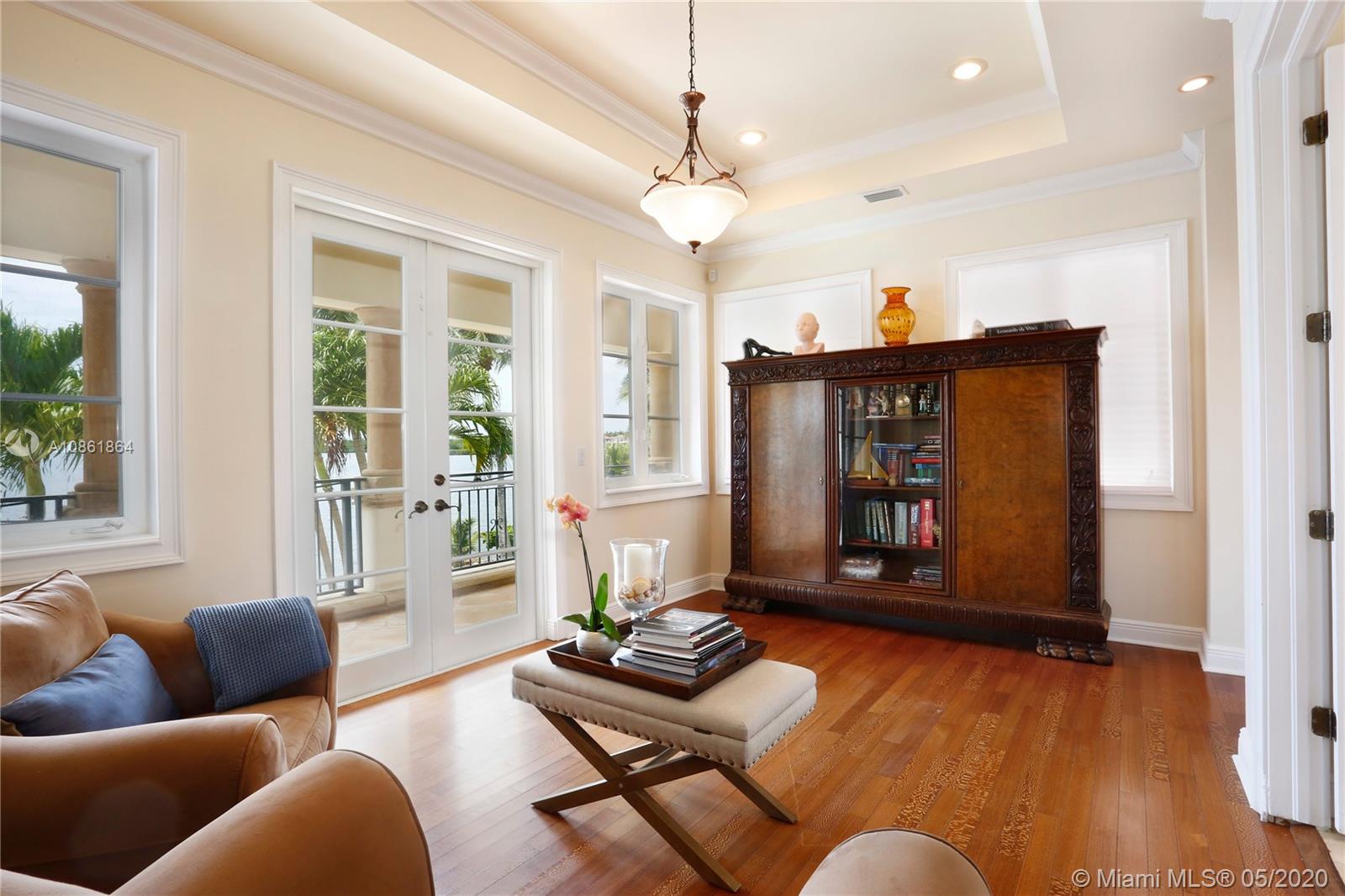 Stunning Palladian style bay front estate commanding the best location in the gated community of Gables By The Sea. Breath-taking views of the bay from the spacious living areas, gourmet eat-in kitchen with top quality appliances, split floor plan with a private balcony access from each bedroom, impressive master suite, marble, wood and slate flooring, open roof top terrace, heated pool, lush landscaping and 2 car garage. New owner can build a dock at this property.