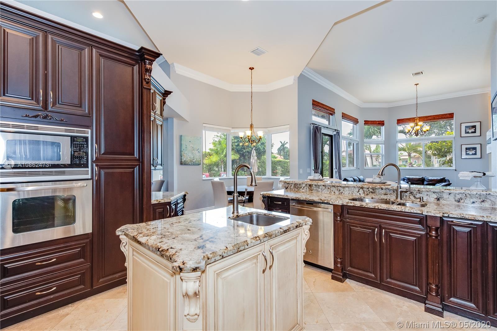 WOW! FULLY UPGRADED, contemporary 5 true bedrooms ~ 3000 sf under air with an open flowing floor plan, high ceilings & lots of natural light. Kitchen is a true chef's dream w/ upgraded custom wood cabinetry, gorgeous granite & high-end stainless package. Elegant foyer leads to triple split bedroom plan w/ 4 updated full baths. Beautiful marble, hardwoods, crown moldings, central vac & built in cabinetry including a contemporary backlit bar area. Step outside to a true Florida paradise with 11,471 sf BIG lot, covered patio, sparkling pool, fruit trees, breezy water AND lush green golf course views. Terrific hurricane protection and insurance discounts with full IMPACT WINDOWS & DOORS including garage. Wonderful gated community w/ an excellent central Davie location. BEST SCHOOLS!