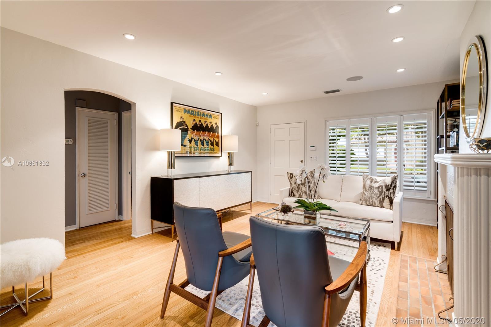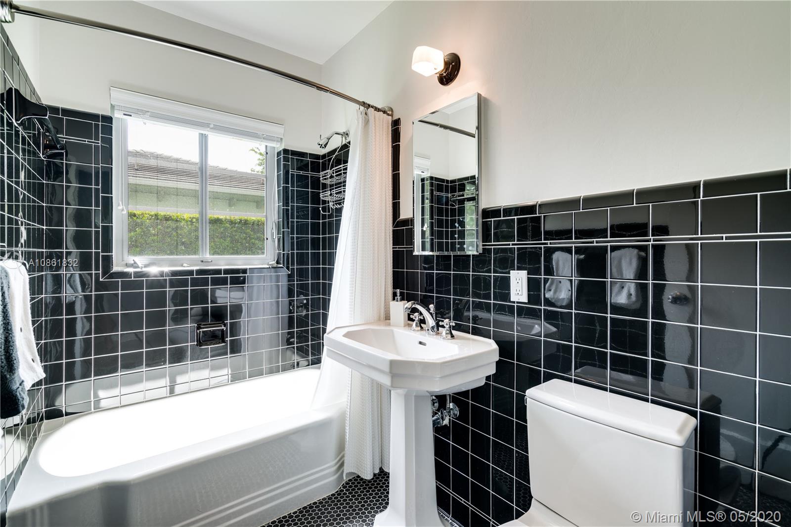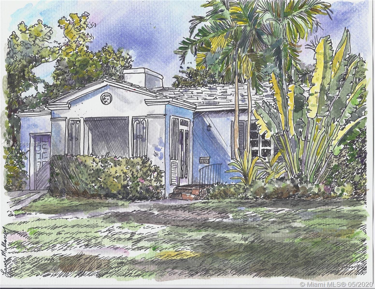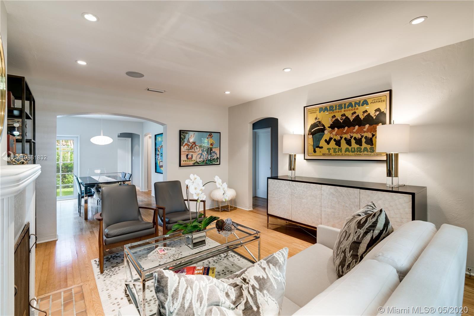 Landmark 1941 Deco-Modern bungalow by celebrated architect H. George Fink; expanded, restored, and updated to perfection in 2016. Ideal location next to delightful pocket park & short walk or trolley ride to downtown Gables or Merrick Park. Features gourmet kitchen, dining room, butler's pantry, wine cooler, wet bar, laundry room, new master suite, custom cabinetry, original wood-burning fireplace, new plumbing, new electric, new lighting and speakers, new AC, new tankless gas water heater, new sprinklers, new well & new septic tank, gorgeous hardwood floors, new impact windows & doors, plus garage. Ad valorem tax-exempt on a portion of real estate taxes through 2025. This completely turn-key 3/2 mid-century jewel offers charm galore with cutting-edge updates. 1910 Total Area, Lot 6250 sq'