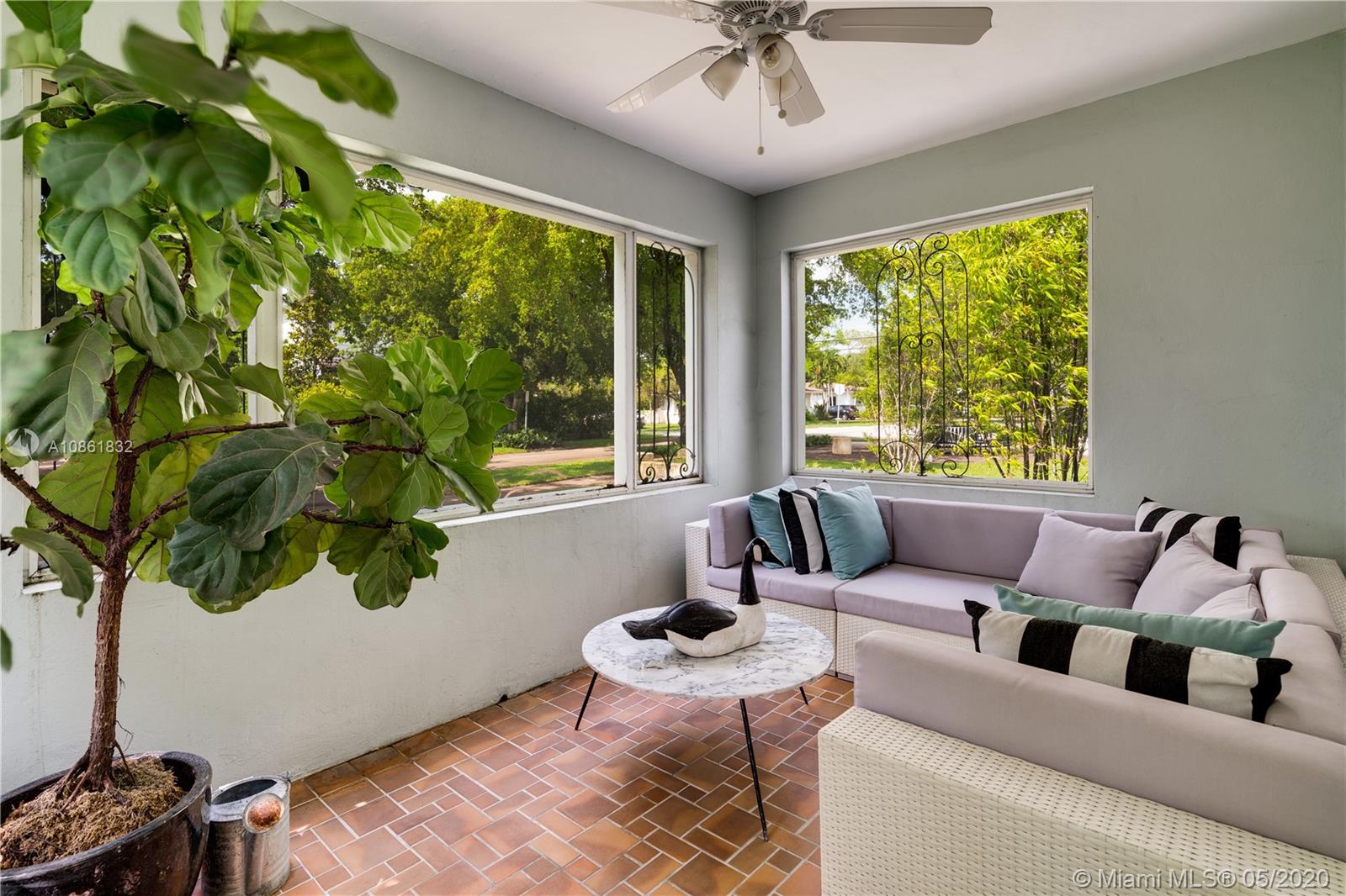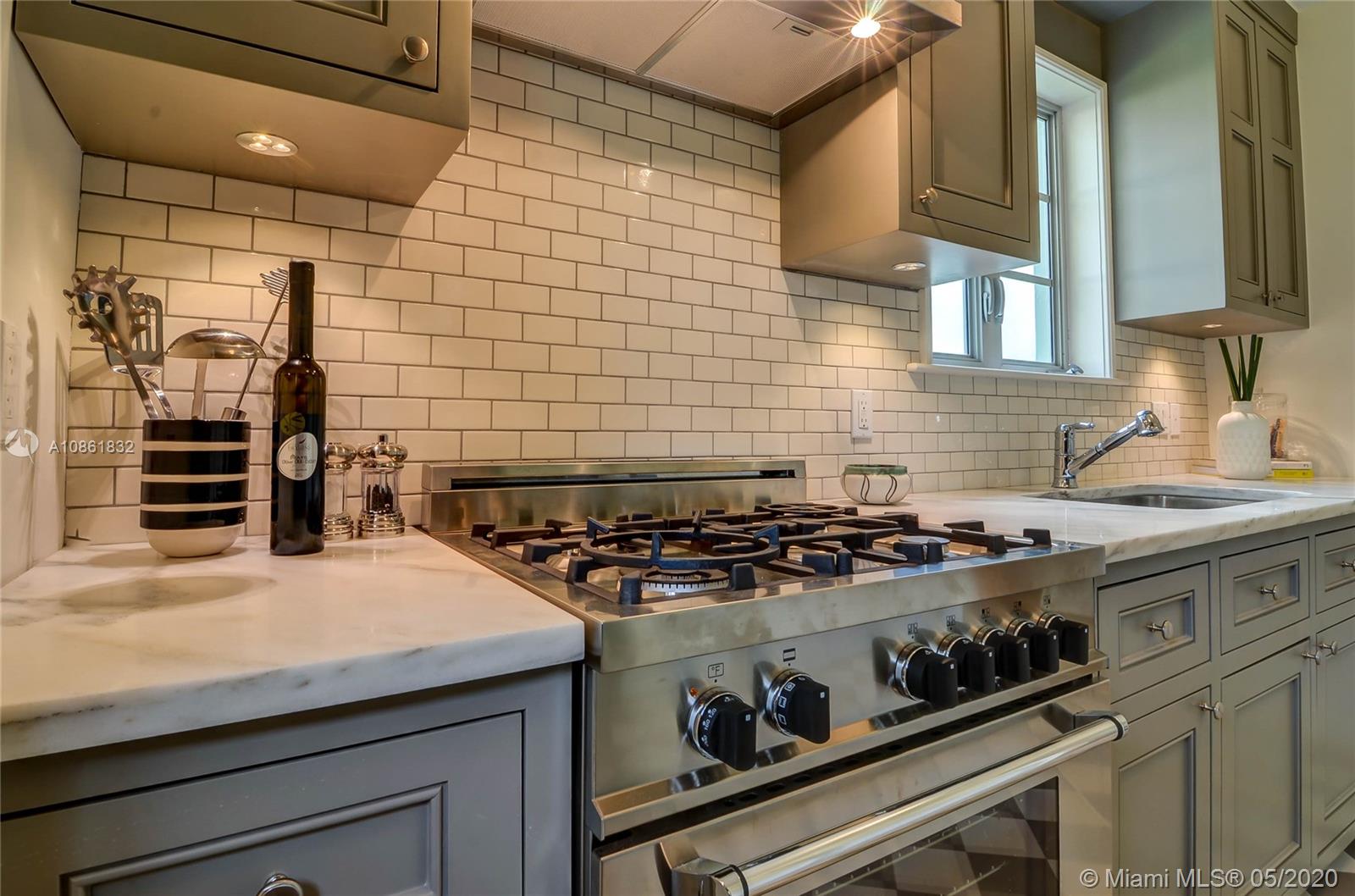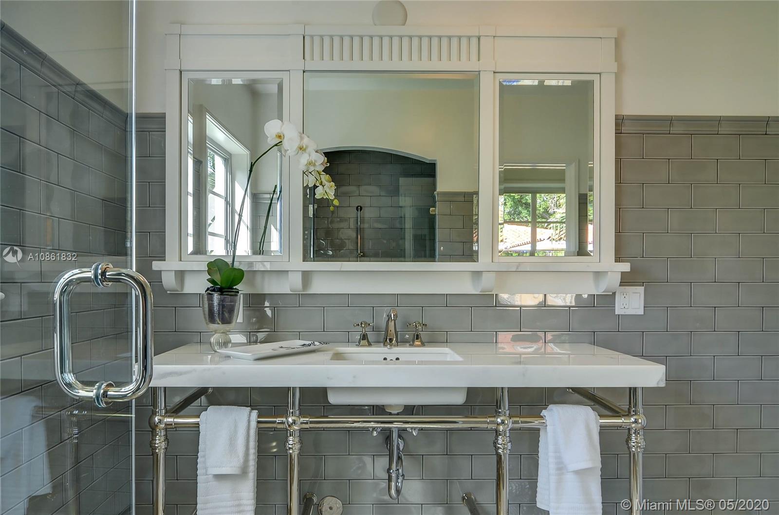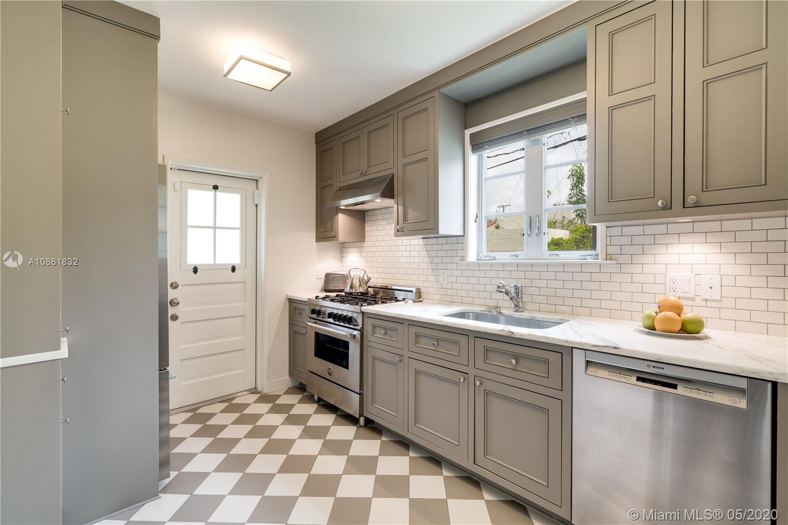 Landmark 1941 Deco-Modern bungalow by celebrated architect H. George Fink; expanded, restored, and updated to perfection in 2016. Ideal location next to delightful pocket park & short walk or trolley ride to downtown Gables or Merrick Park. Features gourmet kitchen, dining room, butler's pantry, wine cooler, wet bar, laundry room, new master suite, custom cabinetry, original wood-burning fireplace, new plumbing, new electric, new lighting and speakers, new AC, new tankless gas water heater, new sprinklers, new well & new septic tank, gorgeous hardwood floors, new impact windows & doors, plus garage. Ad valorem tax-exempt on a portion of real estate taxes through 2025. This completely turn-key 3/2 mid-century jewel offers charm galore with cutting-edge updates. 1910 Total Area, Lot 6250 sq'