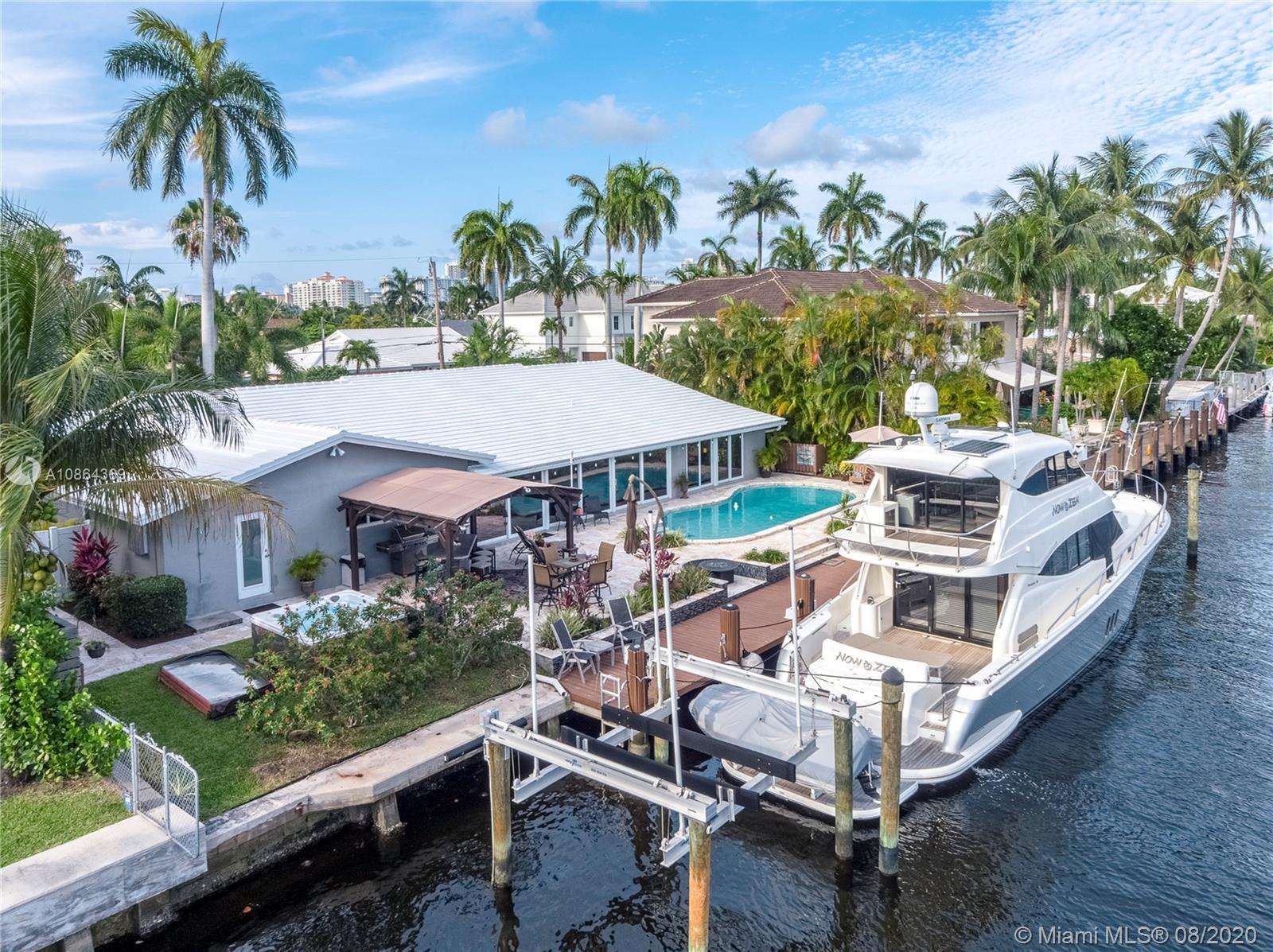 Proudly presenting, this lovely 3 bedroom / 3bath / 3 car garage waterfront pool home on one of the prettiest streets in Coral Ridge. 100ft of waterfront on desirable South side of the canal. Boat lift for up to 13k lbs! This beautiful home features a large open floor plan with water views from almost every room! Recently renovated, from the floor to the ceiling. Beautiful floors, new kitchen/appliances, bathrooms, dock, marble travertine patio, impact windows, doors, and emergency generator are just some of this homes features. Perfect for entertainment, the backyard has fire pit, gazebo, outdoor bar, hot tub, large pool, and dock with utilities. The three bays in the garage are perfect for anyone who has multiple cars or toys!