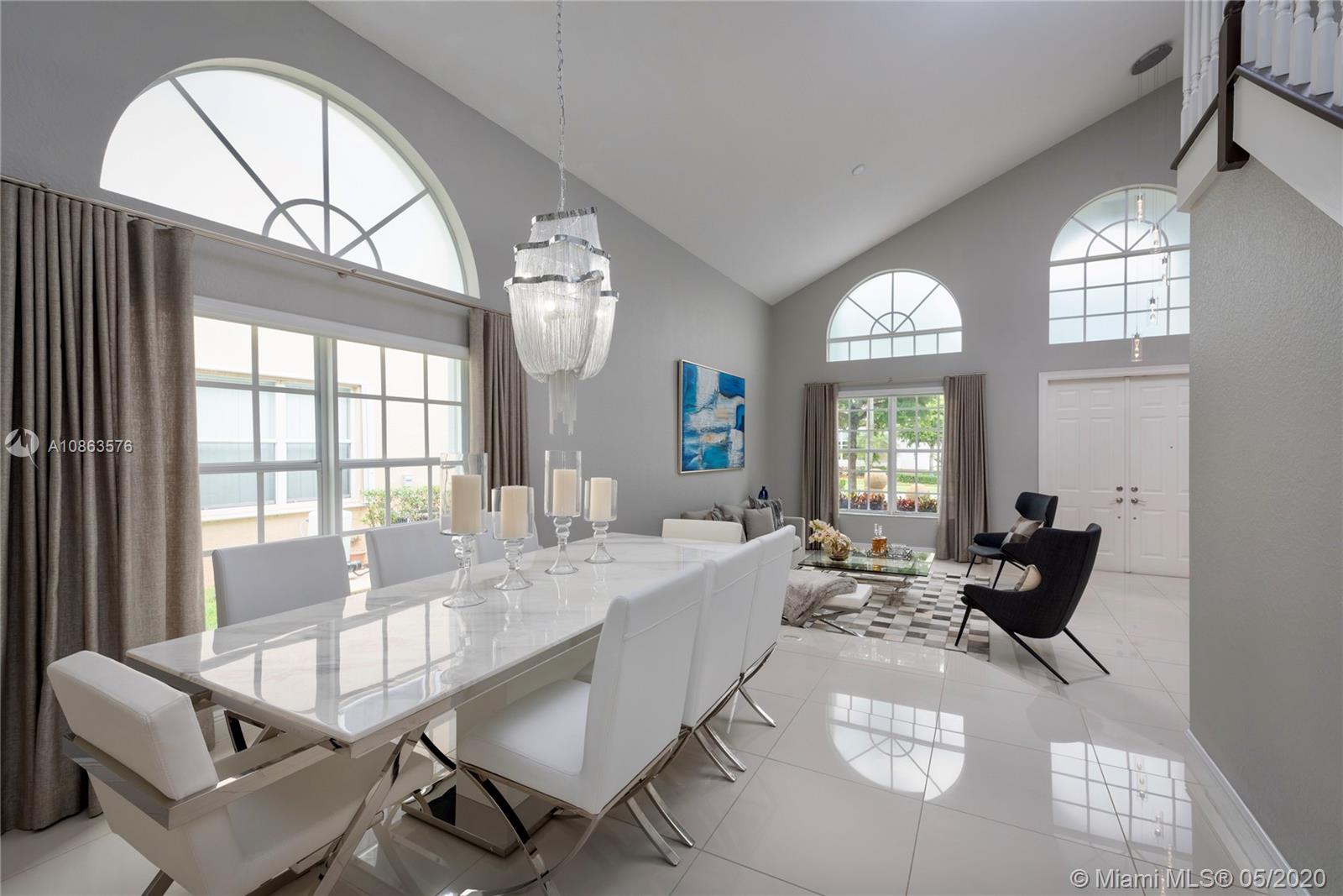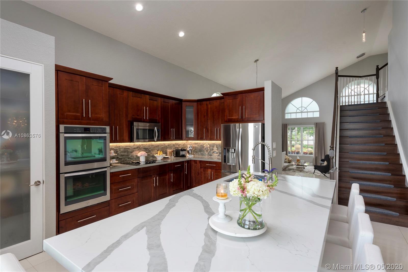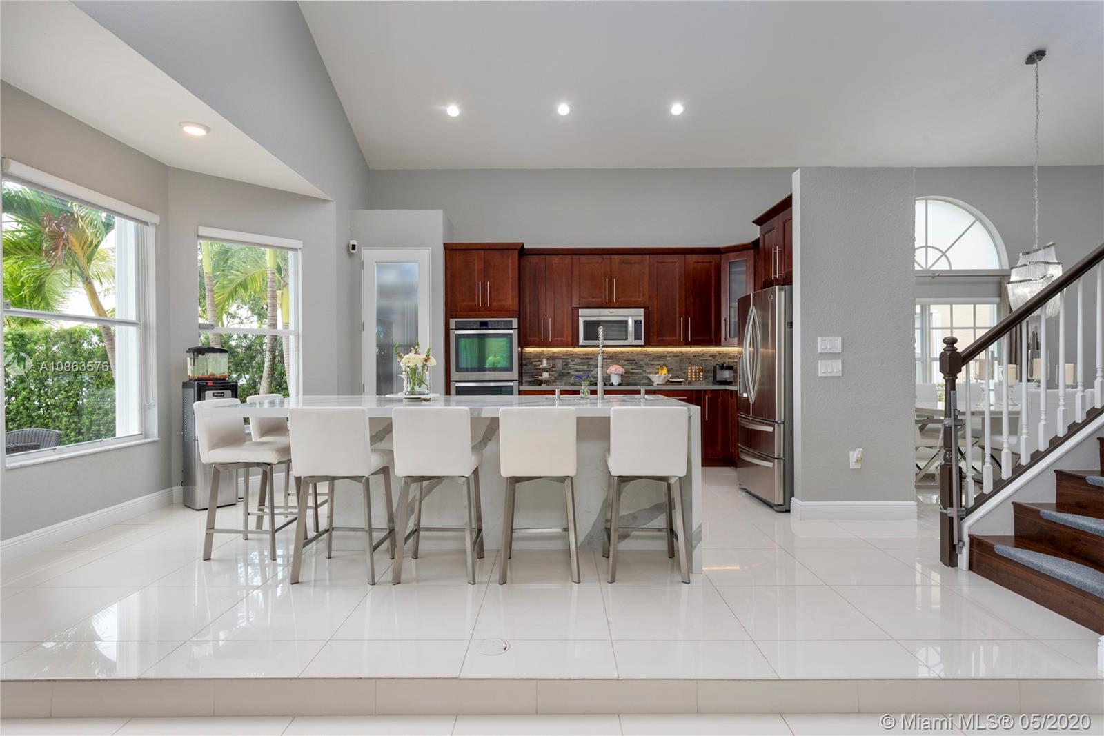 Welcome to Casa Bella Vista! Breathtaking lake views & amazing sunsets create the most tranquil setting for this stunning residence. Upon entering you are captivated by the natural light, flow & high ceilings. The home was remodeled with a modern flare. The kitchen has SS appliances, glass mosaic backsplash, Quartz counters, oversized island with waterfall edge. The luxurious master retreat includes a sitting area & balcony offering expansive lake views. Master bath with porcelain tile, modern fixtures, huge walk-in shower, dual shower heads, his & her areas, quartz topped zebra wood vanities & custom closets. New roof & accordion shutters. Backyard boasts a covered patio, freeform pool & 375 mile-wide breathtaking lake views making this a wonderful family home for entertaining.