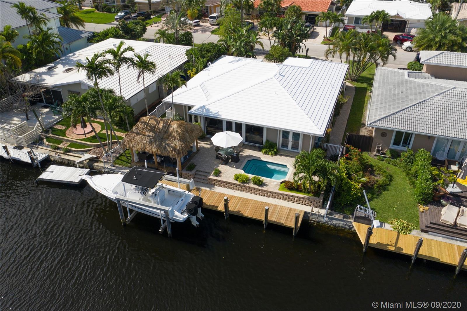 Charming, updated, Pompano Isles 3 B/R, 3 Bath, waterfront Home. Very social neighborhood! Deep water Dock, 350 yards to Intracoastal, no fixed bridges! Split Floor Plan. Views of Pool & Water from almost every room! Chefs Kitchen, bar seating, lots of glass, Entertainers dream! Expanded cabinetry, 2 under counter wine coolers. Large Master Suite with laundry room, twin shower & walk in closet with built in drawers, shelves and hanger system. Updated Tikki Hut used as outside room for entertaining, dinner parties and watching sports. New dock, boat lift, garage, bi fold hurricane shutters. You can easily walk to restaurants and shopping.