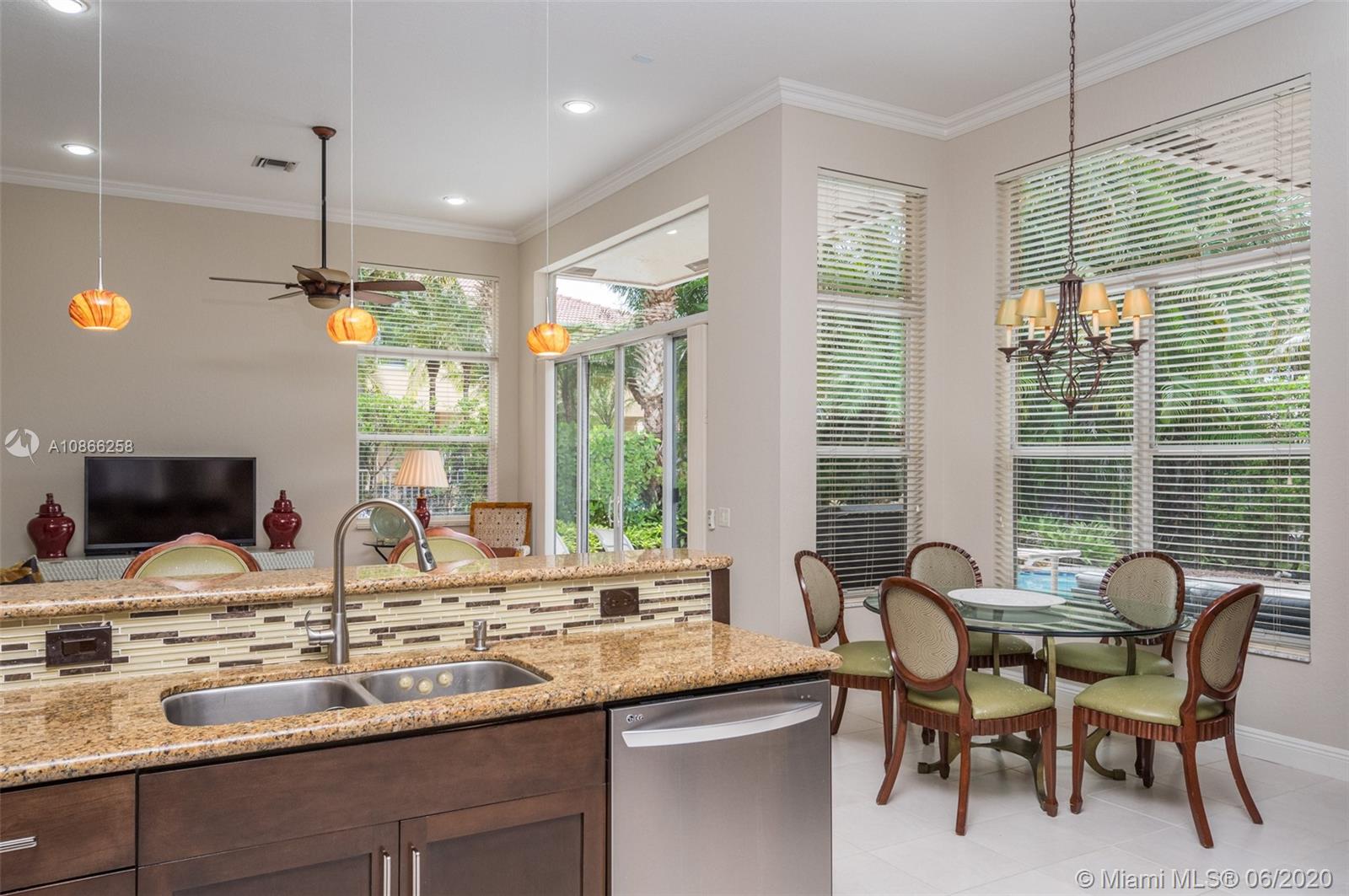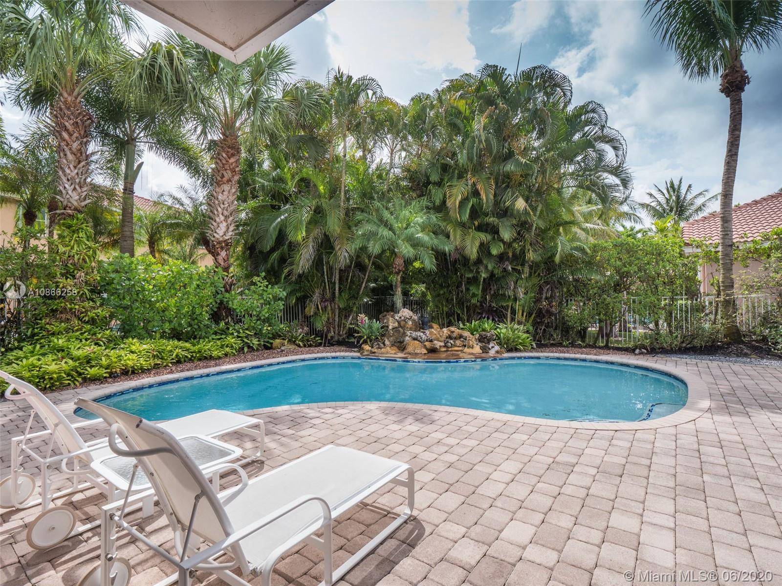 Custom home tucked on a royal palm tree-lined street with a circular paver driveway. Popular triple split floorplan Shows like a decorator model. New Kitchen with top of the line Stainless Steel appliances, granite countertops. Neutral stone tile throughout living areas. Extensive crown moldings, coffered ceilings, stunning custom window treatments, and drapes. All bathrooms renovated. Private fenced yard with a resort-style freeform pool and paver patio. Lush tropical landscaping. Walk to community park. Hurricane protection. Front door impact from Honduras.