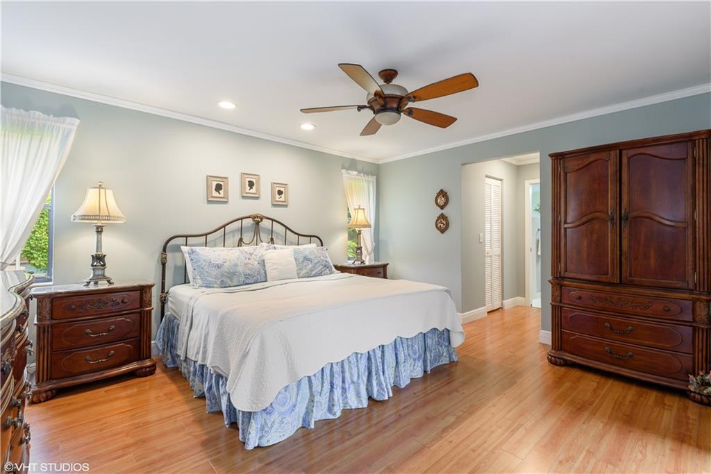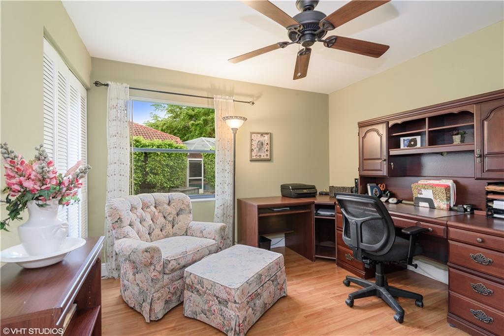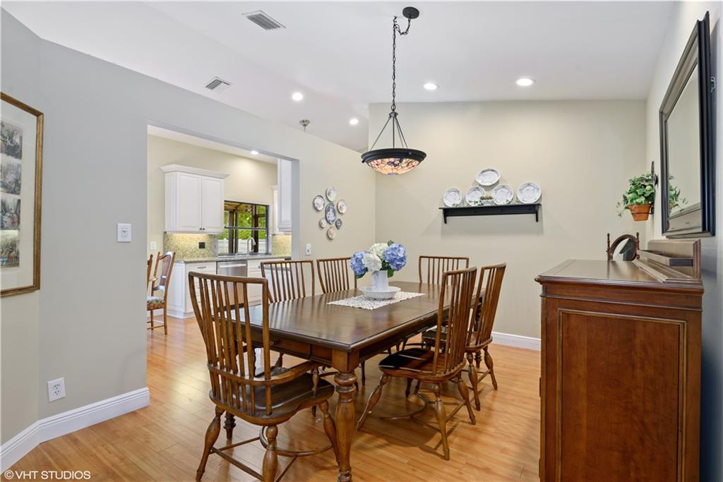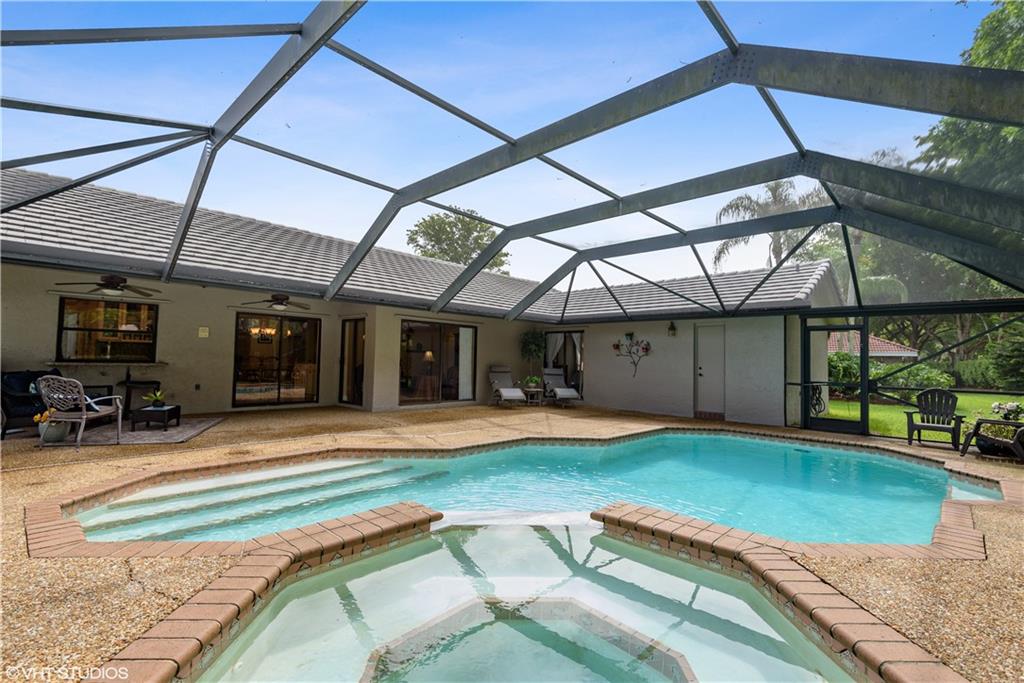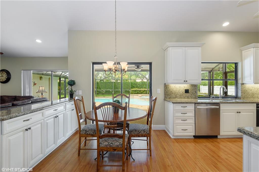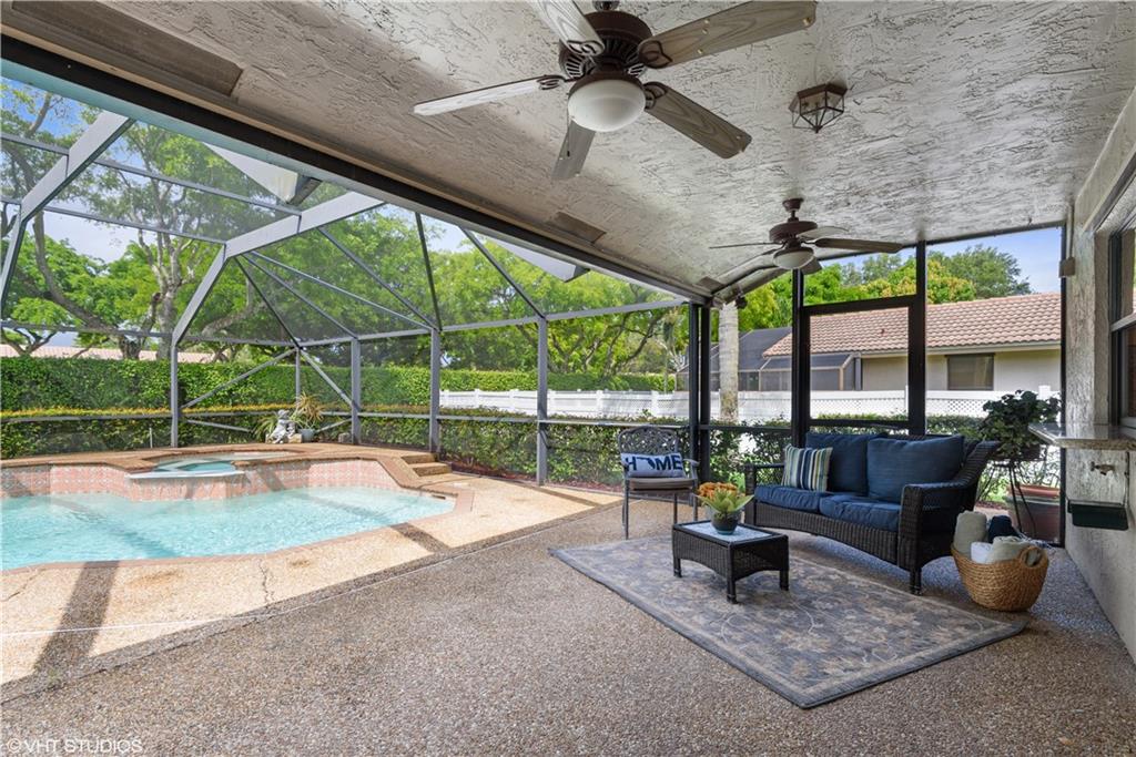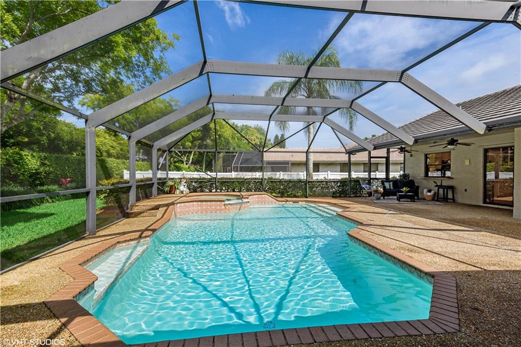 Updated Pine Ridge Beauty features open kitchen-family room in the heart of the home. Updated Kitchen has Granite counter tops & back splash, undermount sink and cabinet lighting, 42" White Custom Cabinets, w/ granite pass through, & Stainless Steel appliances ('14). Bamboo Laminate Flooring throughout the common areas and bedrooms. Updated Bathrooms with new mirrors, lights, cabinet vanities with dual sinks with neutral tile floors. Smooth vaulted ceilings and walls, Vertical Blinds throughout. A/C (11/13), Flat Tile Roof (13 years new), 40gal HWT (08). Waterfall spa into pool on Screened (’06) patio, with child safety fence. Indoor laundry room with washer/dryer included. Hurricane panels for safety. One year home warranty plan available for buyer's peace of mind. Low HOA $60/mo. As Is!