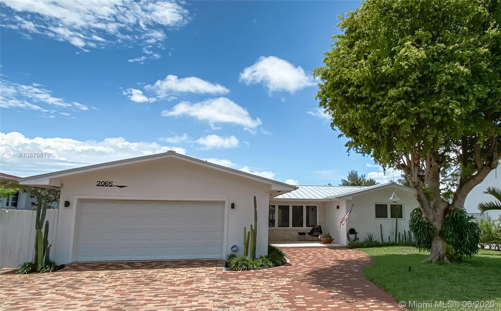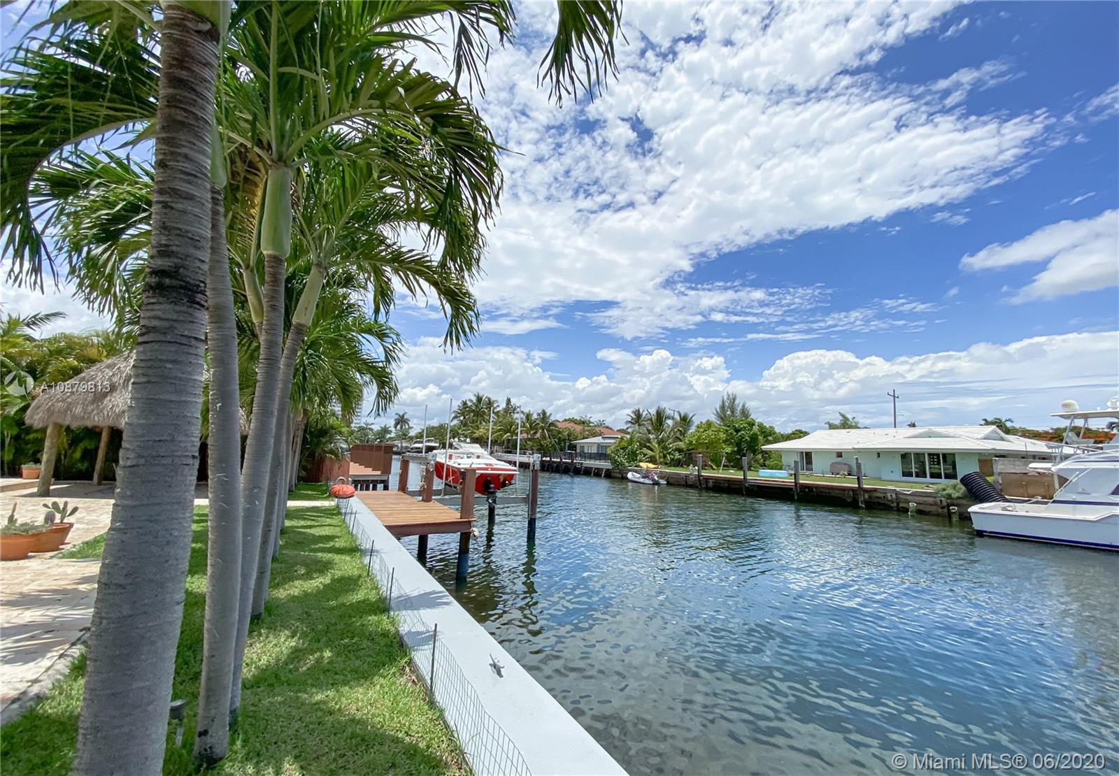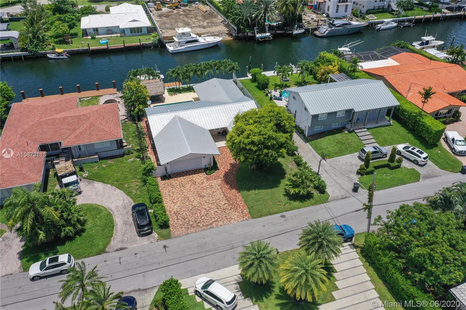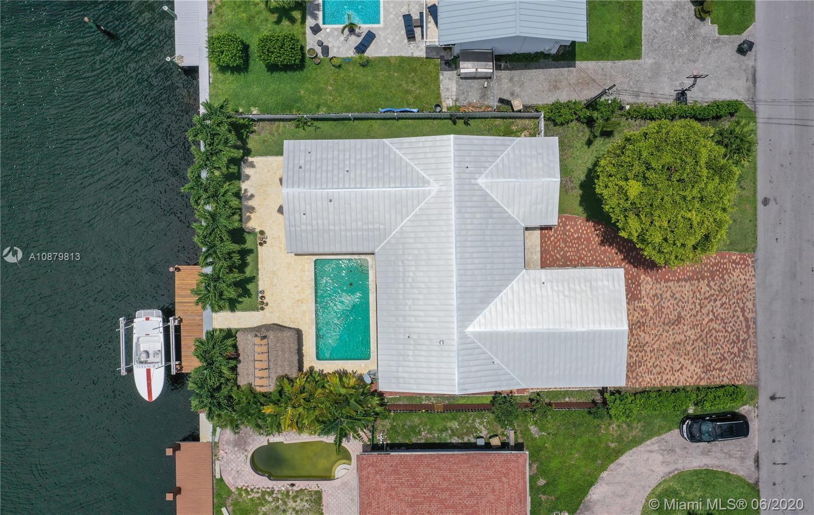 Sans Souci Estates, Waterfront just 6 houses from direct bay. Deep canal, no bridges. Bring up to a 75ft boat, or smaller boat and use the 16,000 lb elevator boat lift ready to go. All hurricane impact windows and doors. Open Kitchen concept is done right with lots of space to entertain. 3 bathrooms and 3 large bedrooms. Nice primary bedroom measures 18’x14’, plus huge walk-in closet & 11’x11’ bath features dual sinks and massive shower. 2 car garage. 2015 New Metal Roof. Relax and enjoy Miami Florida living under the tiki hut by the sparkling pool and ocean access water. 24hr Police Gated Community located walking distance to area restaurants, LA Fitness & Whole Foods Market. Minutes to Bal Harbor & Beaches. "A" Rated Schools.