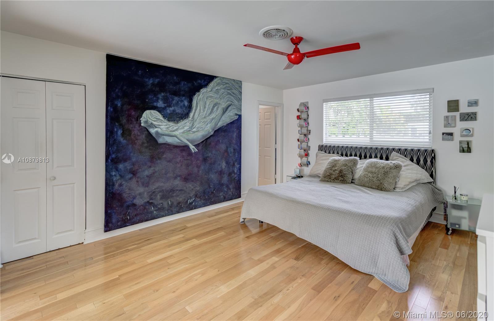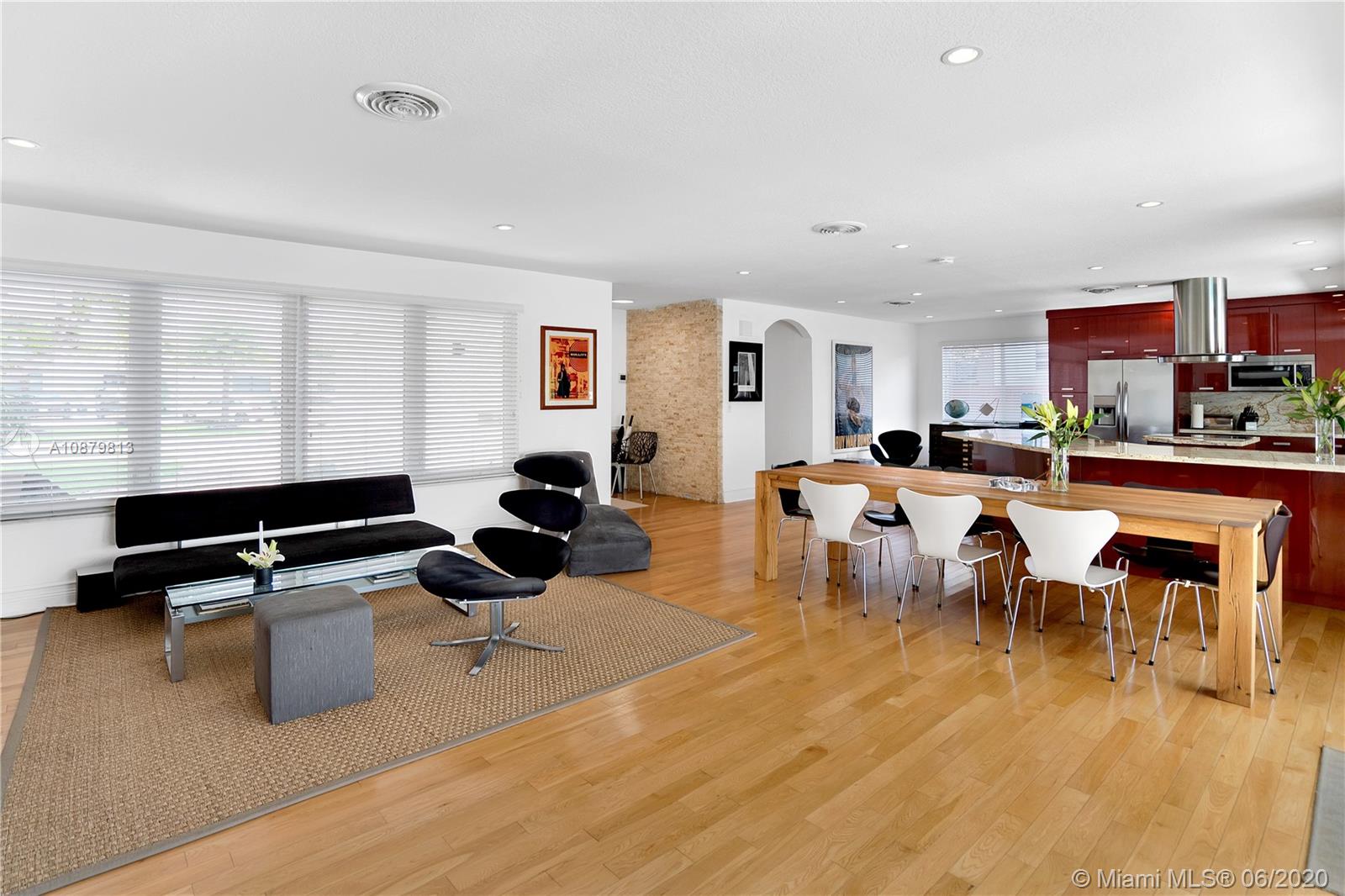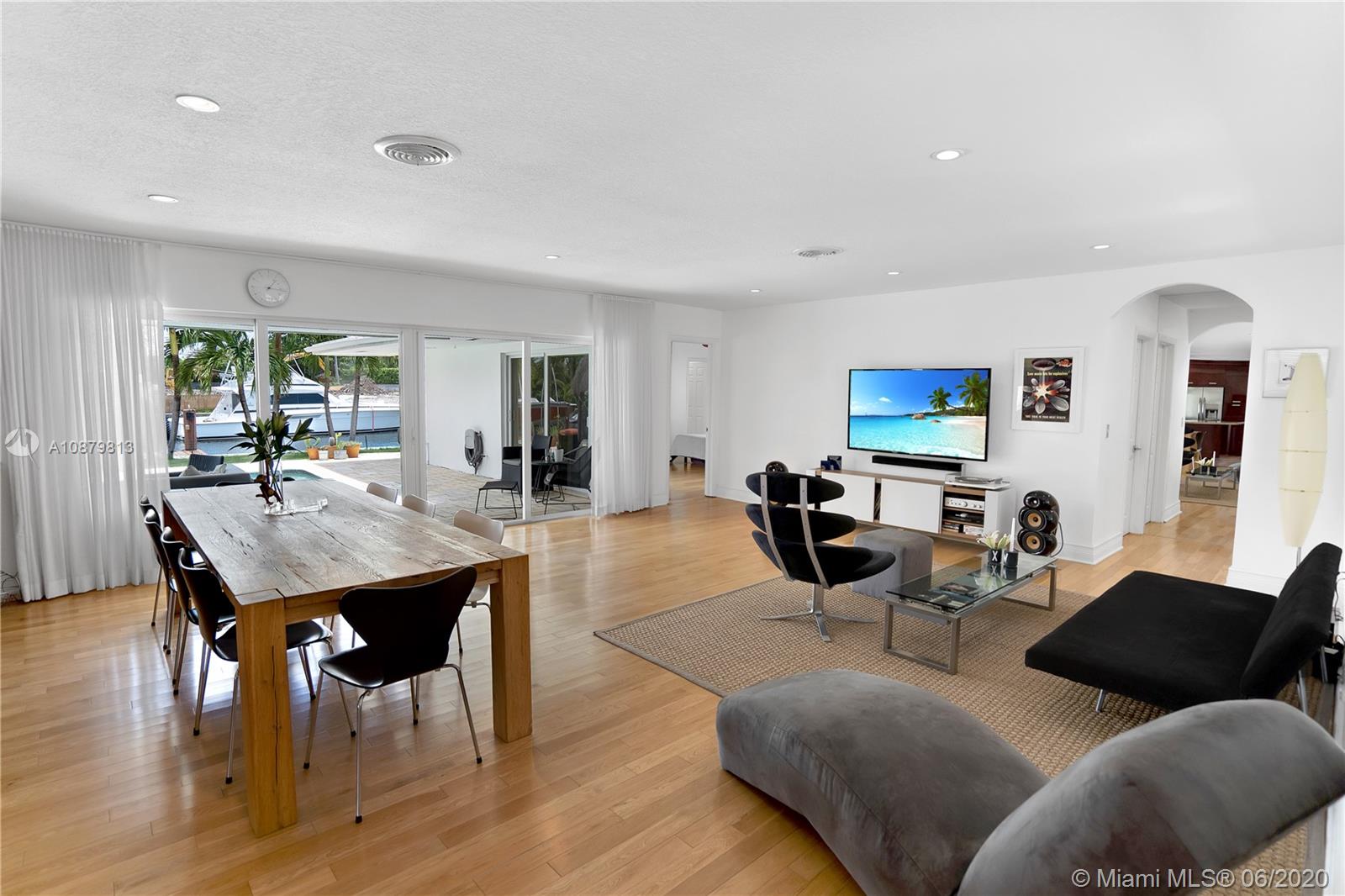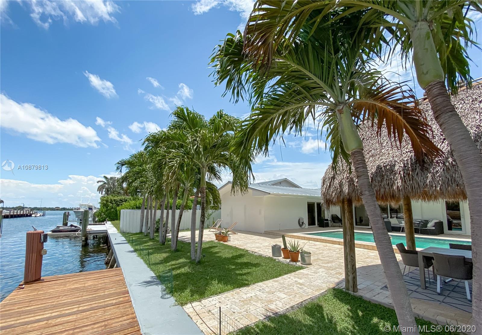 Sans Souci Estates, Waterfront just 6 houses from direct bay. Deep canal, no bridges. Bring up to a 75ft boat, or smaller boat and use the 16,000 lb elevator boat lift ready to go. All hurricane impact windows and doors. Open Kitchen concept is done right with lots of space to entertain. 3 bathrooms and 3 large bedrooms. Nice primary bedroom measures 18’x14’, plus huge walk-in closet & 11’x11’ bath features dual sinks and massive shower. 2 car garage. 2015 New Metal Roof. Relax and enjoy Miami Florida living under the tiki hut by the sparkling pool and ocean access water. 24hr Police Gated Community located walking distance to area restaurants, LA Fitness & Whole Foods Market. Minutes to Bal Harbor & Beaches. "A" Rated Schools.