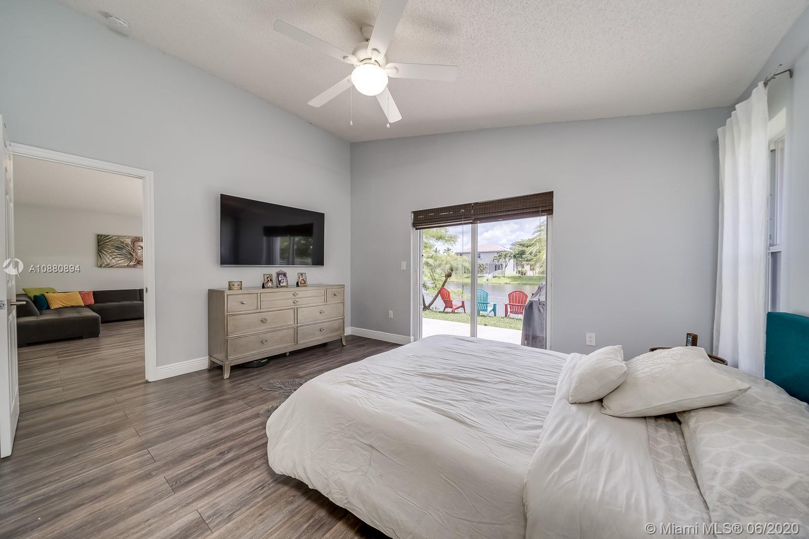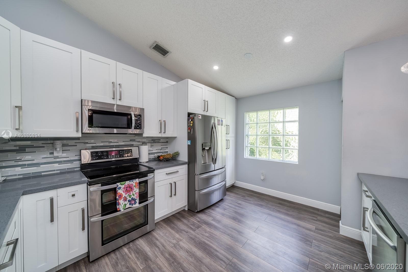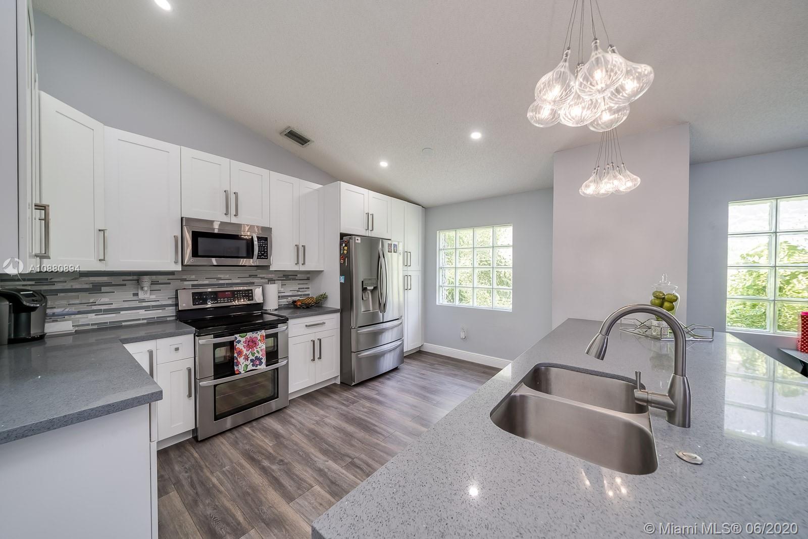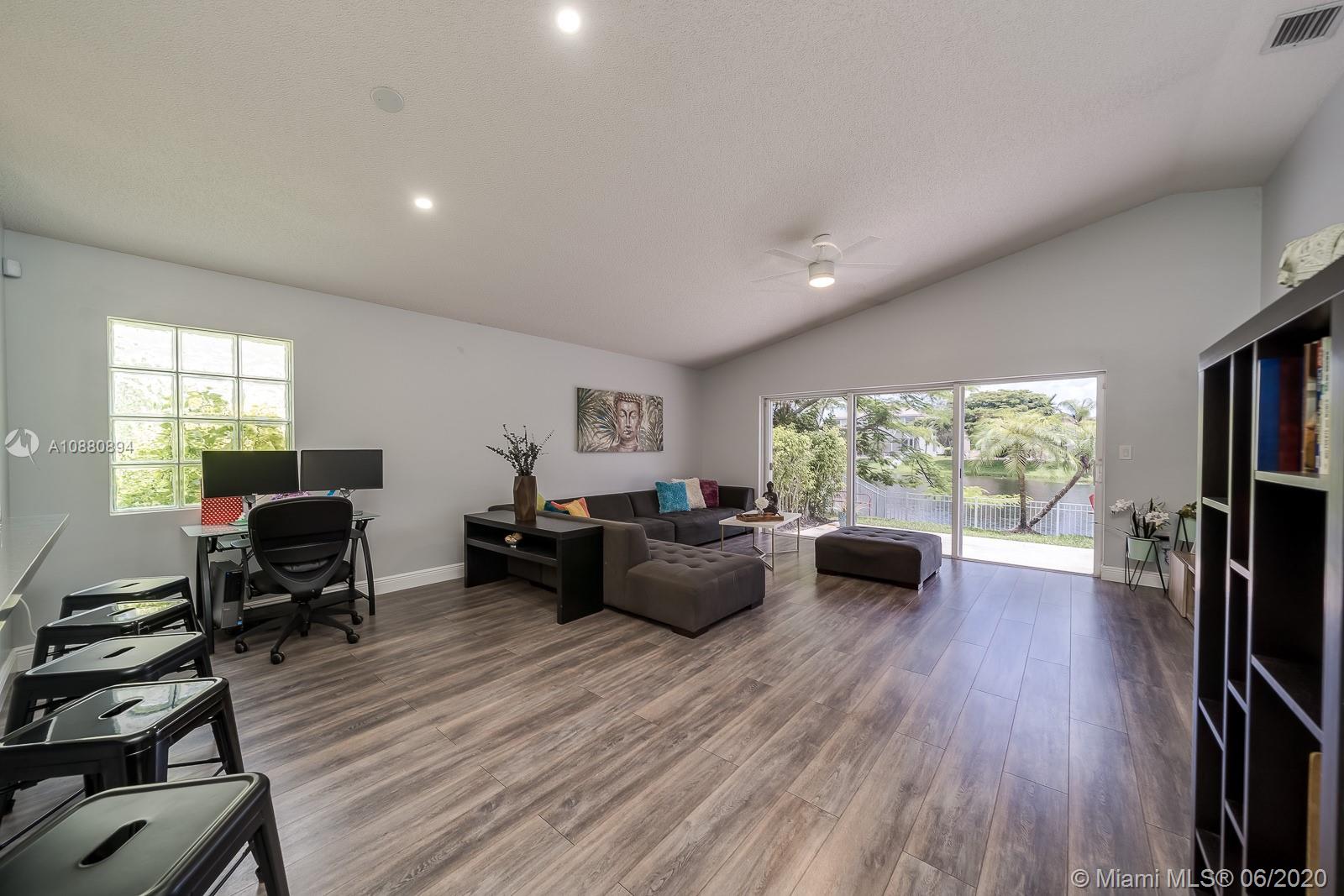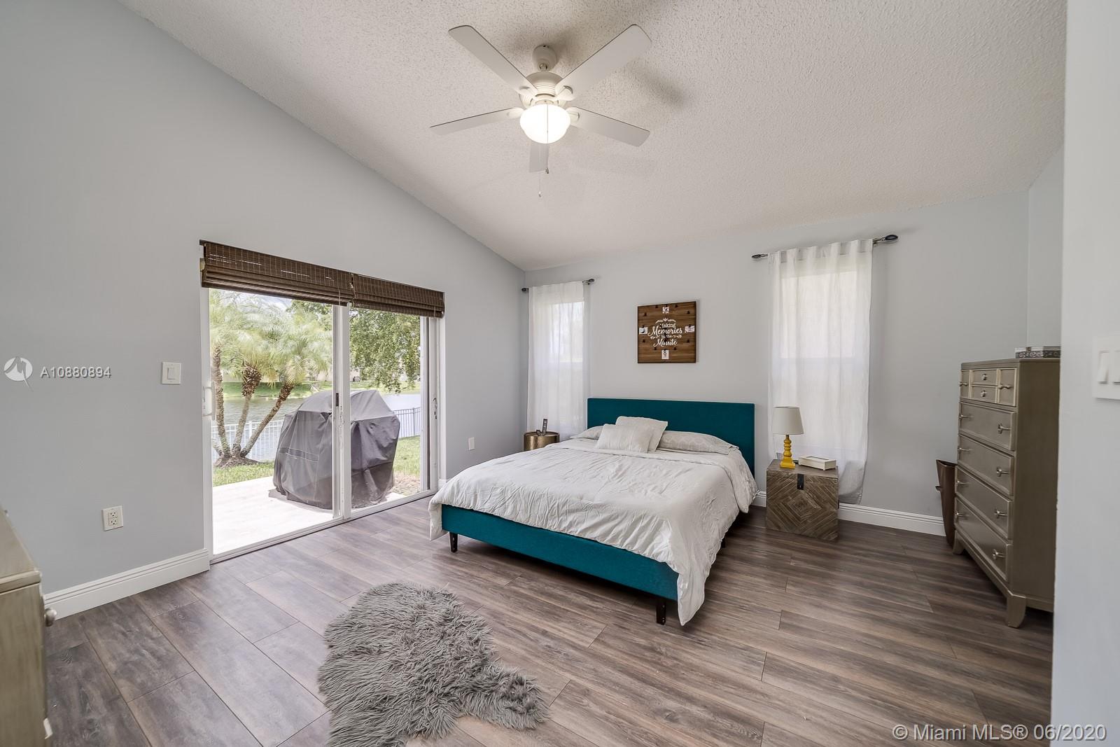 A MUST SEE! CLEAN and spacious 3/2 in one of the nicest most sought after gated communities. MOVE-IN READY. Beautiful flooring all throughout. Part of the garage has been converted into spacious 4th bedroom (seller will disassemble 4th room back to DOUBLE GARAGE per buyer's request). Pretty RENOVATED open kitchen w/ serving/breakfast bar, granite counter tops, lots of cabinets and space with self-close doors and drawers. Stainless-steel appliances (Refrigerator, washer and dryer machine 2-years new). A/C 2014. Modern renovated bathrooms. Spacious backyard w/ a beautiful view LAKE FENCED and NO neighbors in the back. New rain gutters. All light fixtures will remain. HURRICANE ACCORDION shutters all throughout. Ventilation system has been recently cleaned and disinfected. SPRINKLES system.