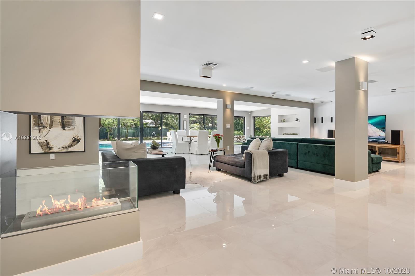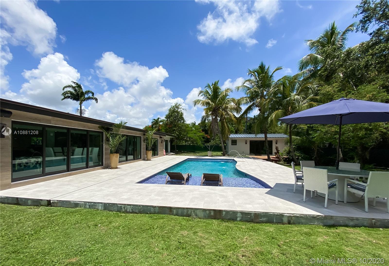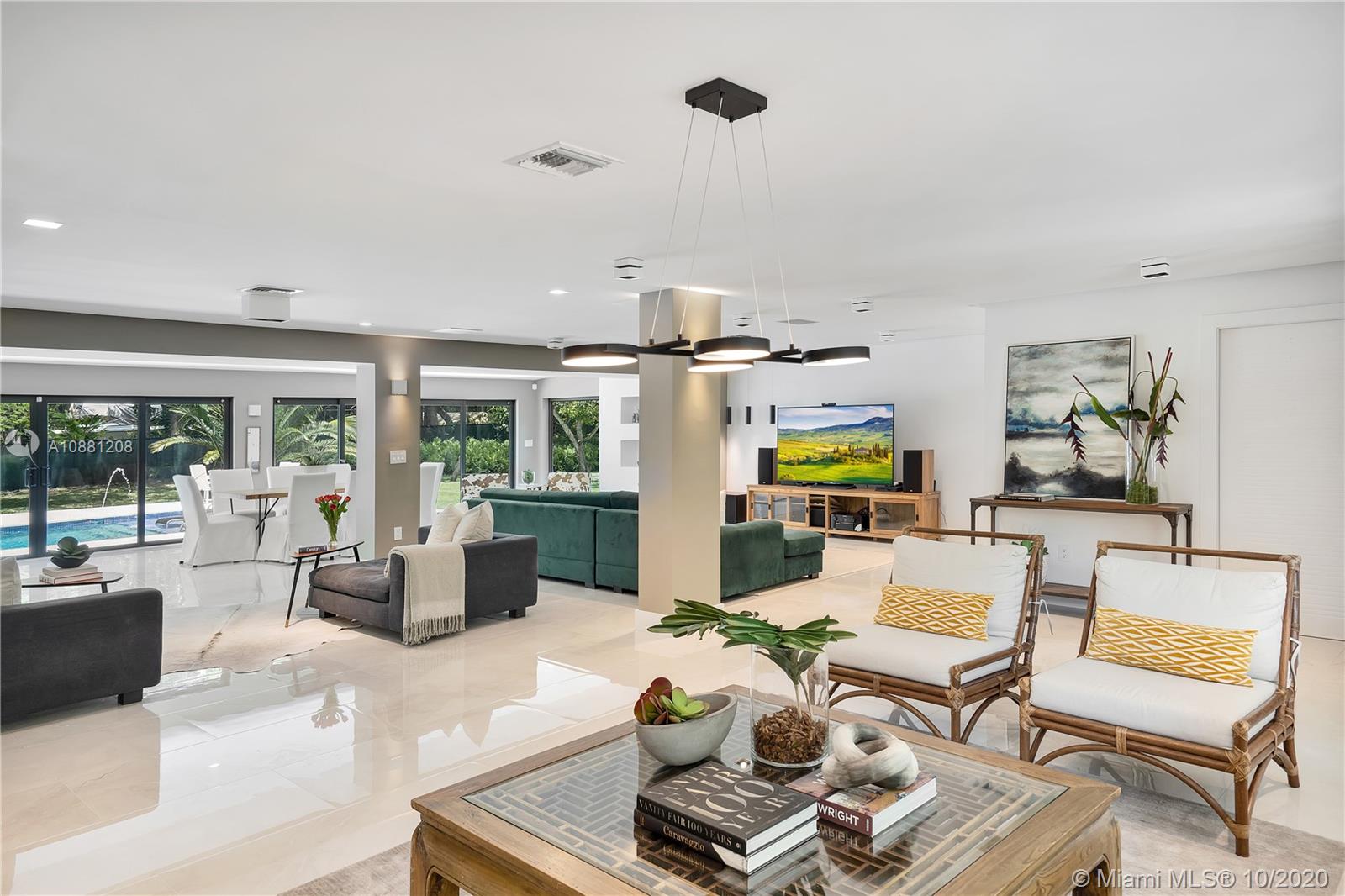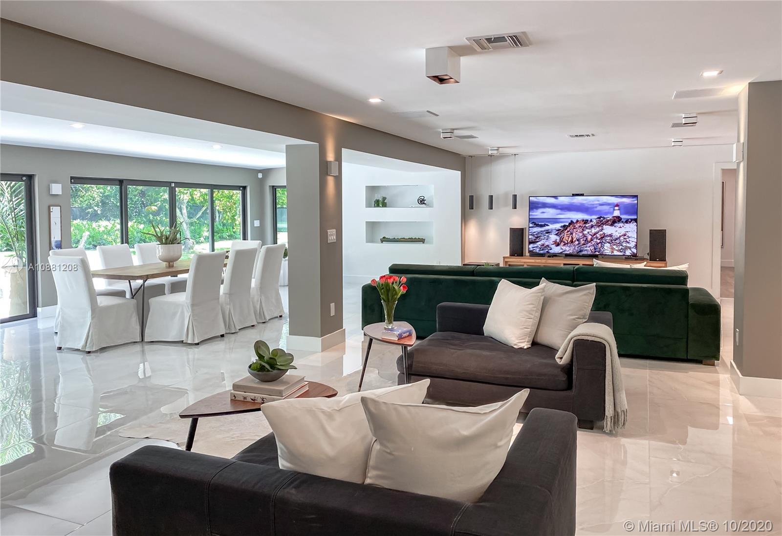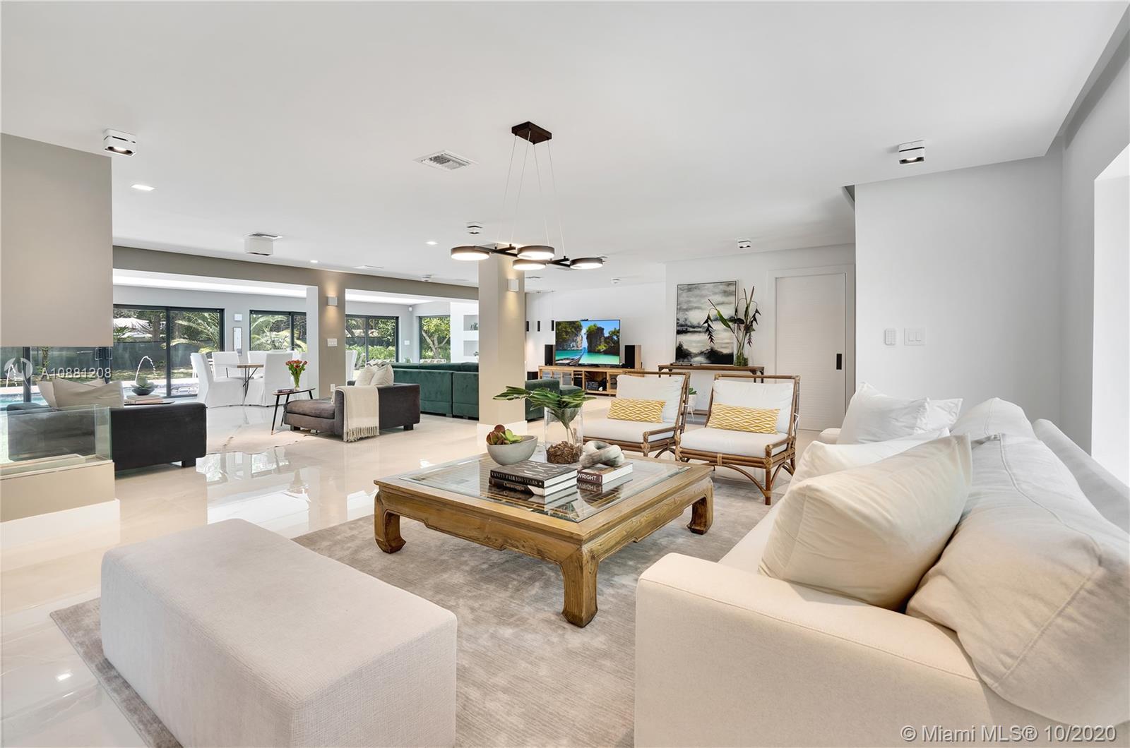 Fully remodeled home in Pinecrest. This residence offers a spacious and bright living area, a state-of-the-art gas-range Italkraft kitchen with Sub Zero, Wolf & Miele appliances as well as remodeled bathrooms with chromotherapy in the master shower. This expansive residence is located on an ample 38,769 SF Lot with a Pentair pool with UV sanitizer and a pond. Private 1be/1ba guest-house with a full kitchen. Other upgrades of this battery ready home include: a full summer kitchen under AC, solar panels, a 3-car garage, Porcelanosa-tile floors, LED lighting throughout, all CGI impact windows and doors, central vacuum, water filter with UV filter, SIW front pivot door, 4 Carrier A/C’s with nest controllers, new metal roof from 2018 and updated electrical and plumbing.