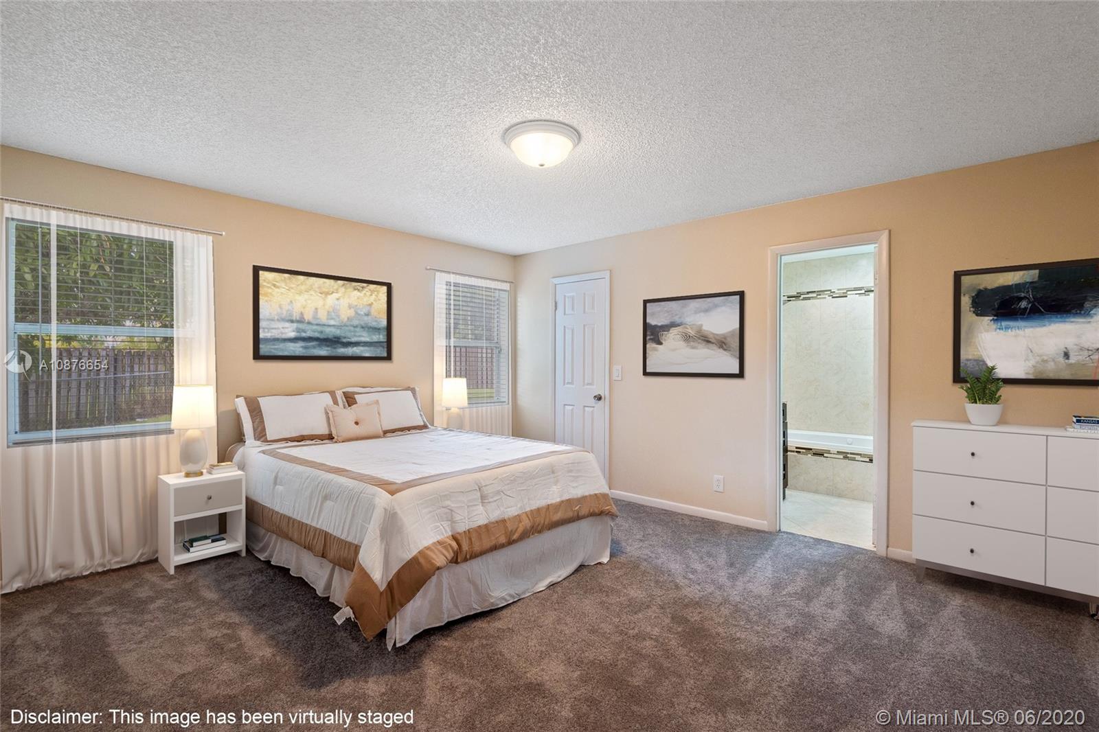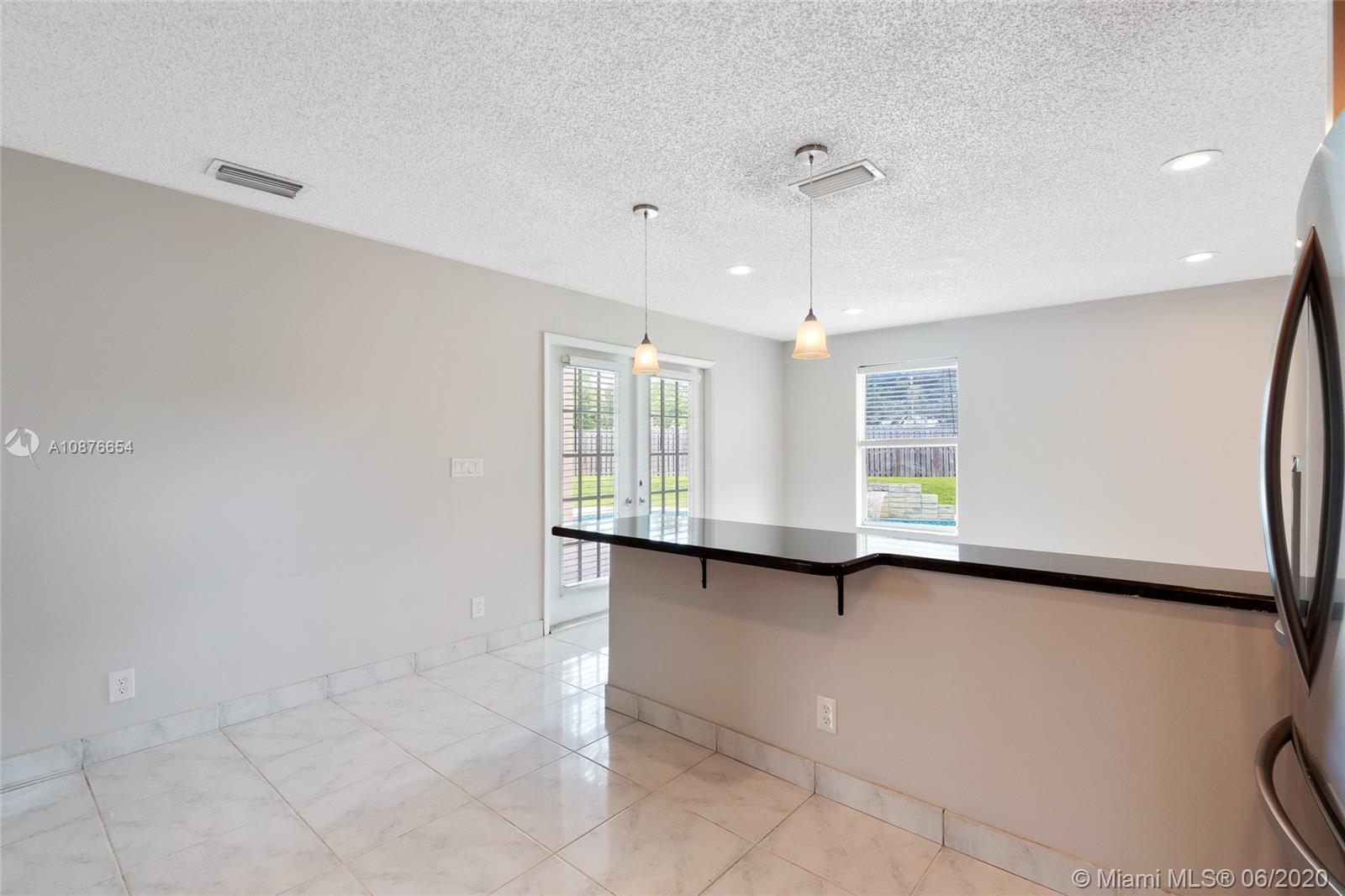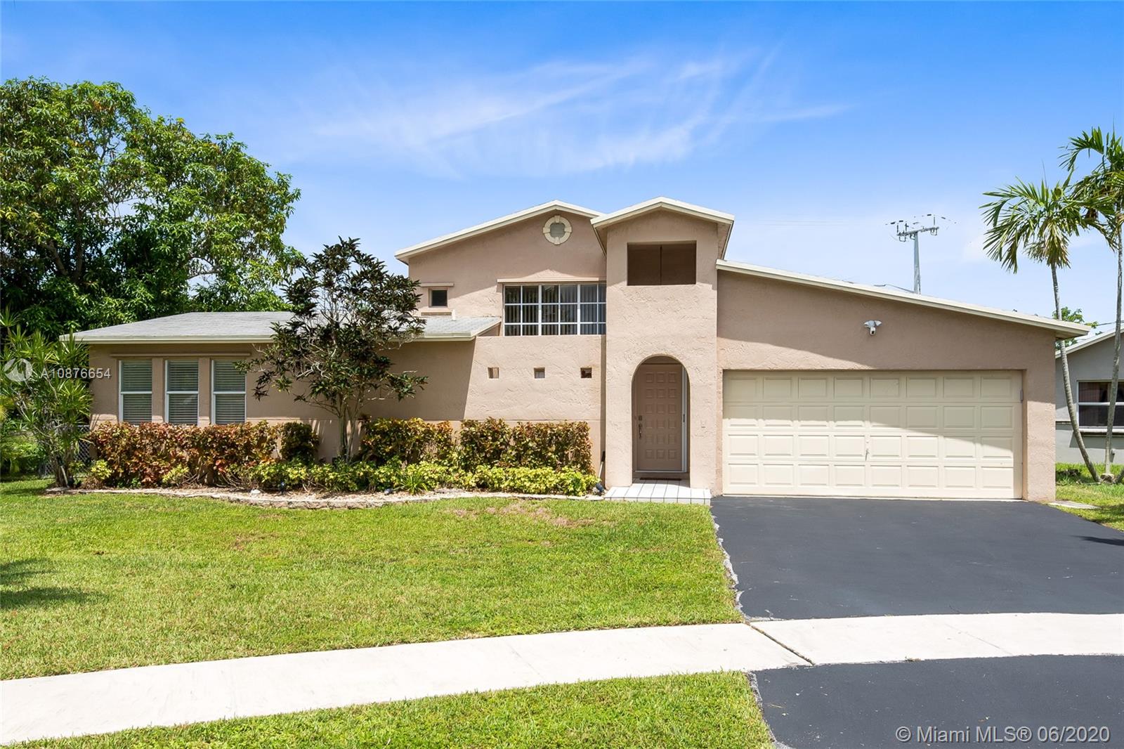 Lovely updated home on one of the largest lots in Springtree Lakes, 10000+sf of fully fenced yard + fruit trees. Pretty shaped salt water pool with cascading fountain. Covered patio with built in BBQ area. Storage shed on side. Interior living areas have been freshly painted. Updated kitchen with SS Appliances. Both baths updated – master has Jacuzzi tub & enhanced lighting. Bedrooms 2 & 3 can be opened up or kept as individual rooms. Spacious living areas with high ceilings & french doors. Home Warranty to buyer for one year at closing. Hurricane panels.