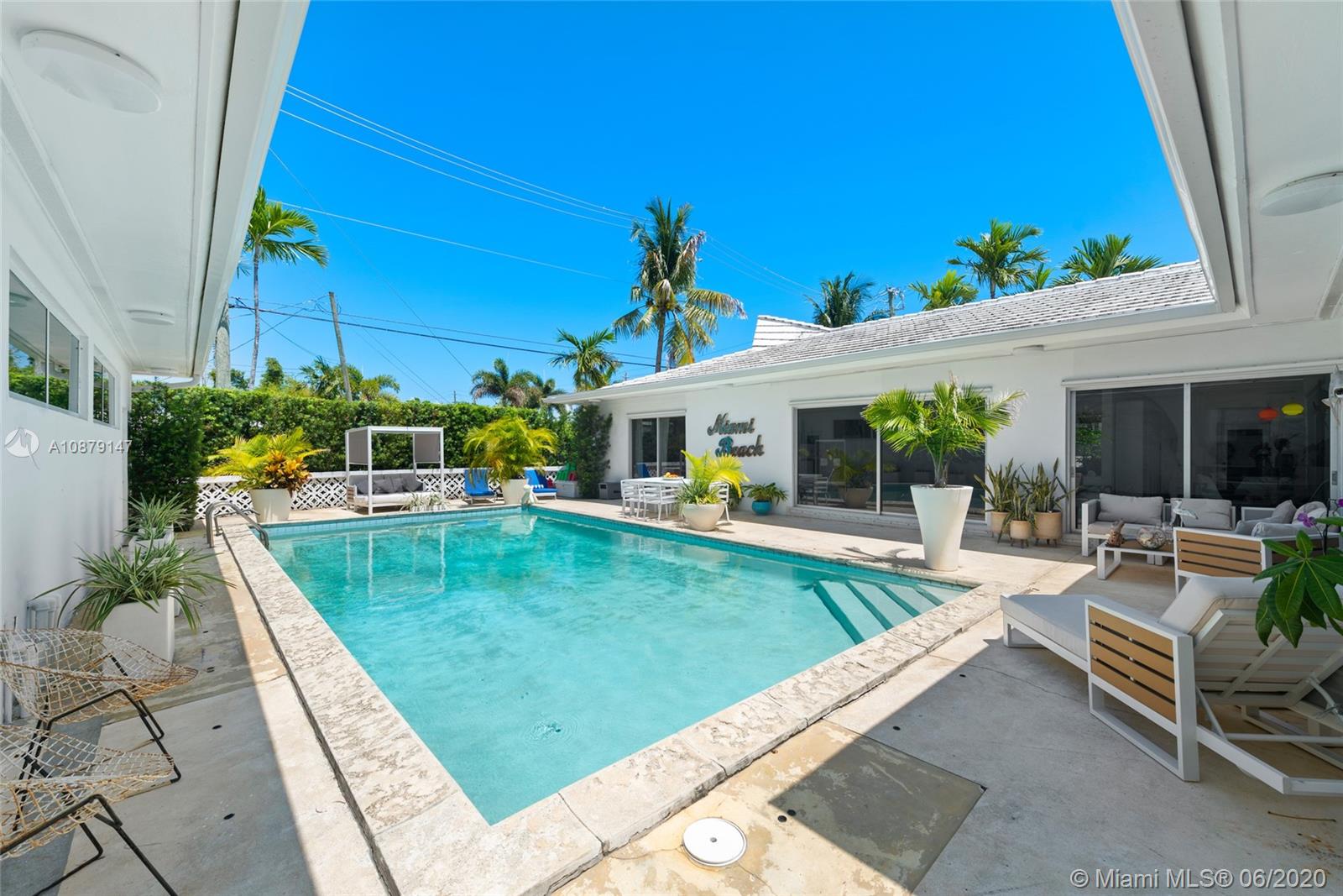 Restored & updated for modern living, this spacious mid-century gem was built to commercial standards in 1959 by a prominent developer as his personal home w/ an excellent 4bd/4ba split floorplan all on one story. Family room opens up to one of the largest courtyard pools in all of Surfside through ingenious sliding glass pocket doors that completely disappear seamlessly merging indoor & outdoor spaces. High end features include Nolte kitchen, Duravit bathrooms, custom terrazzo floors & new enormous detached converted activity center w/ guest quarters, laundry & can be used as a garage/gym/cabana. Situated on a corner lot, this already fantastic home has tremendous potential for future expansion. Partial impact windows & doors. 3D INTERACTIVE TOUR @ my.matterport.com/show/?m=1Hv84z5jVVd