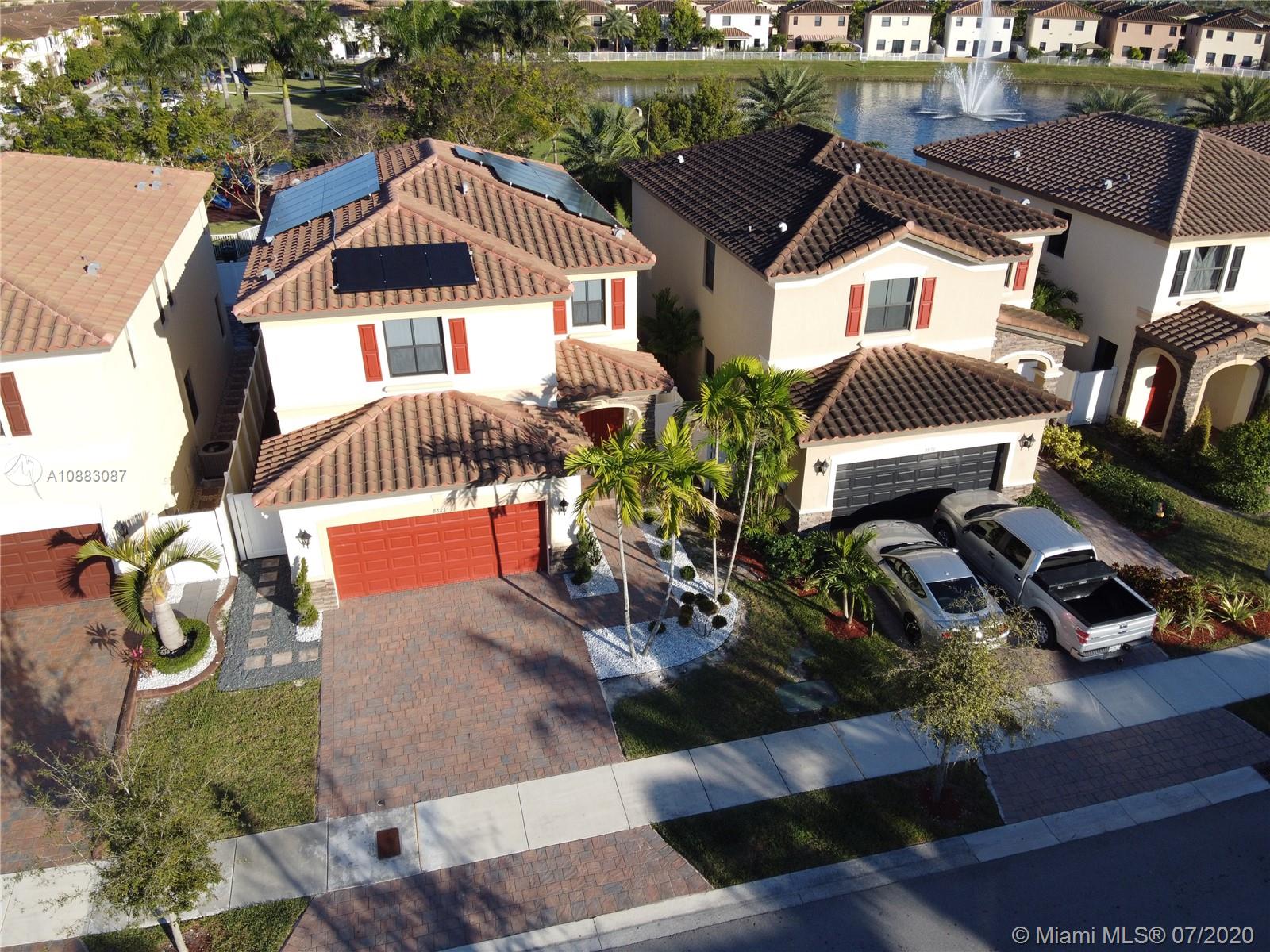 This is the perfect dream home in the prestige Aragon Community of Hialeah. This smart home features 3 bedrooms 2 and 1/2 bathrooms, multiple upgrades including a Solar Panel System, custom metallic epoxy garage flooring, customized full fledged garage gym, two Electric car charging station, cameras throughout the whole home, huge bath tub in master bathroom, partial lake view with amenities like community pool, clubhouse, gym, and 24 hour neighborhood security!