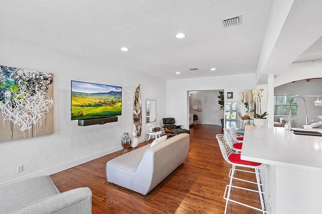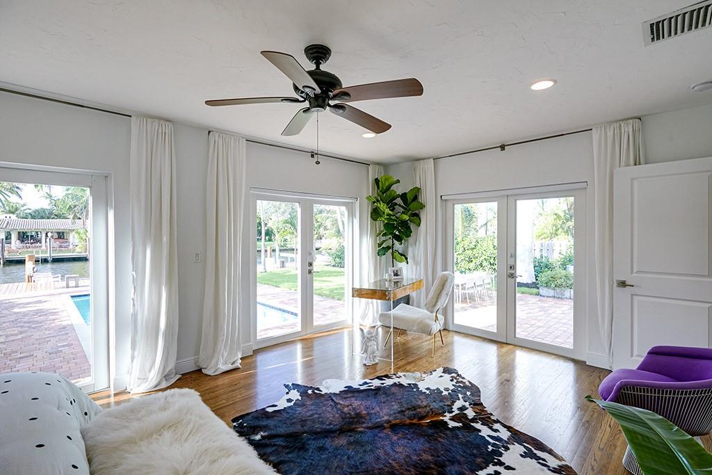 Magazine quality remodeled 3 bedroom 2 bath waterfront pool home in the heart of Las Olas. Vaulted dade county pine ceilings& wood burning fireplace in main living area. Walnut stained solid oak wood floors throughout. Chef's kitchen equipped with stainless steel Thermador gas range, Sub-zero refrigerator. White quartz island with seating for 4.Open floor plan kitchen ,dining & family room. Large master suite with big walk in closet. White marble walk in shower & floor , white quartz double vanity. Tropical water & pool views from master bedroom, living room & guest bedroom. Resort style pool overlooking the waterway & private dockage for your boat. Impact windows & doors, covered carport parking, paver driveway & pool area. Walk to dining, shops & the beach. Move in ready, must see!
