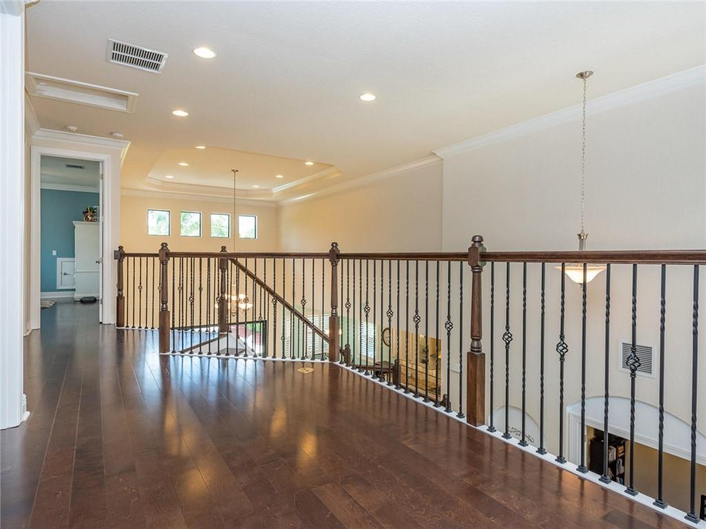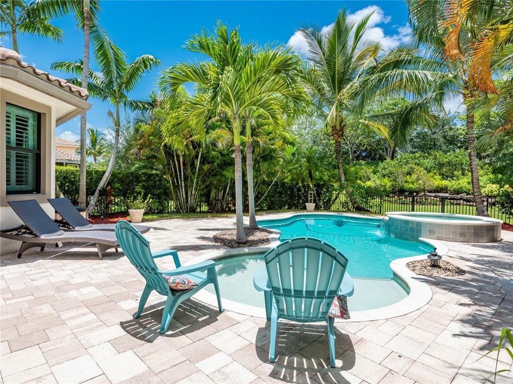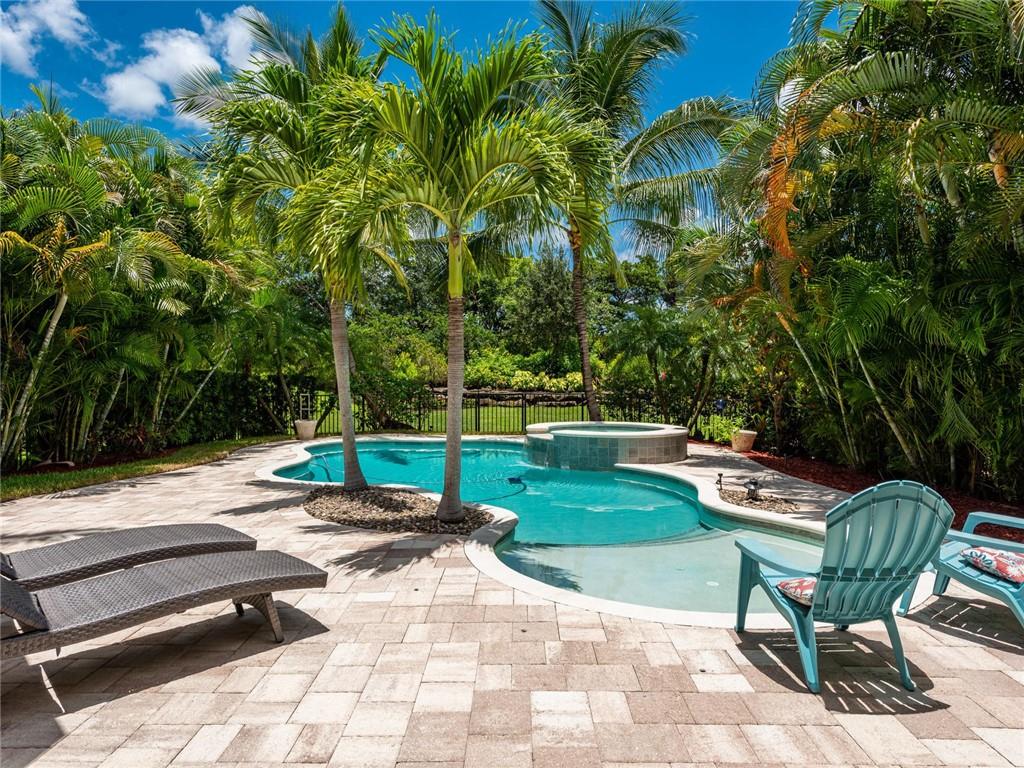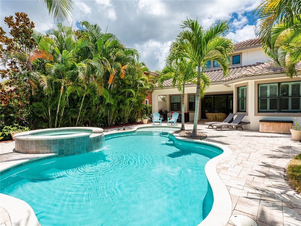 Model Perfect Savior model featuring 5 bedrooms, 4 bathrooms and an office. Stunning upgraded kitchen, w SS appliances, granite, wood cabinets, built in pantry. Wood floors and porcelain tiles throughout the home, crown moldings, elegant glass front doors, plantation shutters and beautifully appointed upgraded bathrooms. Surround sound inside and outside, Built-in custom unit and a wet bar in family room. The tropical private back yard features a saltwater free formed pool and a hot tub with separate heating system, beautiful landscaped. Security system with cameras throughout. This immaculate move in ready home is on a quiet double cul-de sac street.