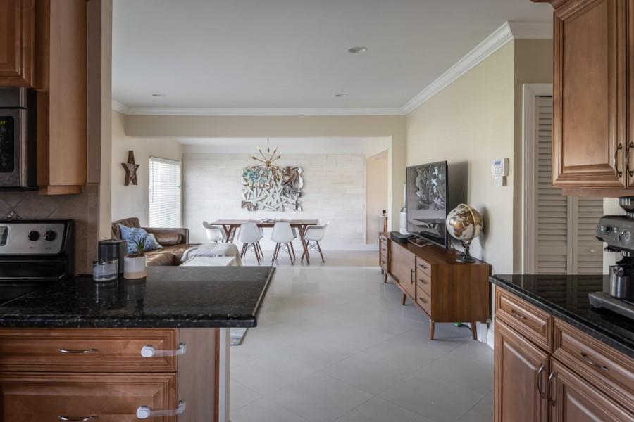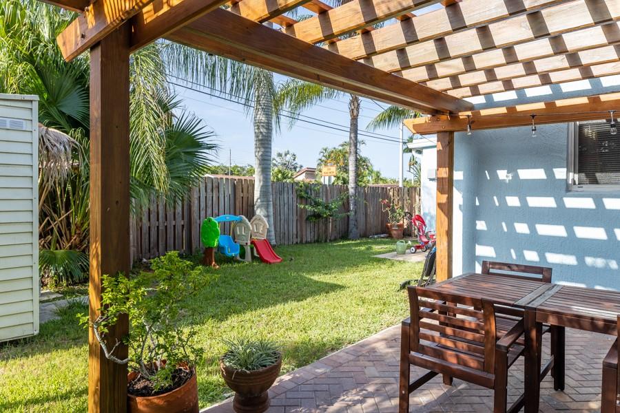 Perched on a corner lot on a quiet tree lined street we welcome you to Home Terrace. Here you will find an open concept living space with beautiful marble flooring. The kitchen has been remodeled and features ss appliances, granite countertops and opens to the comfortable living area. An additional family room accommodates easy living and from there doors lead you to a fenced in backyard with a lovely patio. The outdoor space is inviting and perfect for entertaining, relaxing or just fun and features a new pergola. The indoor is bright and light. Split bedrooms and remodeled bathrooms. Turn key with Impact windows and doors make it all hurricane prepared. Situated minutes to the beach, downtown, golf and everything else South Florida has to offer. We welcome you to Home Terrace!