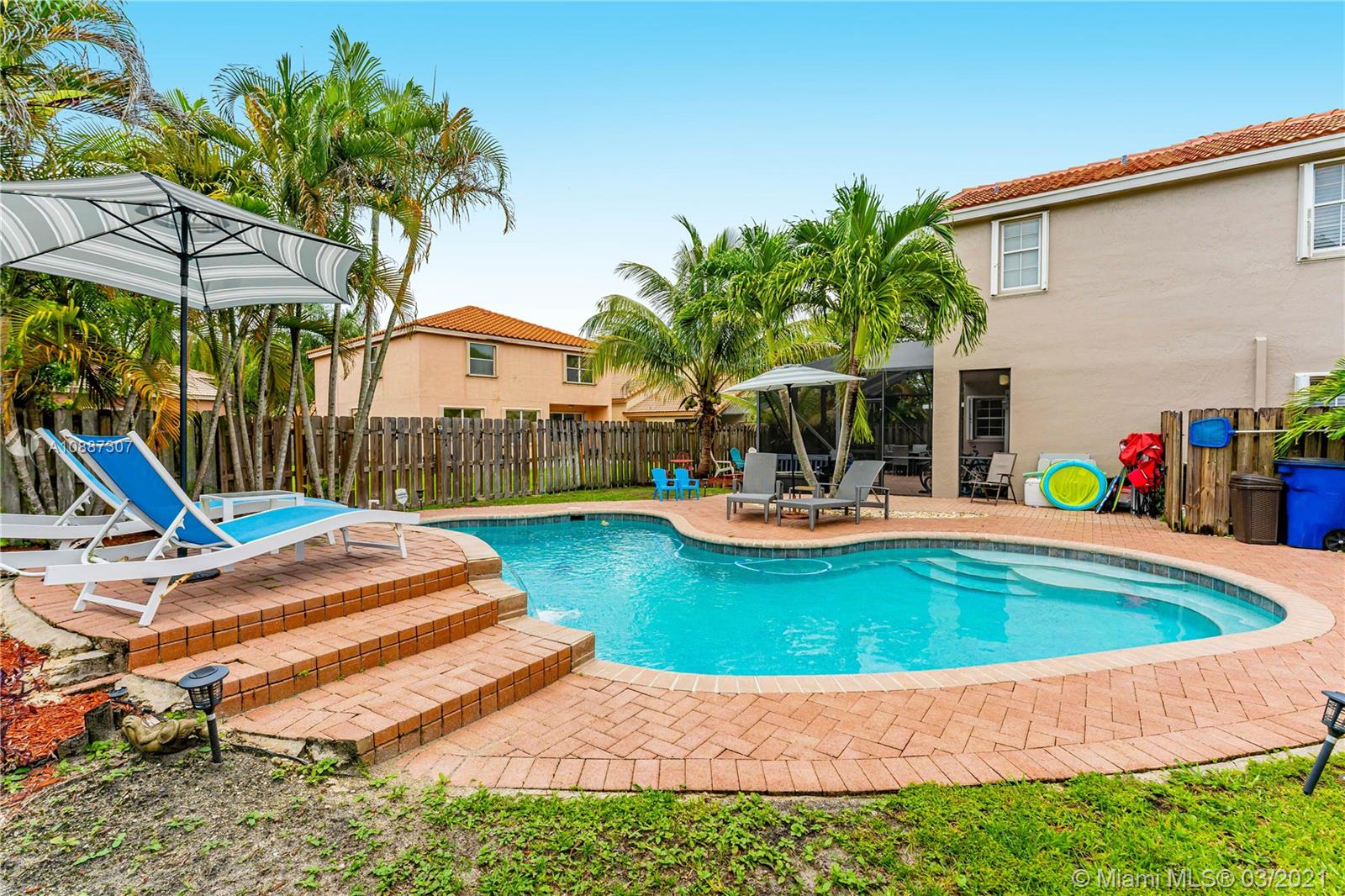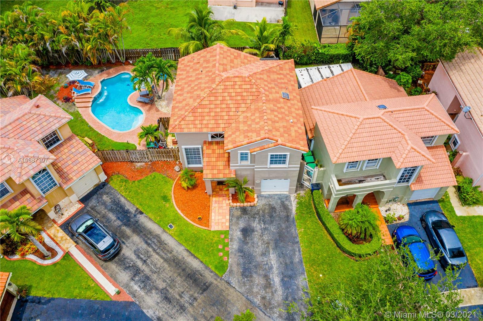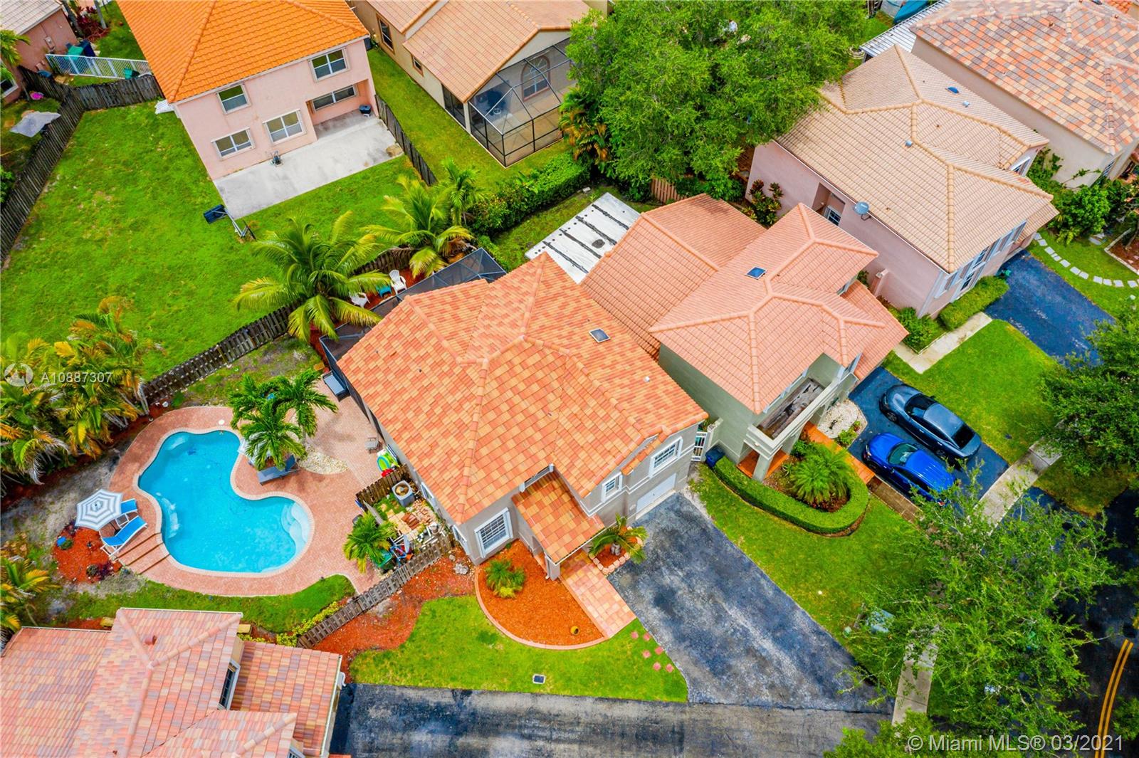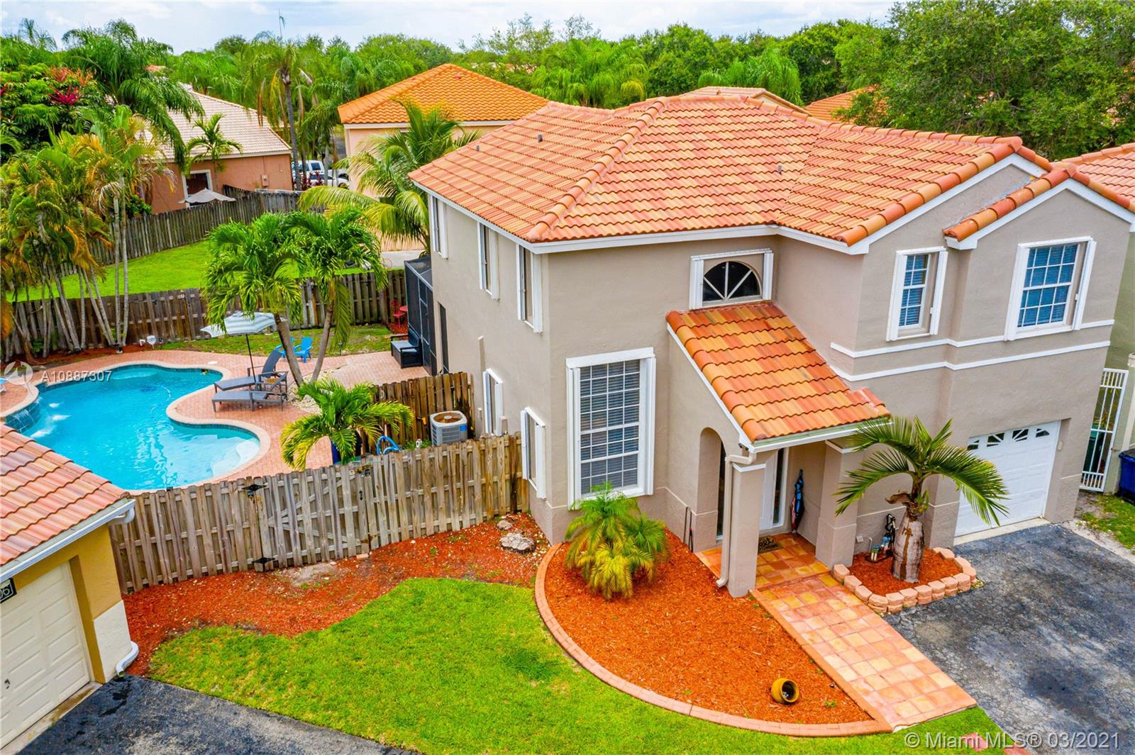 Beautiful two-story home in highly sought after Trellises at Embassy Lakes. 3 bedrooms and 2 bathrooms upstairs, one half-bath downstairs. Updated kitchen with granite countertops, large cooking island and stainless steel appliances. Remodeled master and half bathrooms, neutral floor tiles throughout and laminate wood flooring on second floor. Oversized corner lot has ample space for relaxing and entertaining with a completely fenced-in yard, bean-shaped pool with waterfalls and a screened enclosure. Accordion hurricane shutters, roof tiles four years old. Exterior of the home repainted last year. Amenities include clubhouse with Olympic pool, gym, tennis, playgrounds and bike/run paths. Best A rated schools around, just a short walk to Embassy Creek Elementary, shops and restaurants.