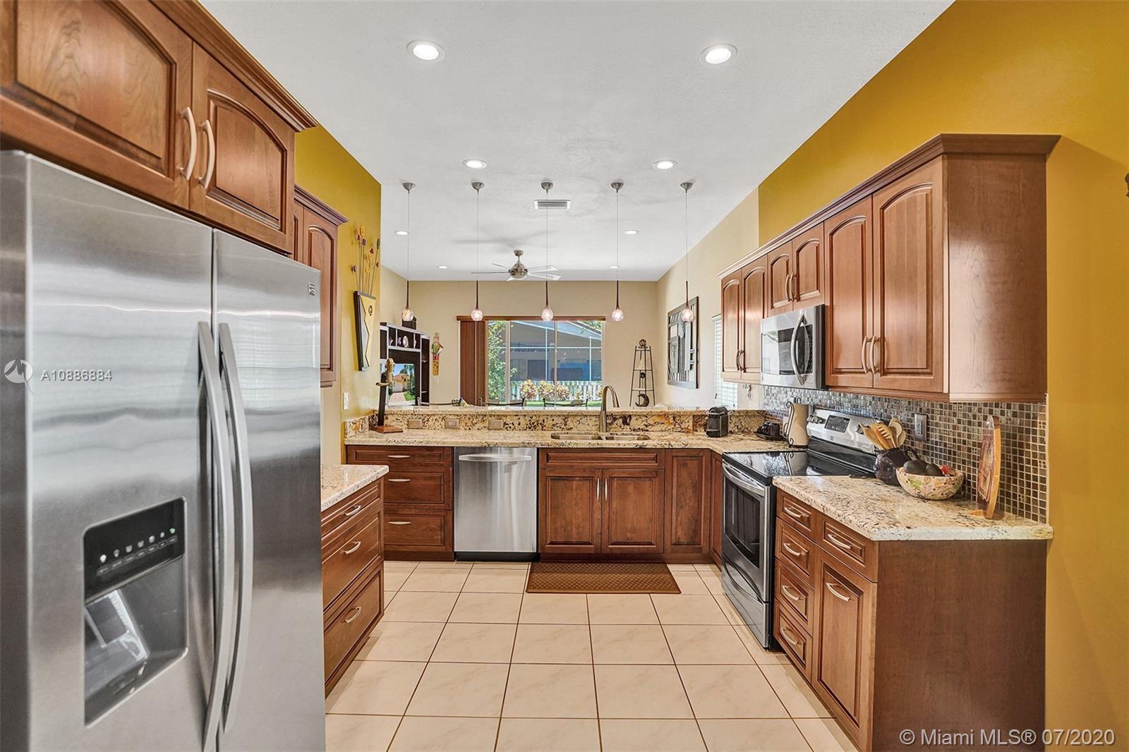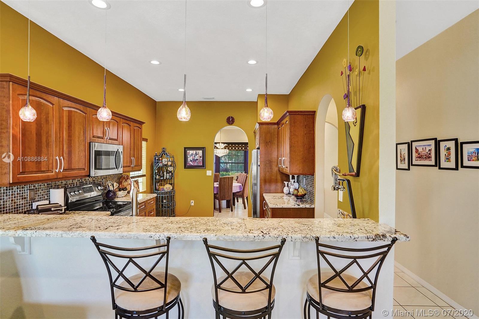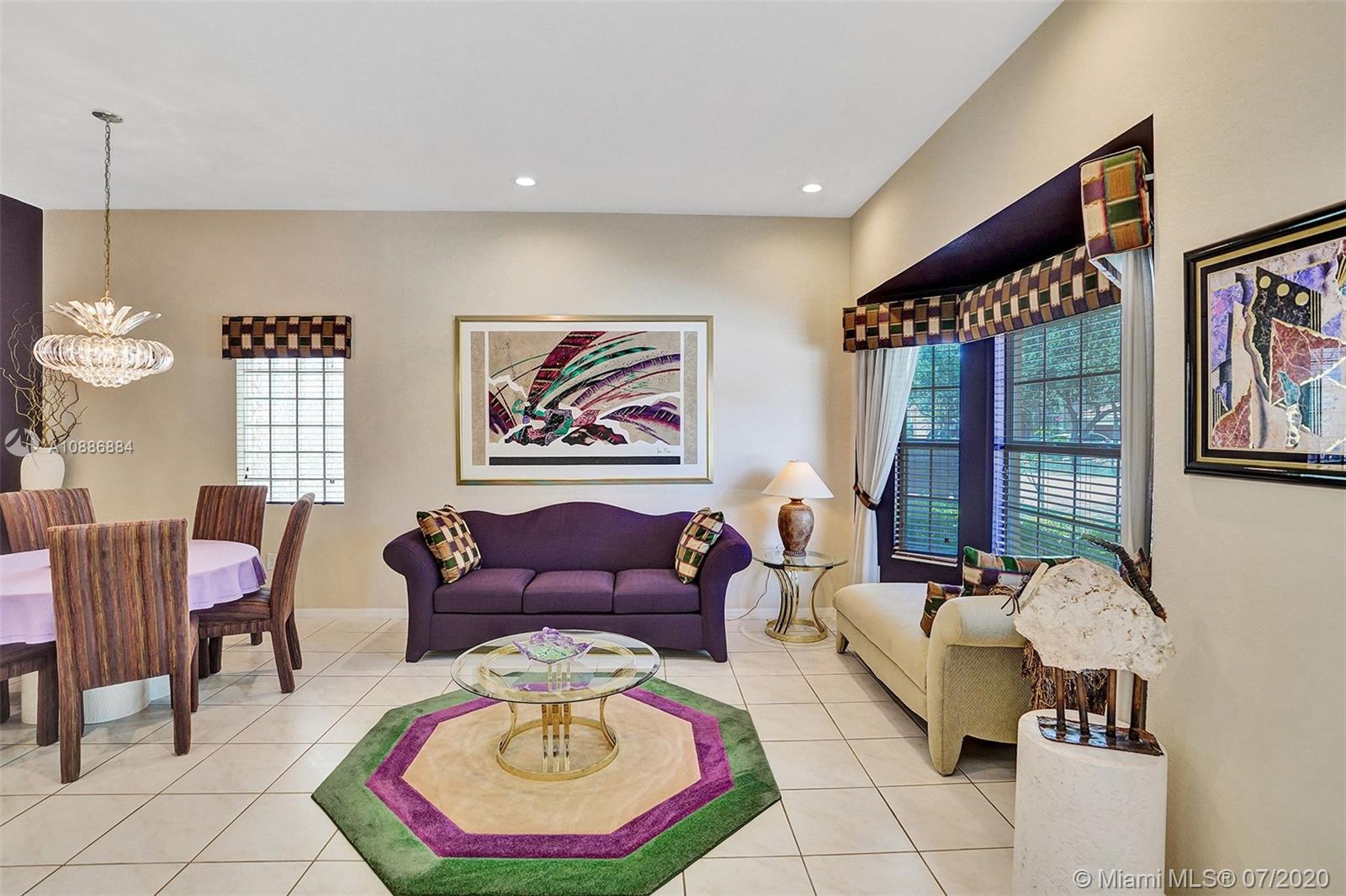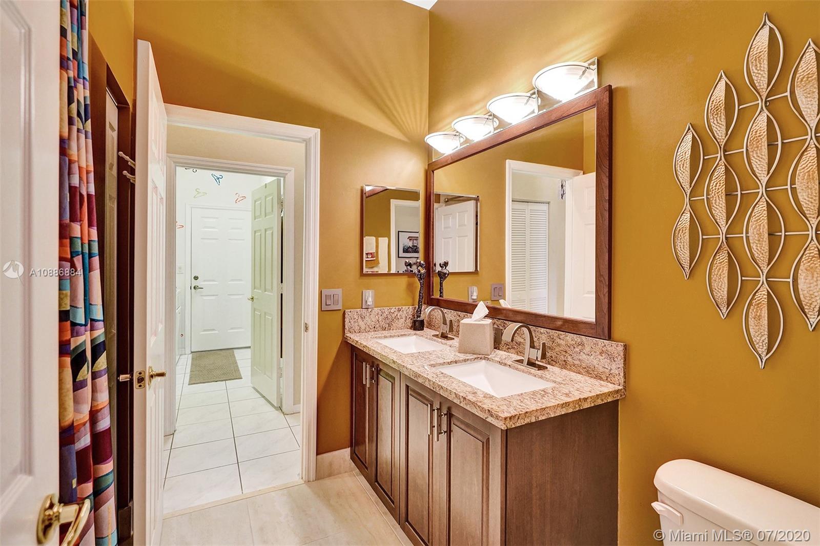 Builder modified 3 Br + Den; ideal for nursery, office or exercise. Meticulously kept home on fantastic corner lot with option to fence. Unique & spacious floor plan boasting 10 ft ceilings, updated interior shows pride of ownership featuring a recent custom-built, maple wood & cherry finish kitchen cabinetry with deep storage, soft close & pull-out drawers, beautiful stone counters & stainless appliances. New bathrooms, quality wood cabinetry, stone counters, hardware & tile work. Additional features include; Led lights in the living area, blown glass light pendants, blinds, storm panels, impact garage & front door, 1 year old exterior paint. Best amenities; pool, gym, 24/7 gated access & security. Maintenance includes lawn irrigation & cutting, cable TV+ Internet @ 1 GB speed
