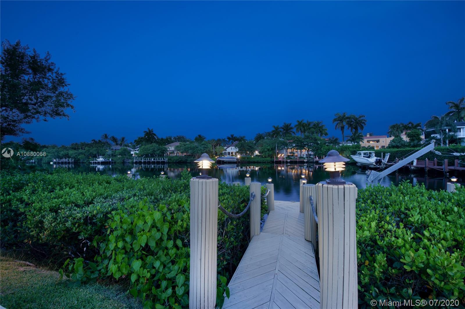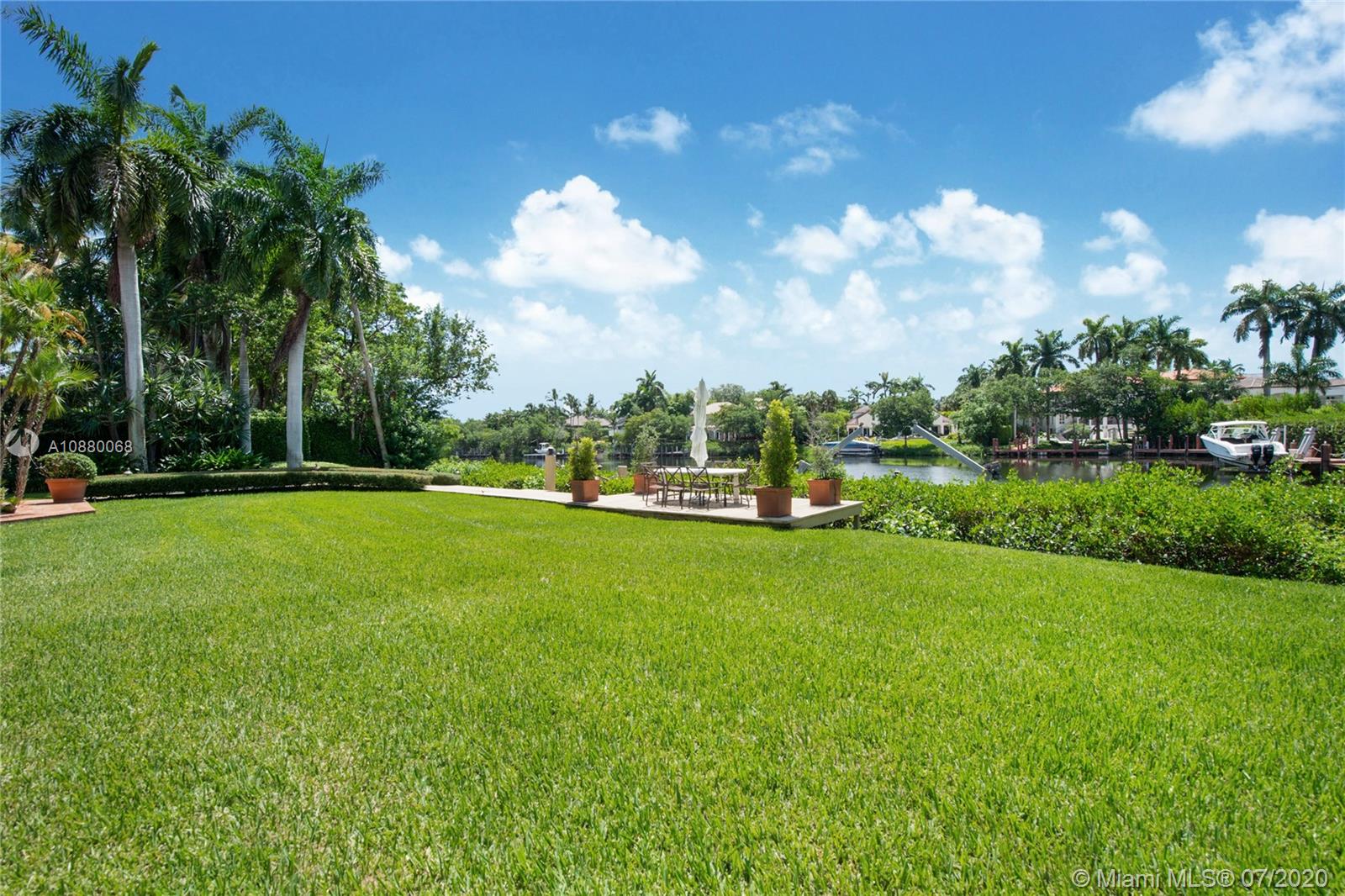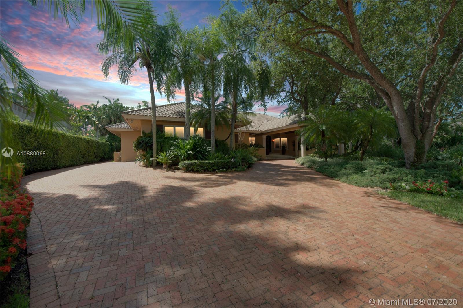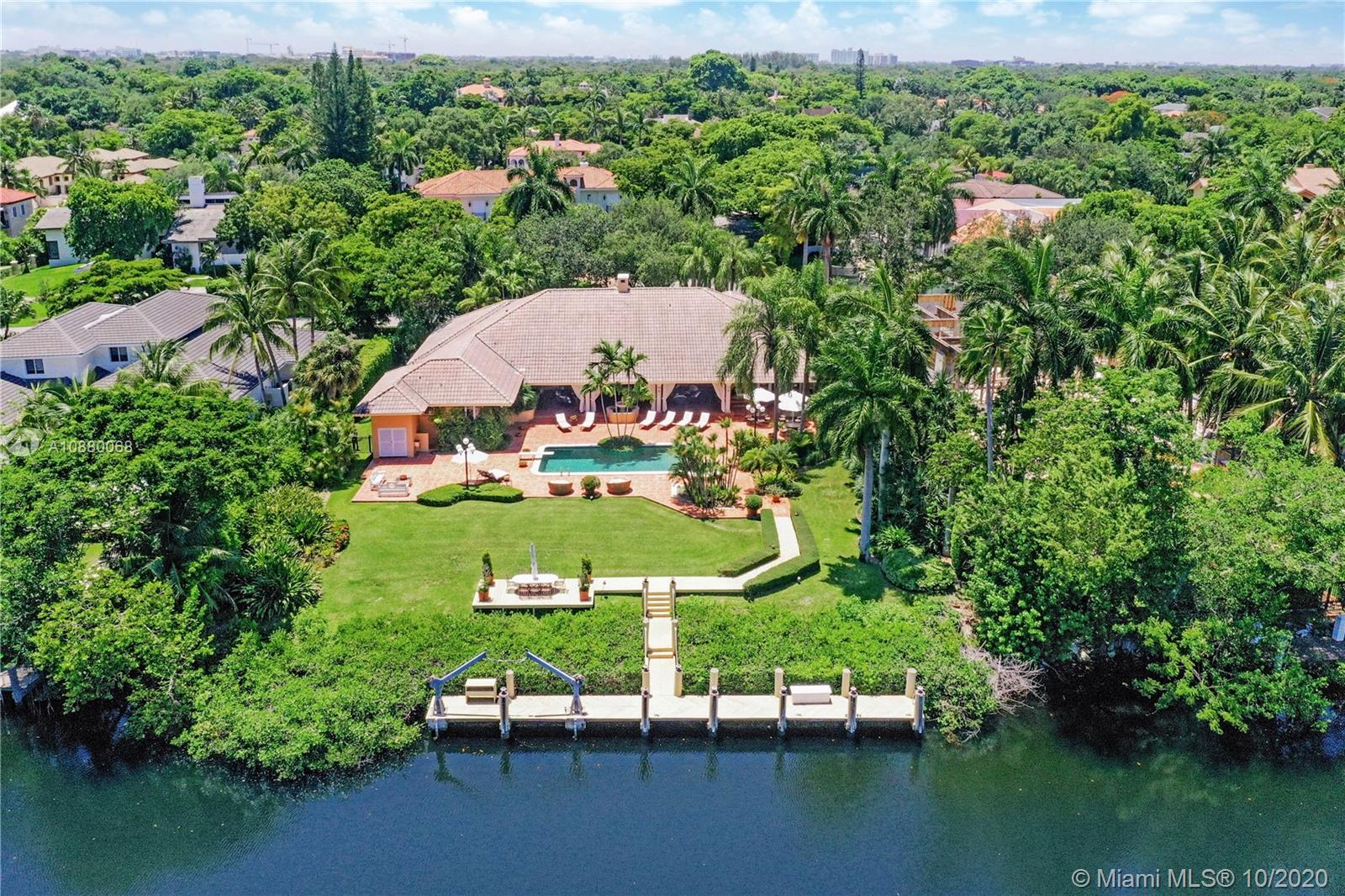 Waterfront coveted 1 story house in Cocoplum I gated community. Brick circular driveway with porte cochere. Transitional/Mediterranean style. Honed limestone and wood floors. 5 bedrooms, 5 1/2 baths and 2 car garage, with additional office and playroom. Expansive main suite and marble bath with dual sinks overlook the water. High ceilings throughout the house. Corridors are wide to display art. Security cameras. Meticulously maintained. One of the largest covered terraces in the community with Summer Kitchen and large dive in pool. Lot is .73 acres and dock is 80 feet with davits. 138 ft water frontage. Expansive wide canal water views from almost every room in the house. Only minutes to Key Biscayne by boat and close to Downtown, C. Grove and the Beaches. Enjoy the best of coastal living.