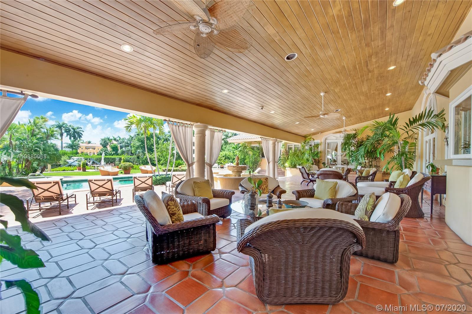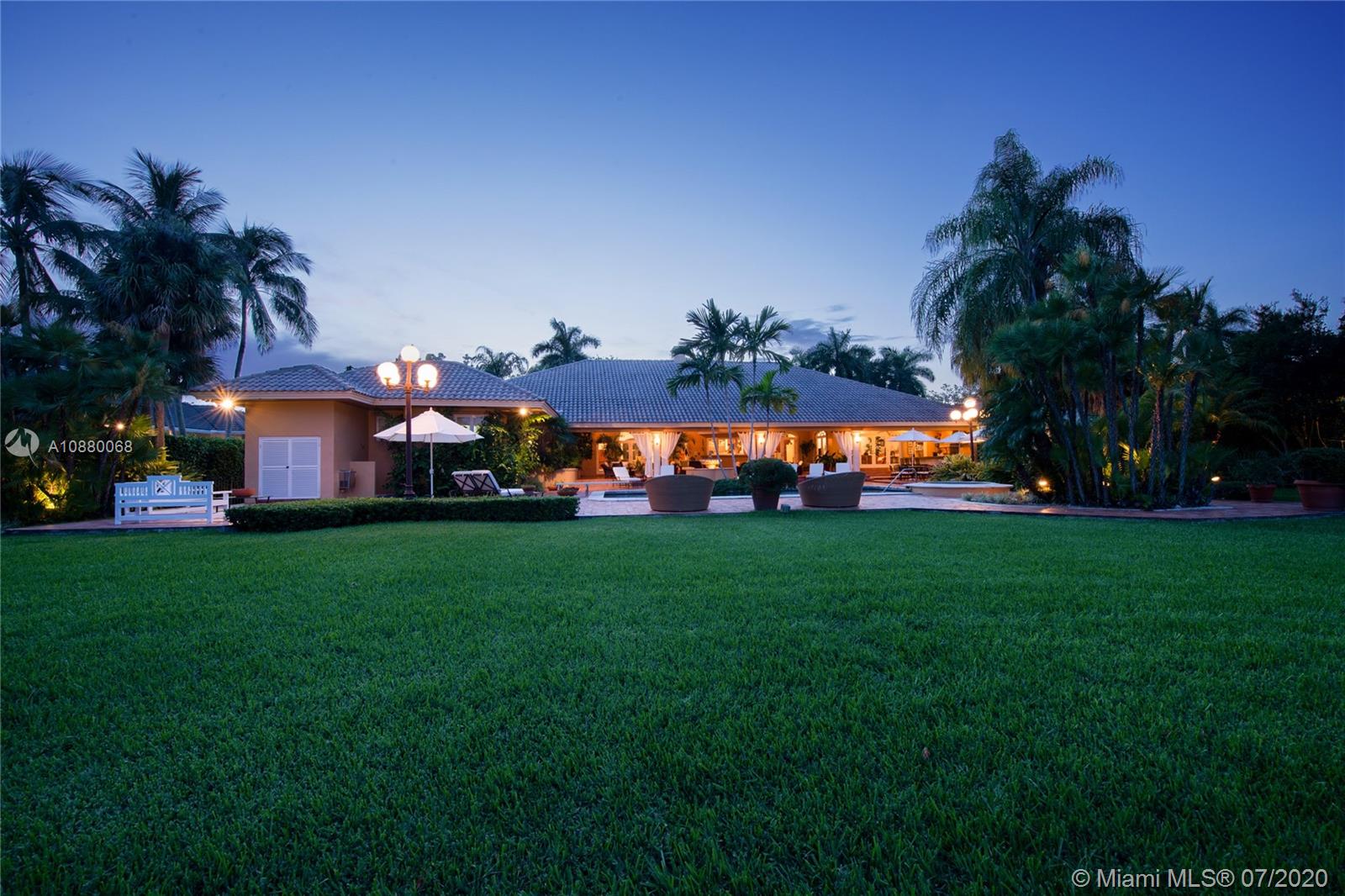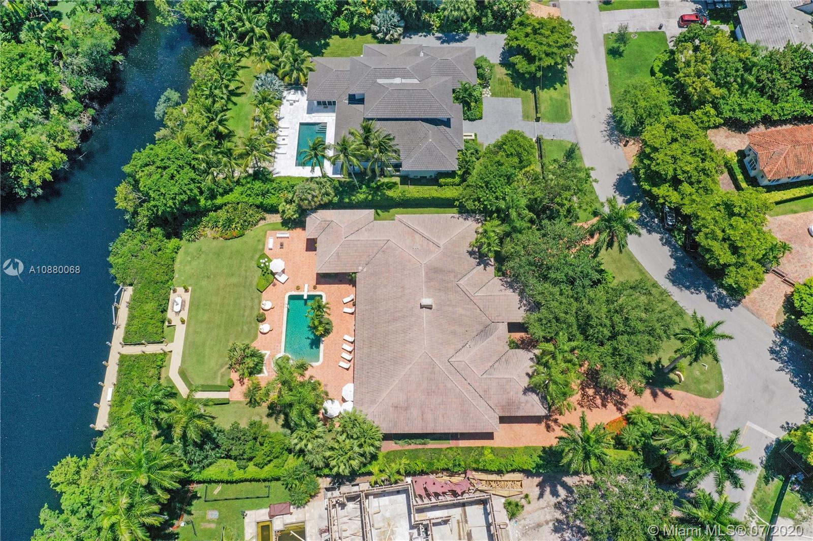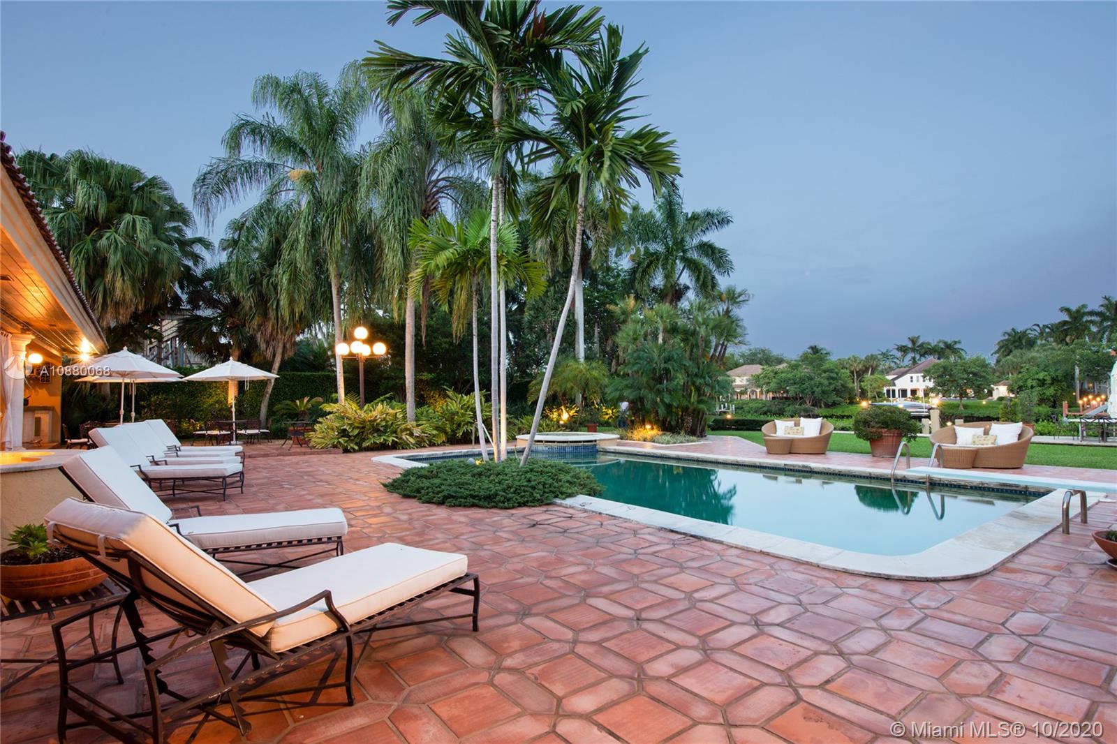 Waterfront coveted 1 story house in Cocoplum I gated community. Brick circular driveway with porte cochere. Transitional/Mediterranean style. Honed limestone and wood floors. 5 bedrooms, 5 1/2 baths and 2 car garage, with additional office and playroom. Expansive main suite and marble bath with dual sinks overlook the water. High ceilings throughout the house. Corridors are wide to display art. Security cameras. Meticulously maintained. One of the largest covered terraces in the community with Summer Kitchen and large dive in pool. Lot is .73 acres and dock is 80 feet with davits. 138 ft water frontage. Expansive wide canal water views from almost every room in the house. Only minutes to Key Biscayne by boat and close to Downtown, C. Grove and the Beaches. Enjoy the best of coastal living.