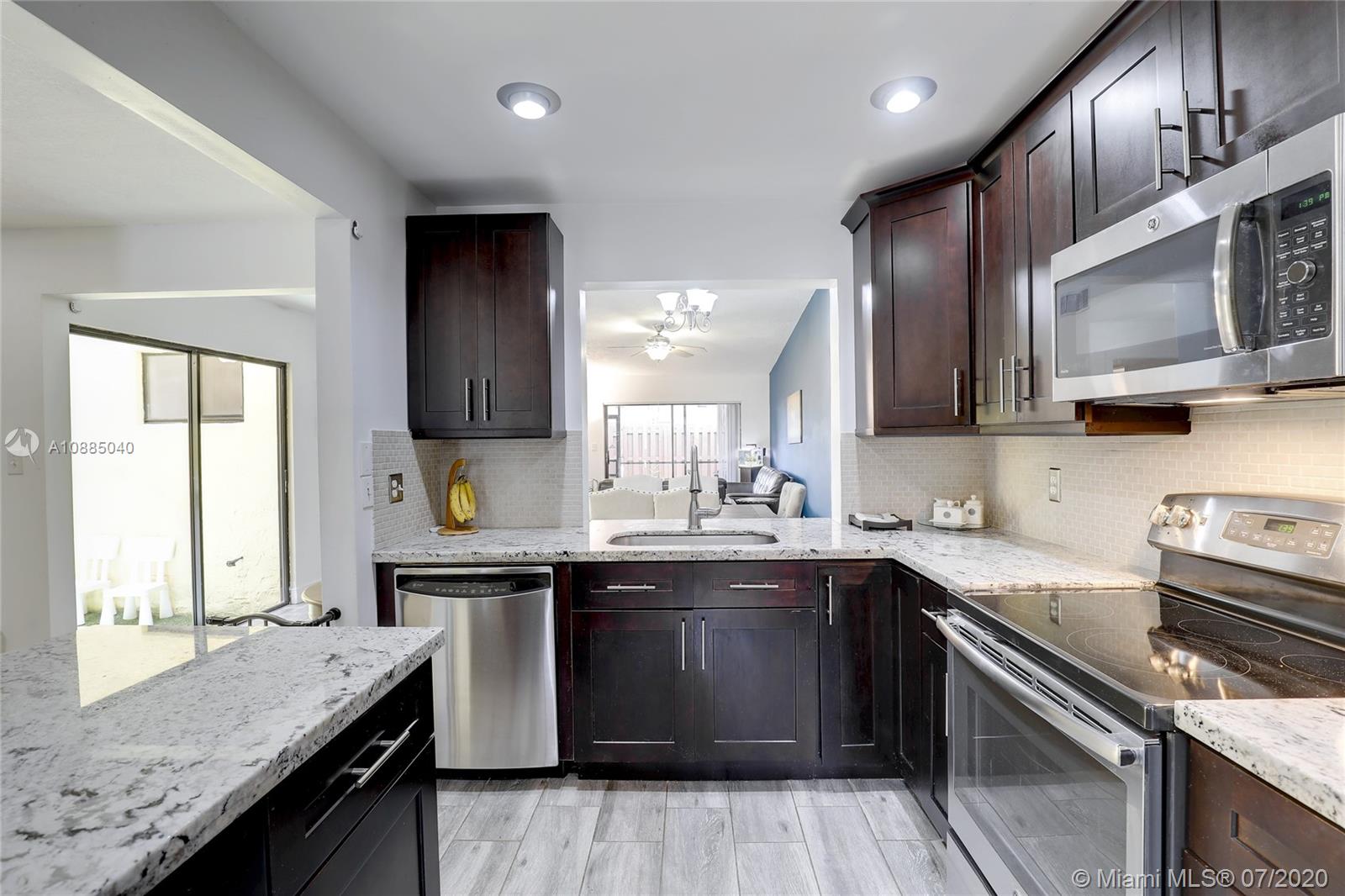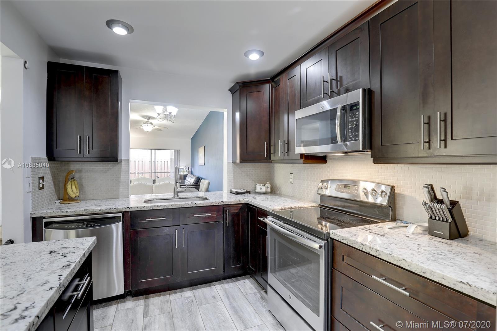 This updated 2 bed, 2 bath with a large den, and center garden area is perfect for relaxing after work or entertaining with friends. The kitchen has new cabinets with granite countertops and beautiful tile floor throughout the open living area. Ceramic floors 2015, renovated kitchen with new appliances and granite countertops 2015, ceiling popcorn removed 2015, master bathroom renovated 2018, Atrium deck area With turf 2020, Bookshelf in den 2015, and tool shed inside the screen area 2019, Smart AC thermometer Nest upgraded 2019. Heater 2017, There is a private screened-in porch and small grassy area for 4-legged family members. Backyard fence 2017.
