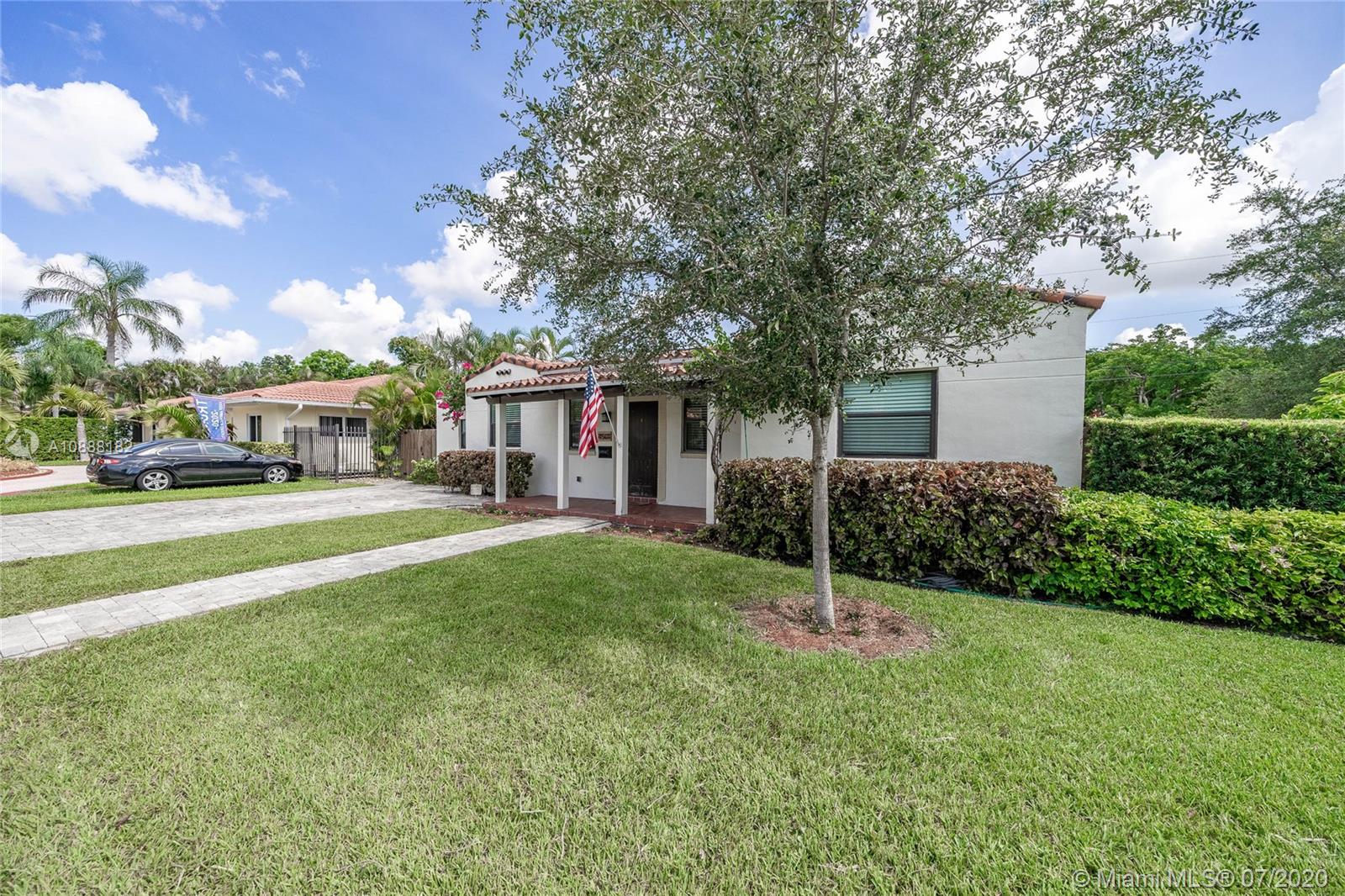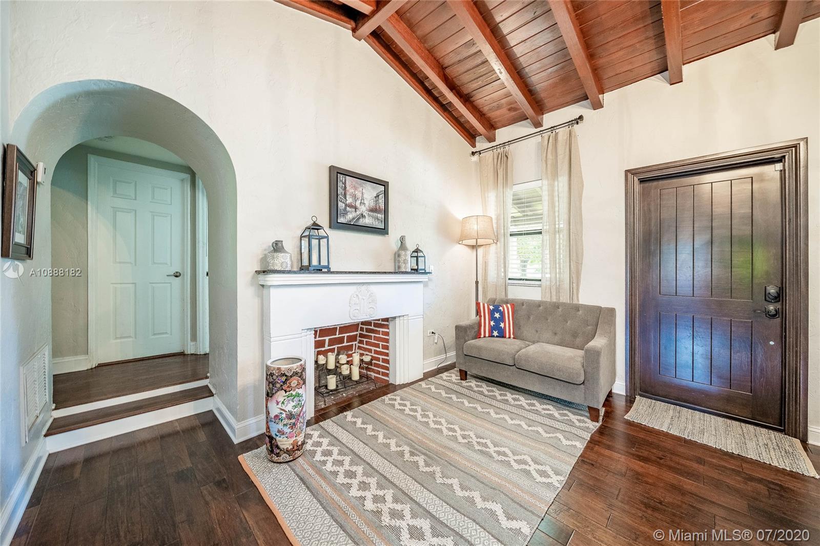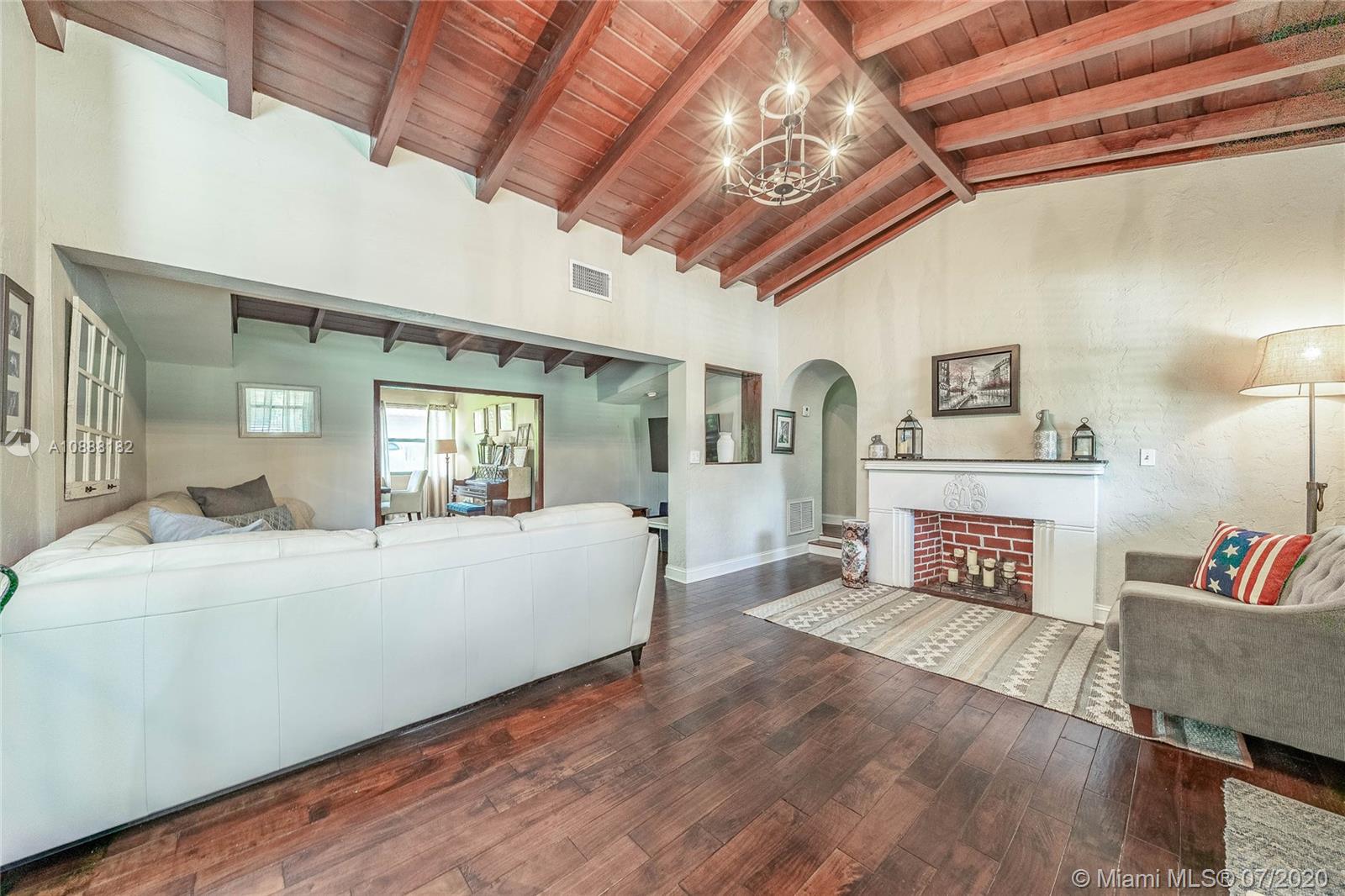 Charming 2 bdrm/ 2 bath, plus office, home perfectly situated in Little Gables. Impact windows and doors, PVC plumbing, newer roof and many other recent upgrades. Delightful living room with fireplace, exposed wood beam, vaulted ceilings. Kitchen opens to dining area and access to the office/playroom/den. Indoor laundry/utility room with storage. Florida room perfect for formal dining or family room. Lovely wood flooring in the living areas and bedrooms. Master has large walk in closet. Guest bedroom is spacious. Room to add on or put in a pool. Fenced back yard with covered paver patio. Paver driveway, corner lot. Steps from Coral Gables. A fantastic investment. Visit https://my.matterport.com/show/?m=SJtBPh9HfDF&brand=0 to view the 3D virtual tour and floorplan.