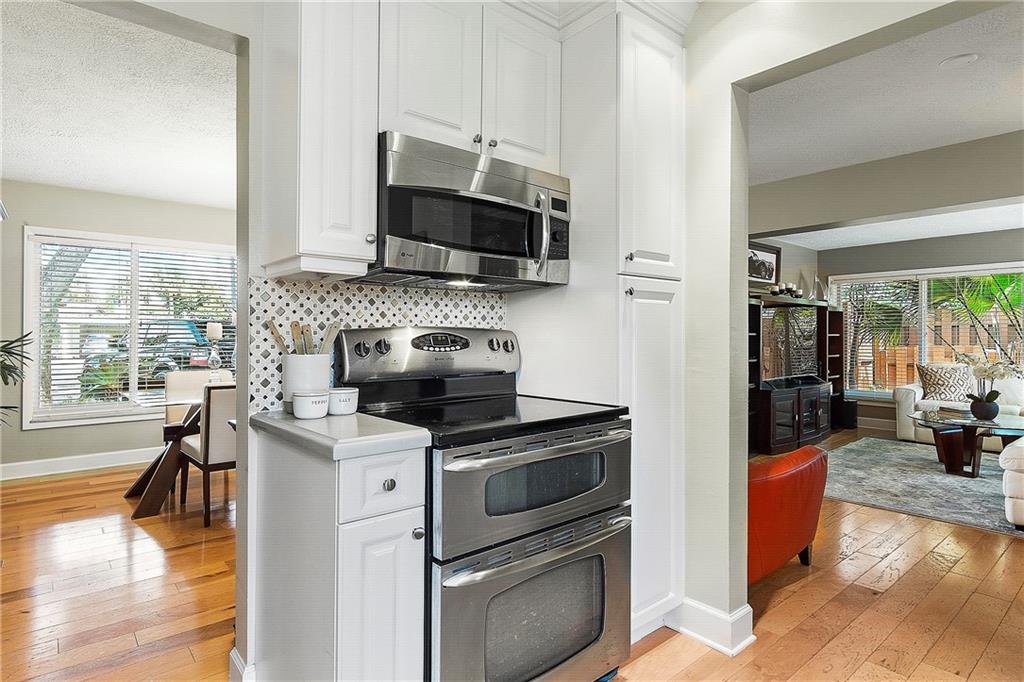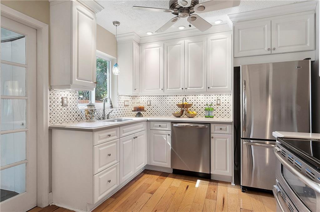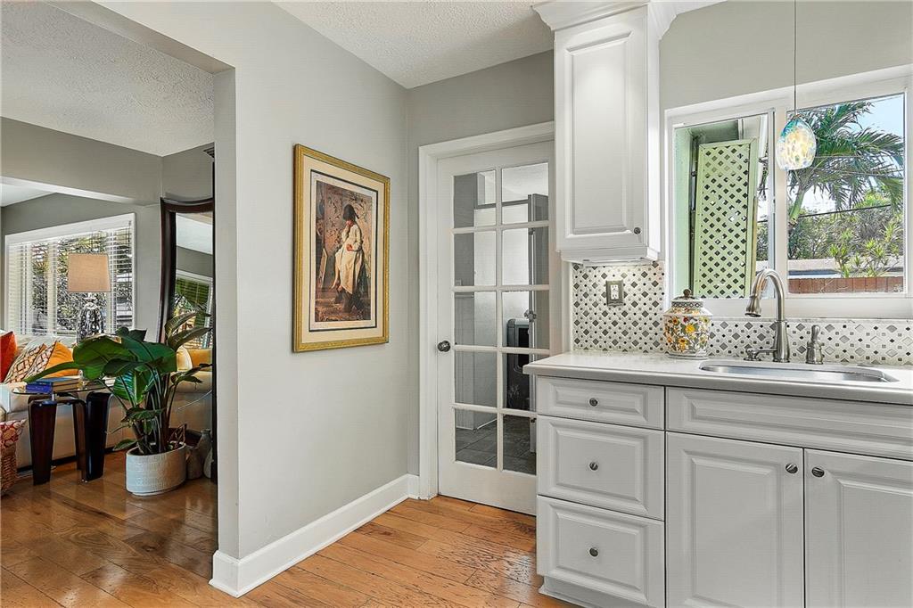 Welcome Home, from the minute you arrive you will fall in love with this tropical paradise, two legacy Olive trees are the focal point for architectural landscaping design, open floorplan, lots of natural light, nature views from every room, hickory wood flooring throughout, remodeled high-end kitchen with Caesarstone/quartz countertops, custom backsplash, ceiling-high cabinets, custom pantry, new s/s appliances, freshly painted throughout, upgraded bathrooms, with master bath featuring jacuzzi jetted tub, designer fixtures, custom blinds, upgraded hurricane doors, the backyard is a tropical oasis with a $60K+-pool package, designer marble pool with custom water features and beach area, storage shed w electric, fenced w/double gate backyard access, camera security system. A MUST SEE!
