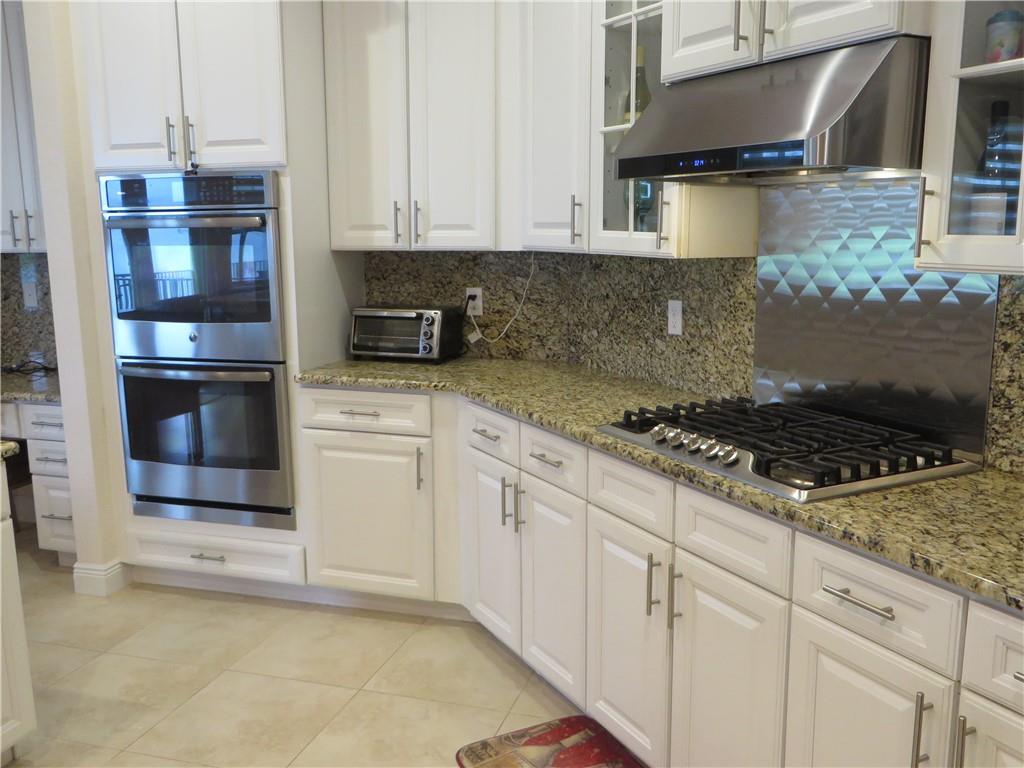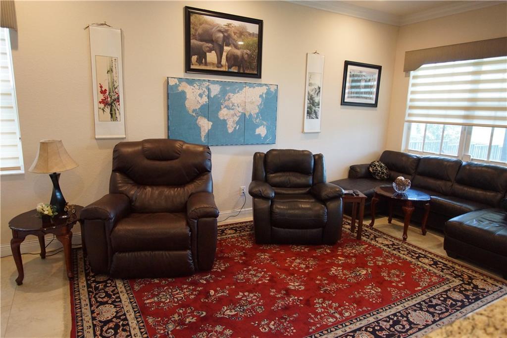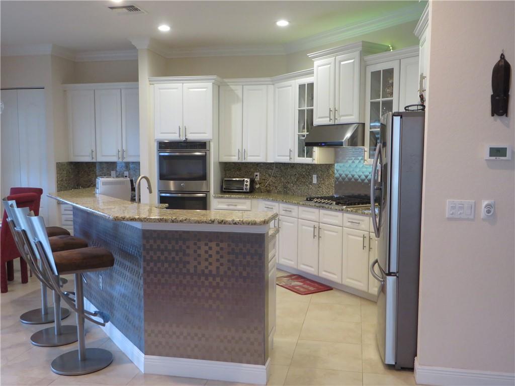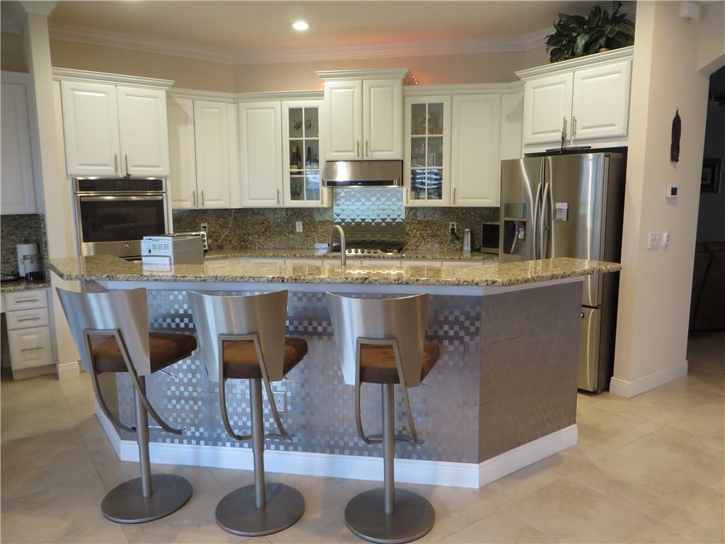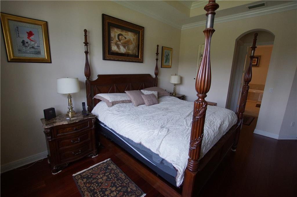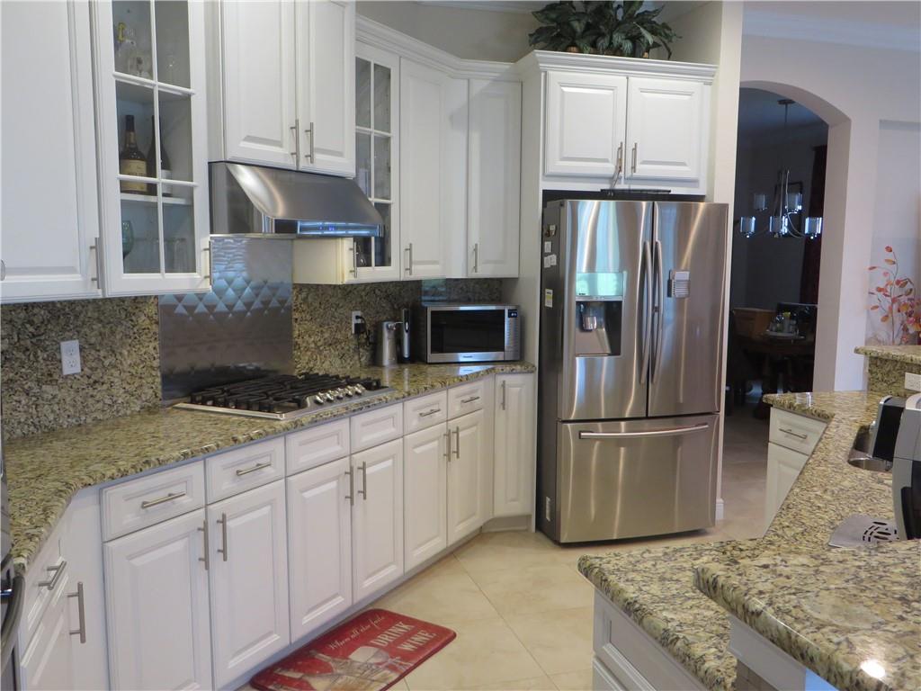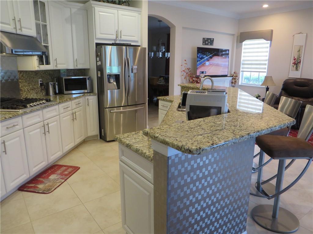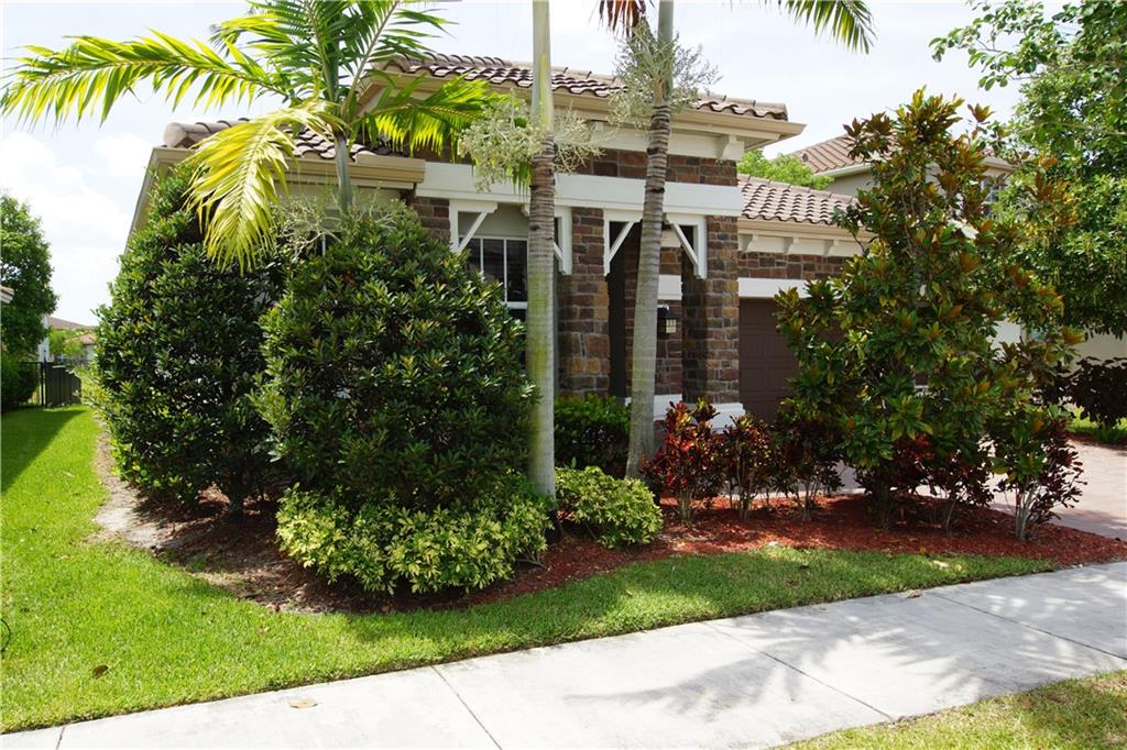 Mira Lago 4 B/R, 3 Bath, 2 Car Garage, Waterfront. Carlyle Model with Stone elevation, Exterior just repainted in June. 42” white kitchen cabinets with glass fronts, granite counters/backsplash, just added ductless range hood and stainless island counter tile, 30 cu ft Samsung refrigerator and 5 burner gas cooktop. 20” porcelain tile and Brazilian Cherry wood flooring in all bedrooms. Large master suite offers 2 walk-in closets, glass-enclosed shower with NEW upgraded Shower Massage Panel & Jacuzzi Roman tub. Crown molding throughout. French doors on office (4th b/r). All impact windows and glass front door! 12x24 Pergola attached to relax on great view of the lake. Gas for cooking, dryer and tankless hot water heater. Buyer to pay one time Capital Contribution of $1,000 to HOA at closing