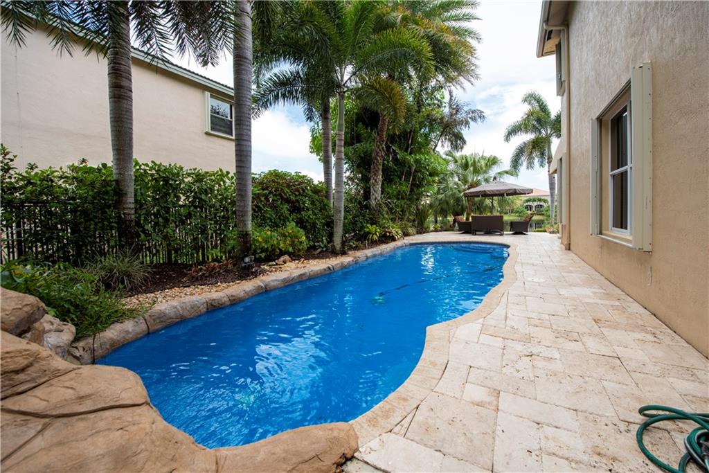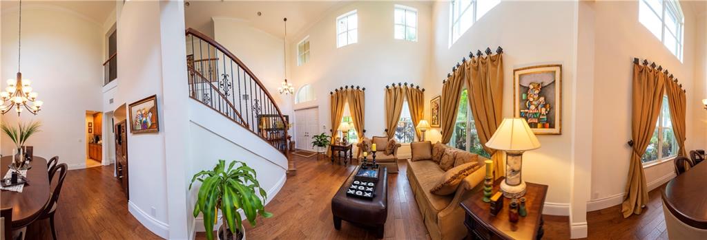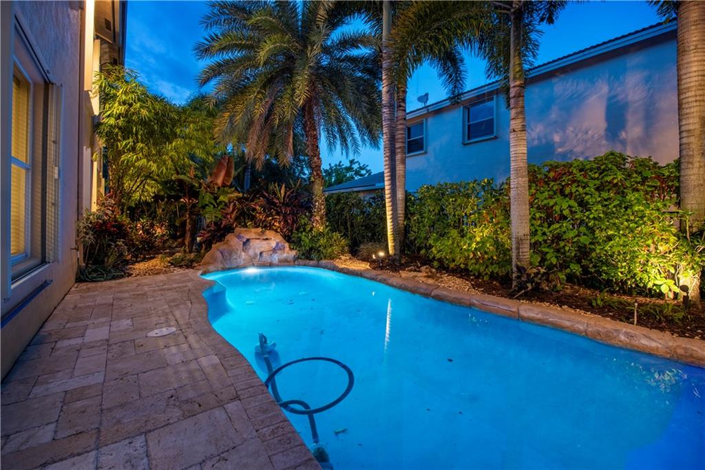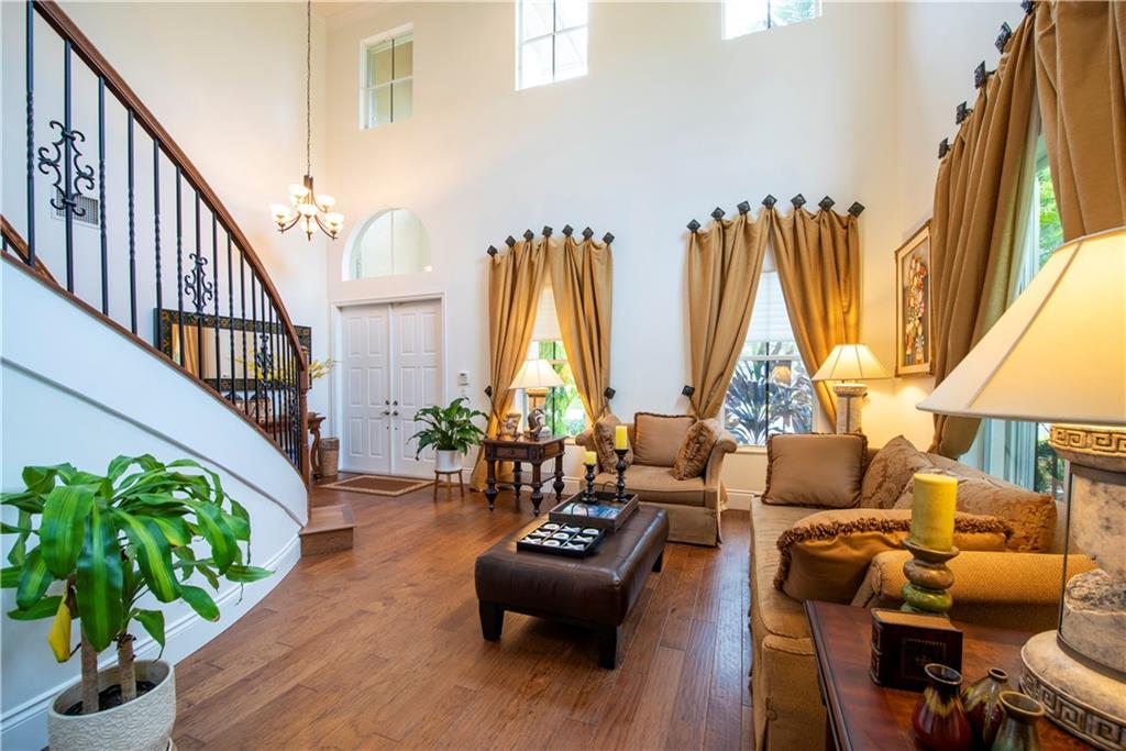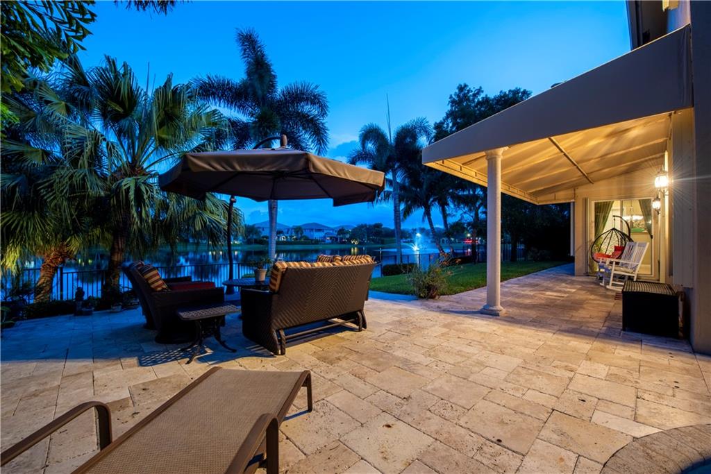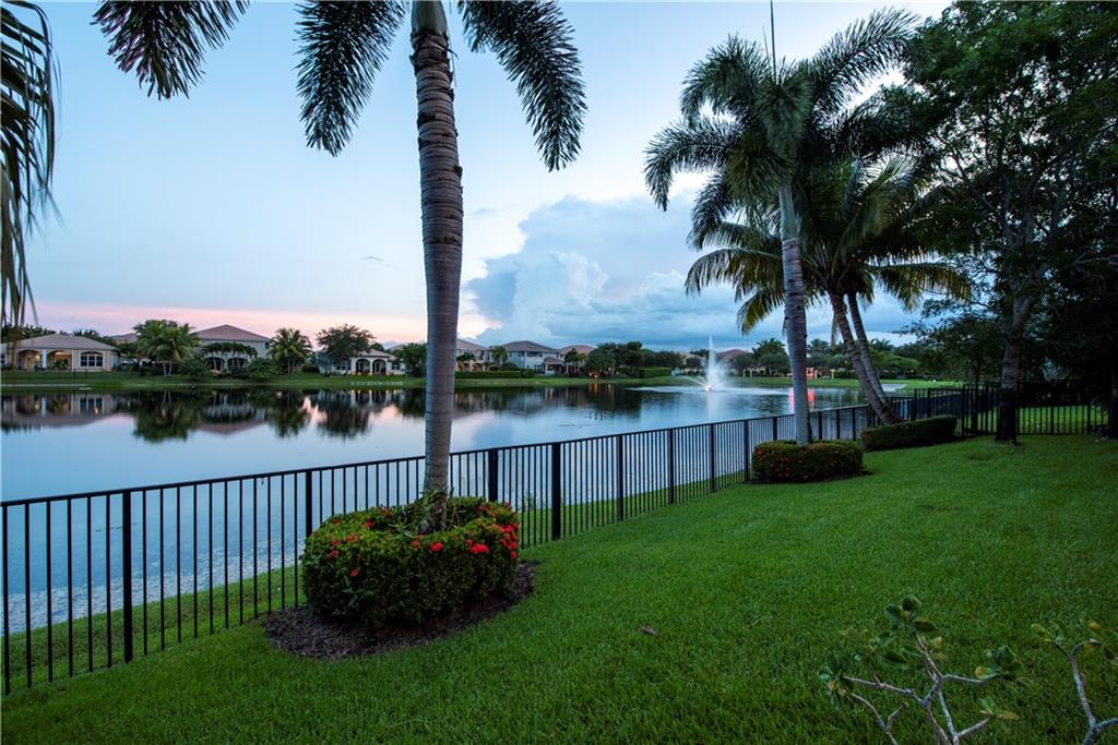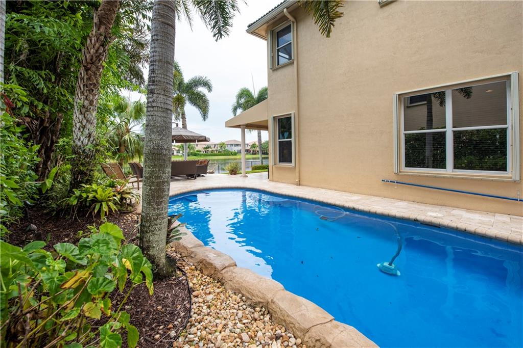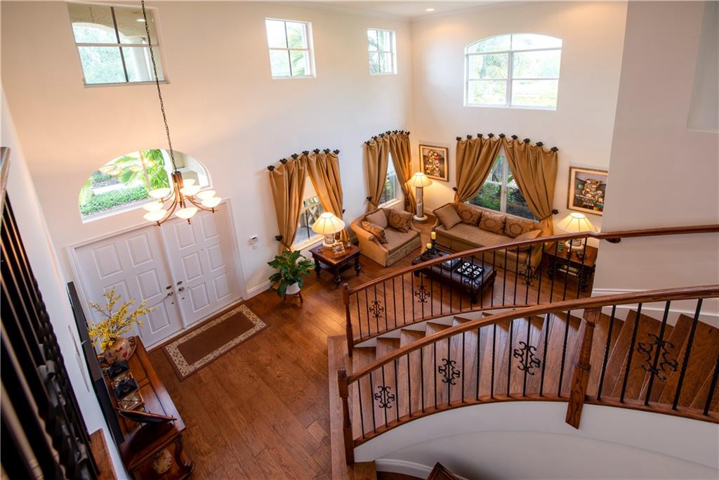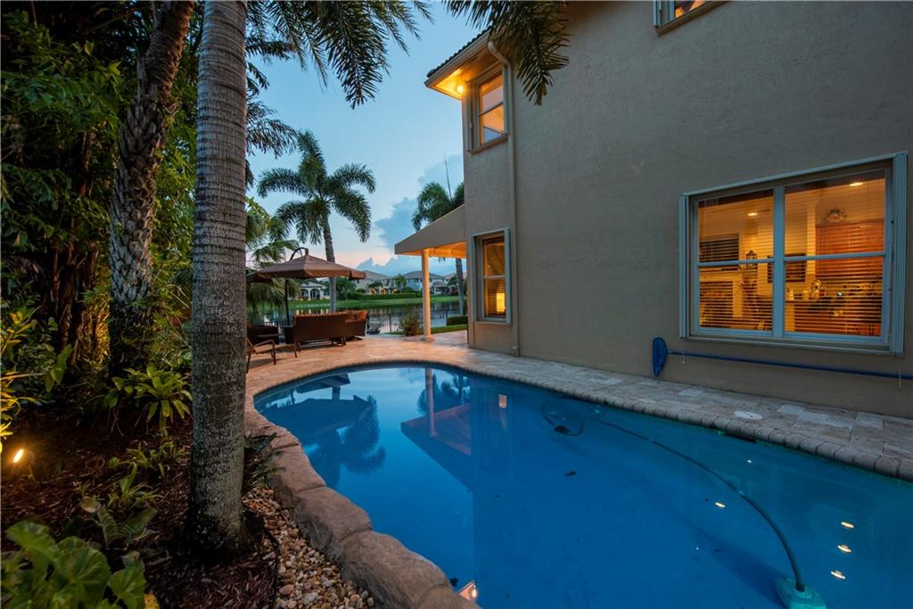 Elegant 6 bedroom, 4.5 bath, huge waterfront beauty with waterfall pool, patio & beautiful lawn overlooking lake & fountain. Largest 2-story model w/ soaring ceilings & foyer featuring a stunning circular staircase foyer with wrought iron hand rail & gorgeous wood floors. A regal living room, dining room, & gourmet kitchen with butler pantry all highlight this spectacular entertaining home. A large ensuite 6th bedroom, family room & extra den round out the lower living area. Upstairs is an expansive master suite w/ double vanity bath, office, & large private balcony over-looking the lake...along with an additional 4 bedrooms/office. Lush landscaping/lighting, SWAT mosquito system & solar-heated saltwater pool make for resort living! Full accordion shutters. Private, gated w/ A schools.