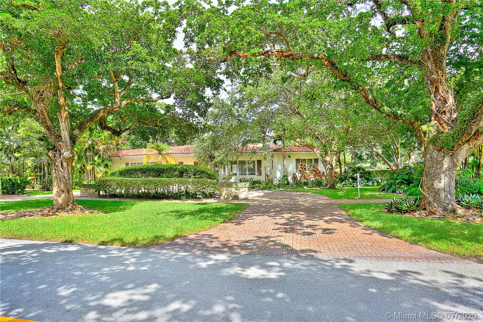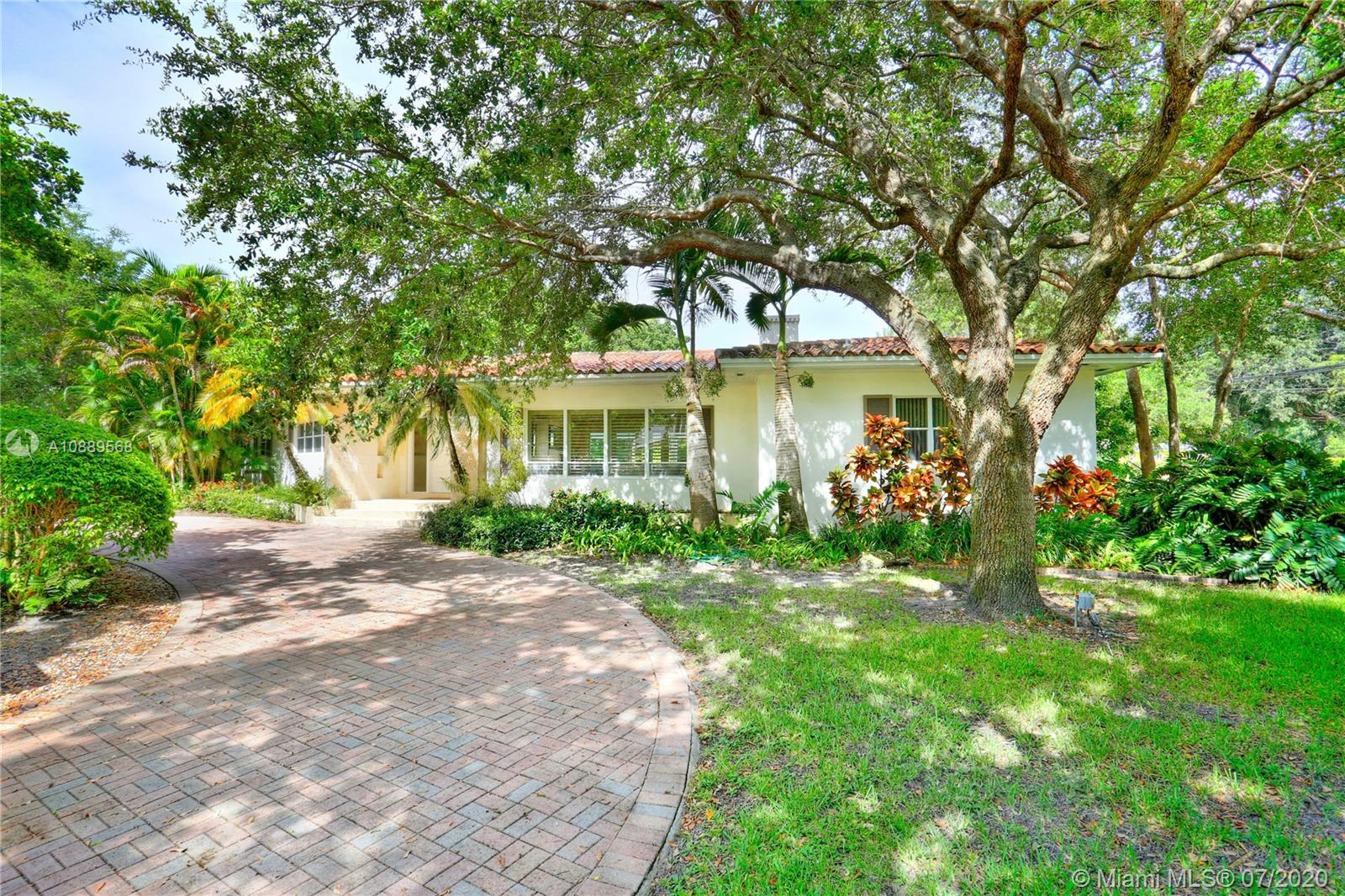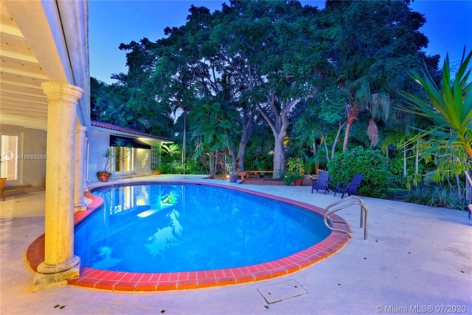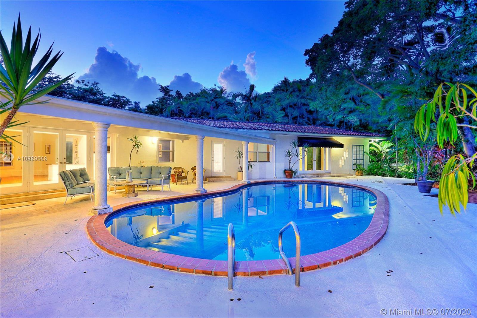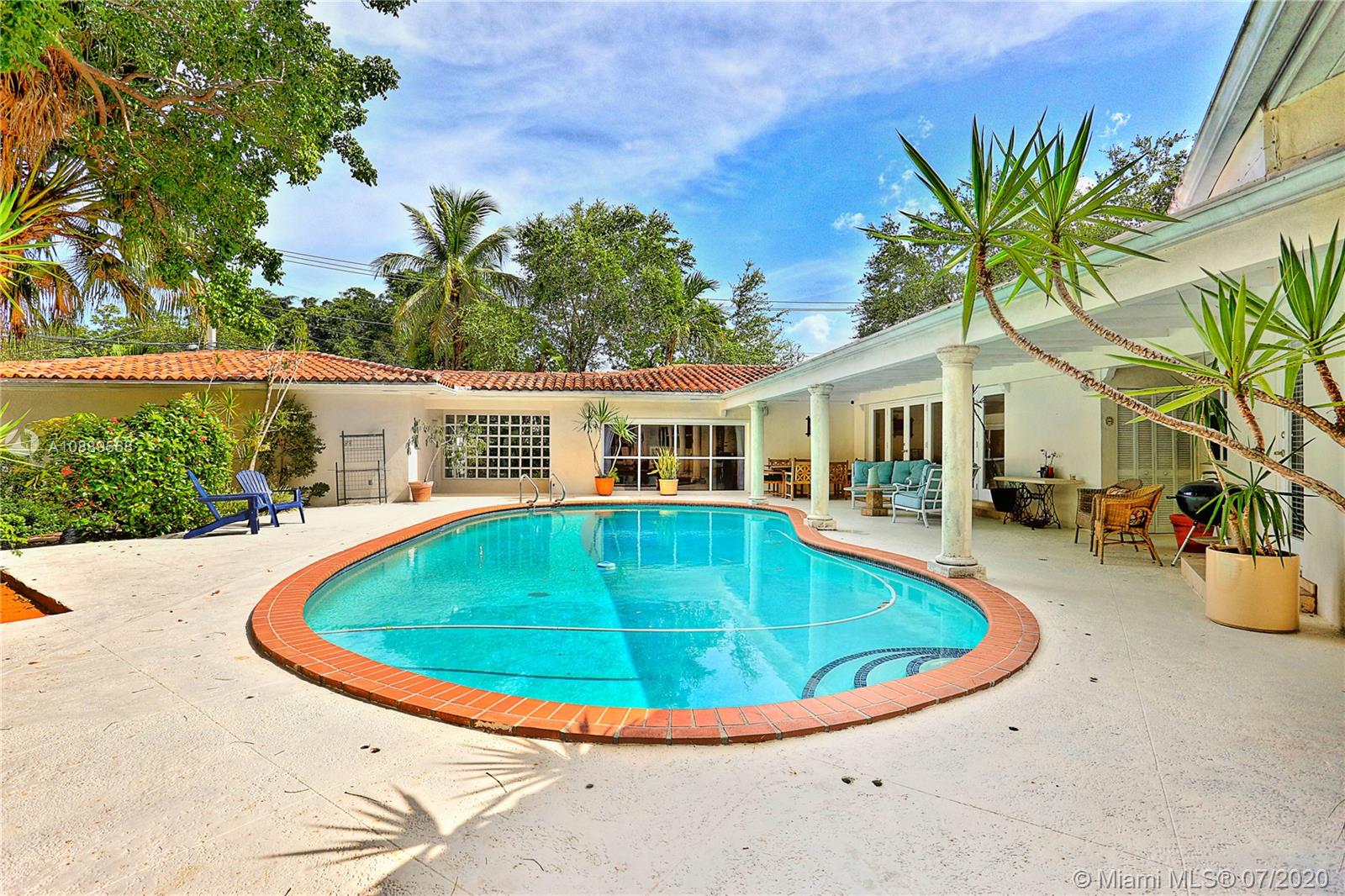 This lovely, spacious, & well maintained 4 bed/4 bath corner home with pool nestled in South Coral Gables sits on a half-acre lot (19,200 sq ft lot). With an open living to dining area featuring wood high ceilings, it naturally flows out to a spacious terrace accessible from many points. Features: marble & wood floors, fireplace, split floor plan, an oversized 2-car garage equipped with an electric vehicle charging station. Updated kitchen with s/s appliances, granite countertops, breakfast nook & an adjacent laundry room. The Family room has a built-in wet bar & an updated bathroom. The Master Suite has 2 large walk-in closets. Two of the bedrooms share a Jack & Jill bathroom. The lush backyard has a built-in deck surrounding beautiful gumbo limbo trees, perfect to relax & entertain.