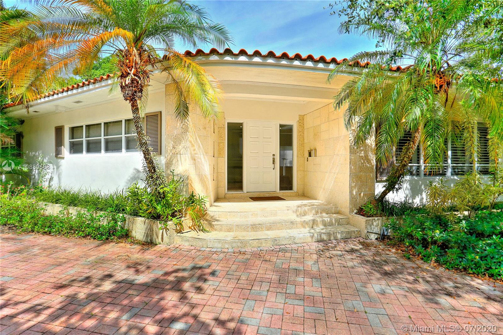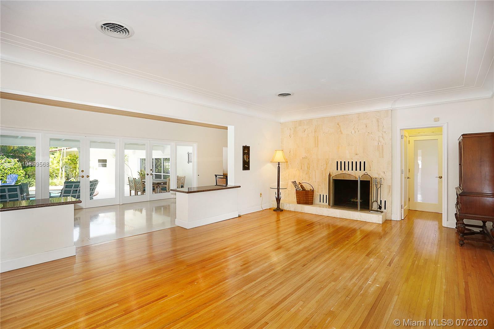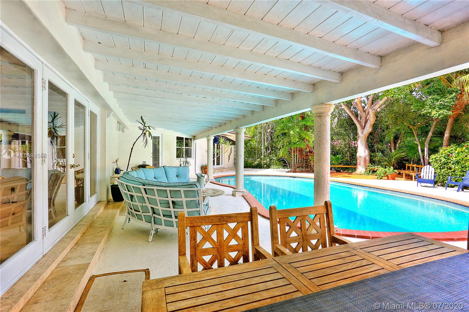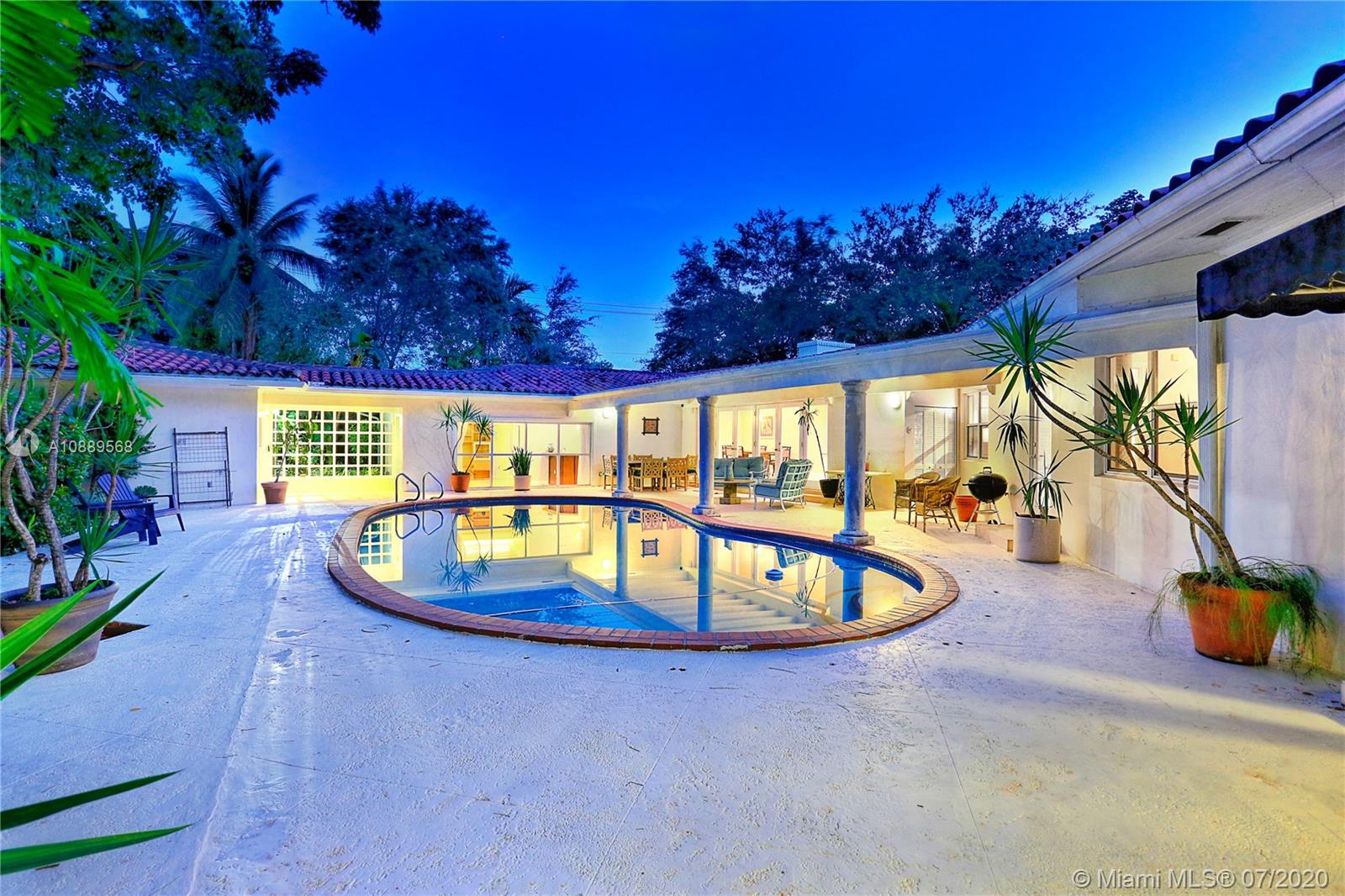 This lovely, spacious, & well maintained 4 bed/4 bath corner home with pool nestled in South Coral Gables sits on a half-acre lot (19,200 sq ft lot). With an open living to dining area featuring wood high ceilings, it naturally flows out to a spacious terrace accessible from many points. Features: marble & wood floors, fireplace, split floor plan, an oversized 2-car garage equipped with an electric vehicle charging station. Updated kitchen with s/s appliances, granite countertops, breakfast nook & an adjacent laundry room. The Family room has a built-in wet bar & an updated bathroom. The Master Suite has 2 large walk-in closets. Two of the bedrooms share a Jack & Jill bathroom. The lush backyard has a built-in deck surrounding beautiful gumbo limbo trees, perfect to relax & entertain.