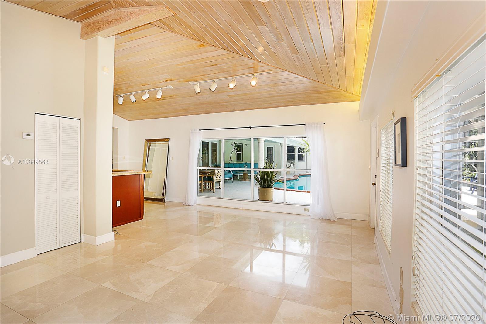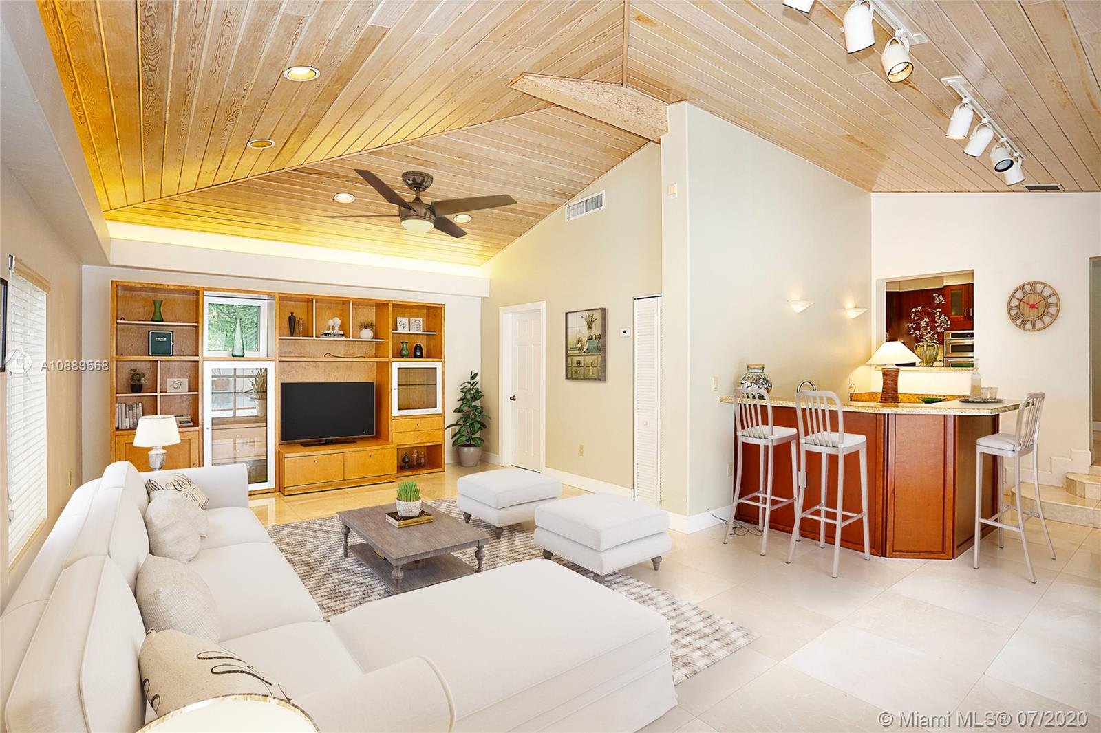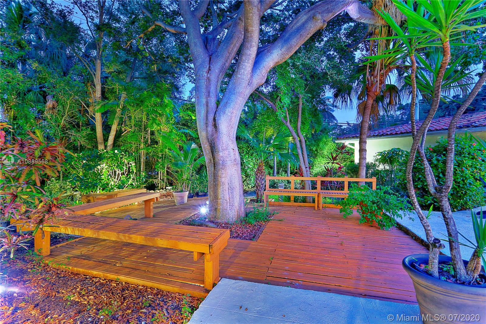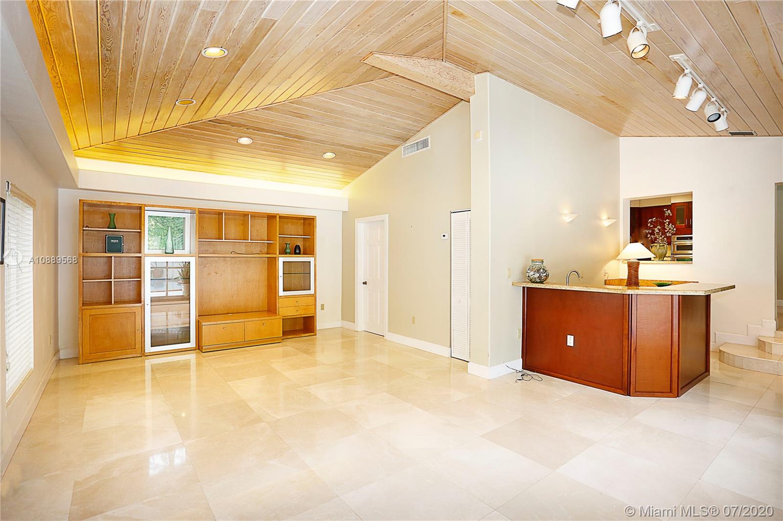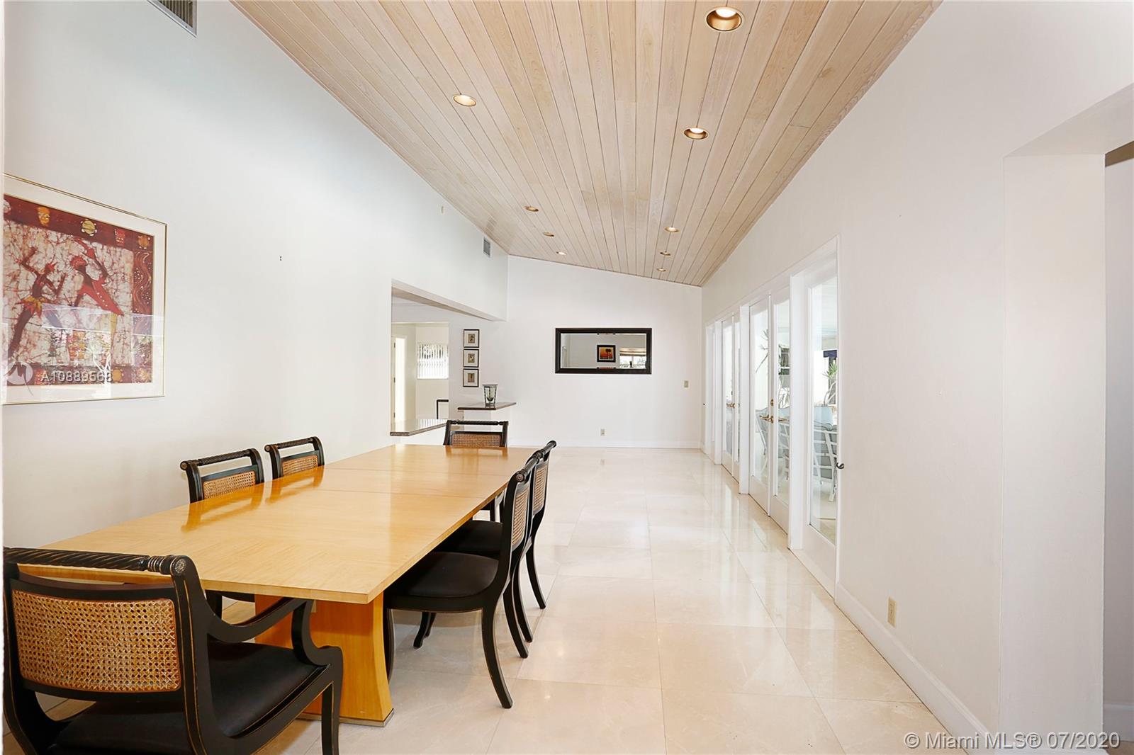 This lovely, spacious, & well maintained 4 bed/4 bath corner home with pool nestled in South Coral Gables sits on a half-acre lot (19,200 sq ft lot). With an open living to dining area featuring wood high ceilings, it naturally flows out to a spacious terrace accessible from many points. Features: marble & wood floors, fireplace, split floor plan, an oversized 2-car garage equipped with an electric vehicle charging station. Updated kitchen with s/s appliances, granite countertops, breakfast nook & an adjacent laundry room. The Family room has a built-in wet bar & an updated bathroom. The Master Suite has 2 large walk-in closets. Two of the bedrooms share a Jack & Jill bathroom. The lush backyard has a built-in deck surrounding beautiful gumbo limbo trees, perfect to relax & entertain.
