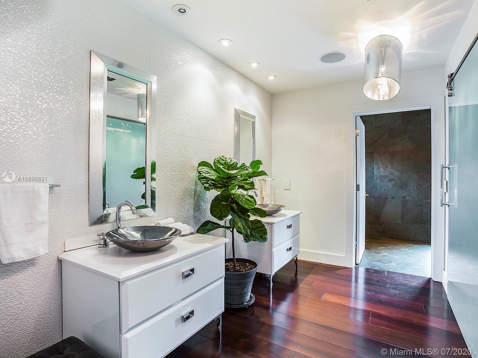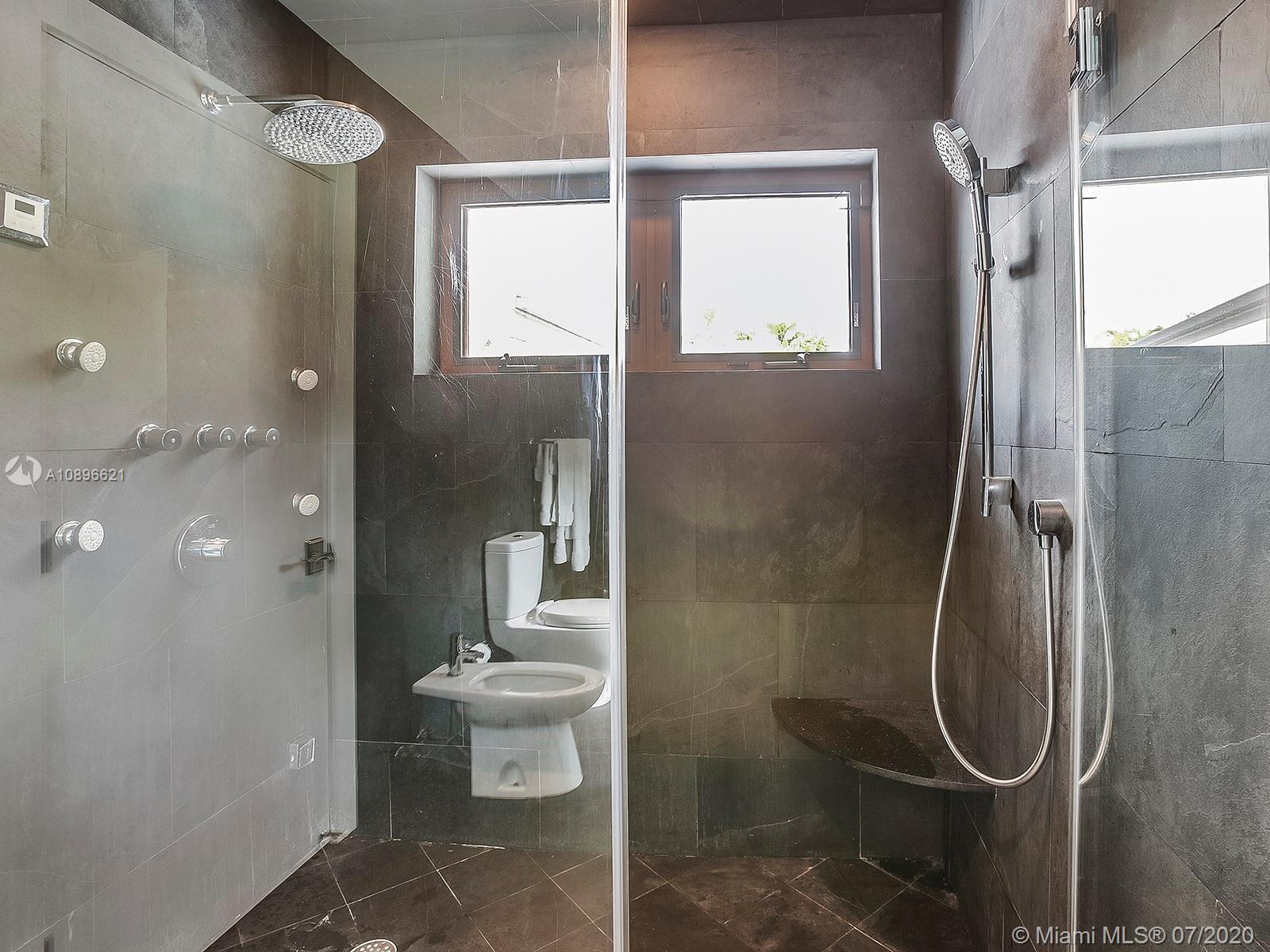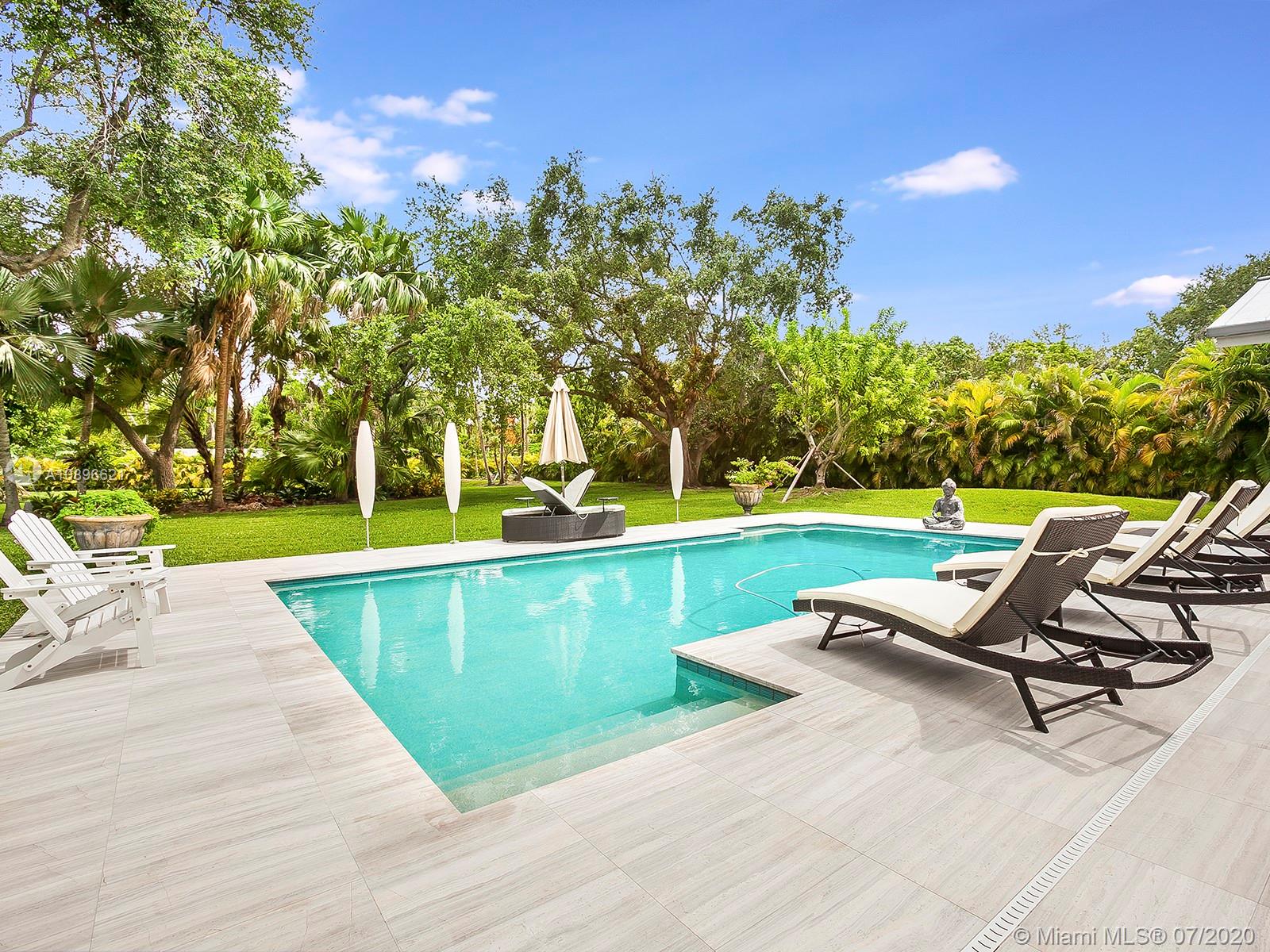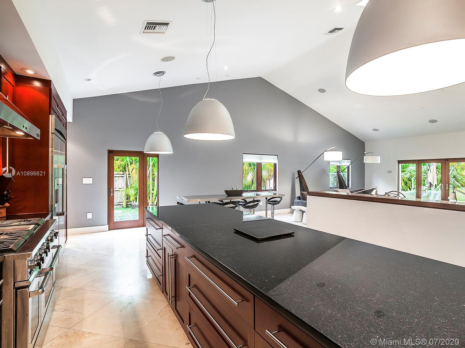 Welcome home to a fabulous floor plan w/ grand double door entrance & a chic open-concept, with a lot of natural light due to over 15' vaulted ceilings & 3 skylights throughout. Completely renovated in 2013, every detail of this flawless home was carefully selected by a professional interior designer. Walking distance to Palmetto Elementary, Middle, and High School. This gated home features 4 big BR +service room/6.5 baths, walk-in-closets, crema marfil italian marble, wood floors in the bedrooms, impact windows/doors, roof redone (2013), laundry room, pool, a chef's kitchen w/Thermador and Jenn-Air appliances, a state of the art music system throughout, alarm system on screens & much more. Stunning fixtures and a custom-built bar included, magnificent spaces for family gatherings!