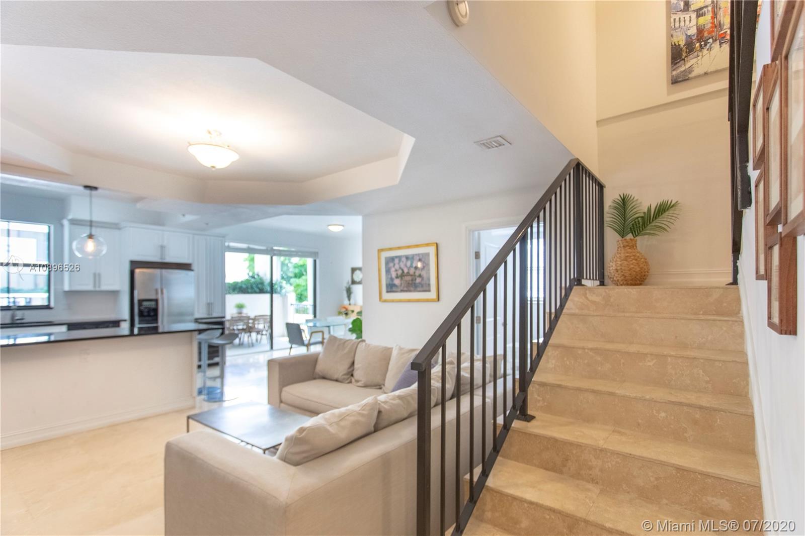 Stunning townhouse in the heart of Coral Gables. This beautiful two-story property features 3 beds and 3 full baths with beautiful marble floors and two oversized terraces, one on each floor. The kitchen has been fully upgraded with beautiful white cabinets, granite countertops, and white tile backsplash. The Master bedroom has its own private oversized terrace and a master bathroom with double sinks, jacuzzi, and a separate shower. Impact doors and windows. Security access through the lobby. Two safe and secure underground tandem parking spaces. Bulosng amenities include pool, Fitness Center, and Private Office with free internet for use of owners. Close to shops, parks, schools, and restaurants. Don't miss out on this outstanding opportunity!