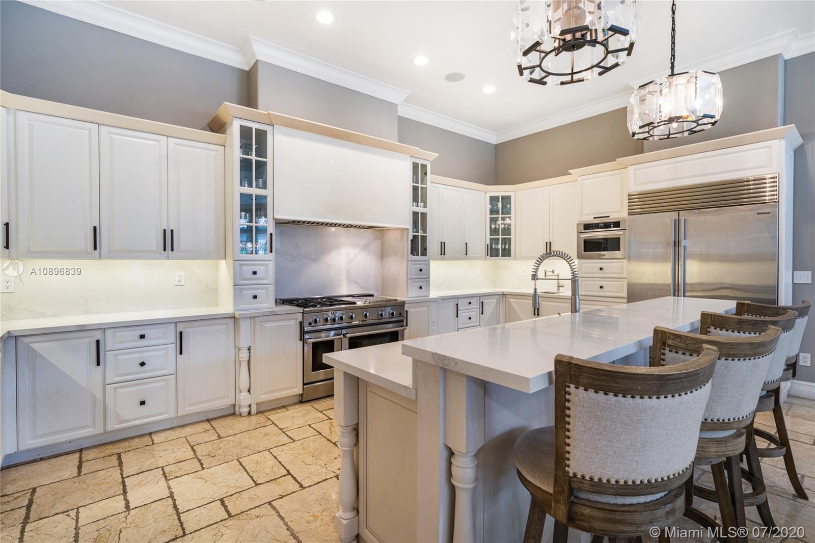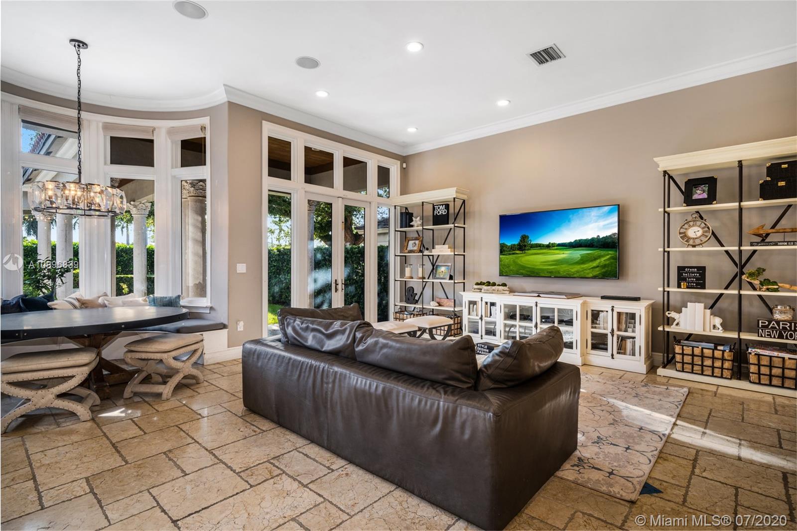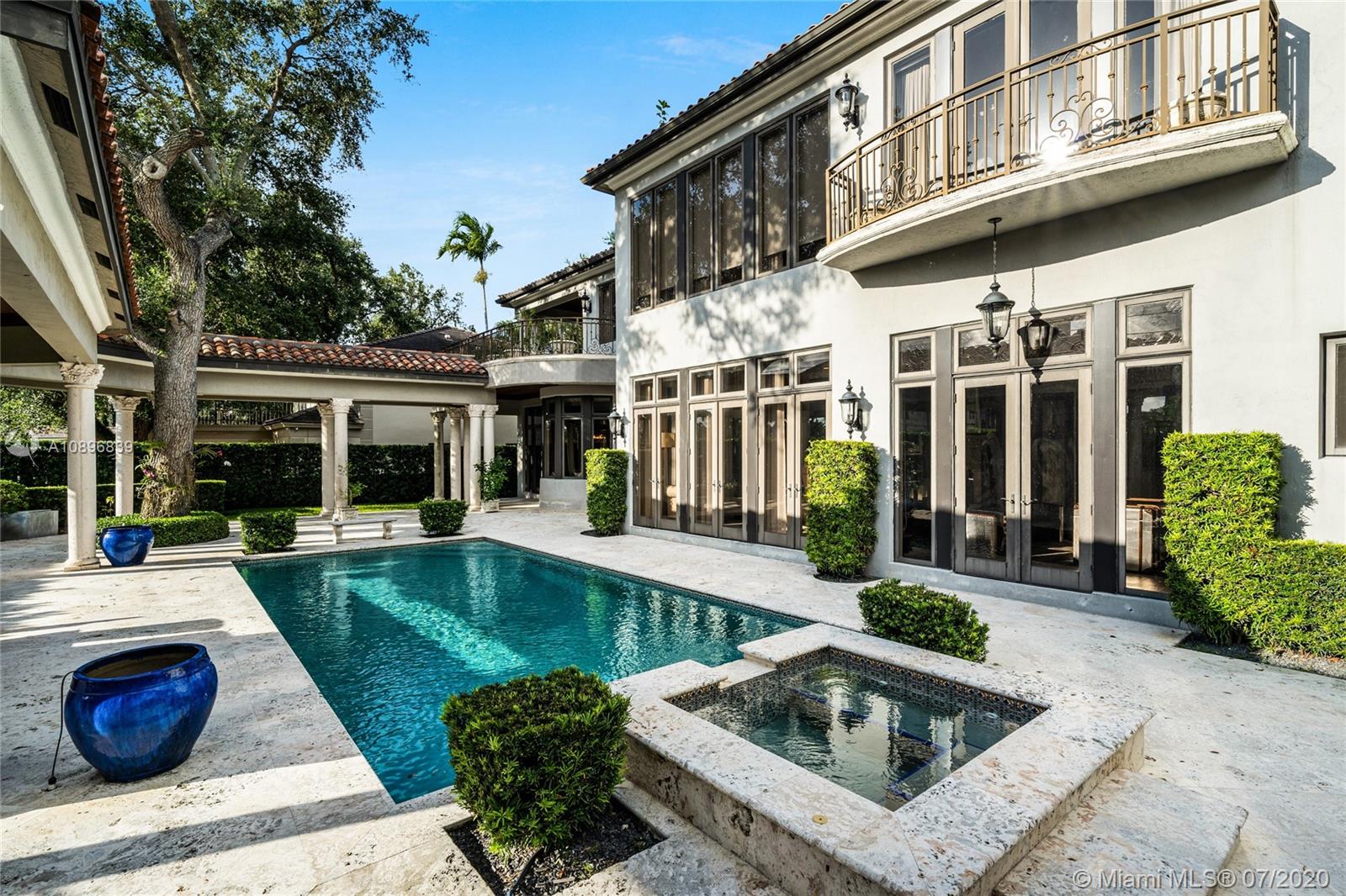 Built in 2008 and designed by Architect Thomas Benedict, this charming Estate Home is located in the heart of the Gables set directly in front of the 5th hole of the Riviera Golf Course. With more than 5,800SF of living space this home has 6 bedrooms, 6.5 bathrooms, formal dining with adjacent wine cellar, fireplace, elevator, eat-in gourmet kitchen with family room, high ceilings, upstairs sitting area, surround sound system and more. Enjoy a private outdoor oasis with a covered patio surrounding the heated pool and spa, Summer kitchen with outdoor fireplace and a separate 1 bedroom, 1 bathroom pool house all overlooking the Riviera Golf Course.