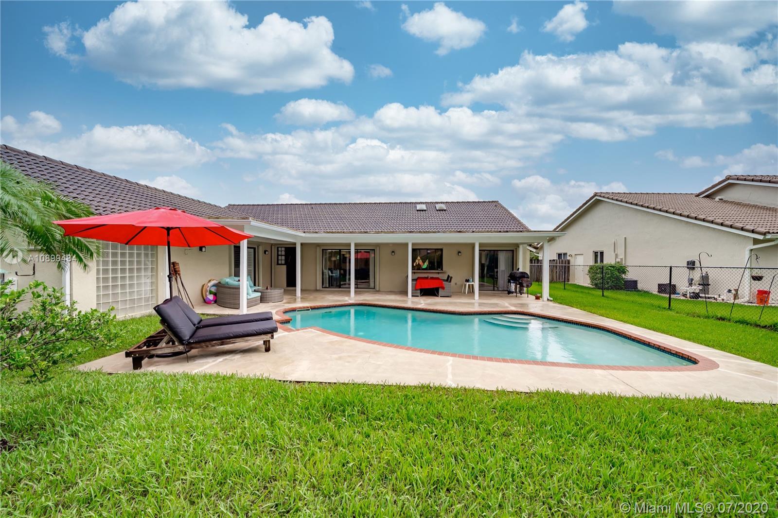 Amazing 4/2 in the Fabulous neighborhood of Jacaranda Lakes. Open floor plan with vaulted ceilings in the main living areas which are perfect for entertaining. Eat-in kitchen with granite countertops, wood cabinets, and S/S appliances. Stacked bedroom plan with neutral tile in all living areas & vinyl, and carpet in the secondary bedrooms.. Large master suite w/wood floors, walk-in closets, & updated master bath. Second bathroom has also been updated. Extended patio w/spectacular views of the pool and backyard. The roof was replaced in 2006, and one newer AC. Home has hurricane protection including 90% accordion and a few panel shutters. Low HOA and the list goes on.