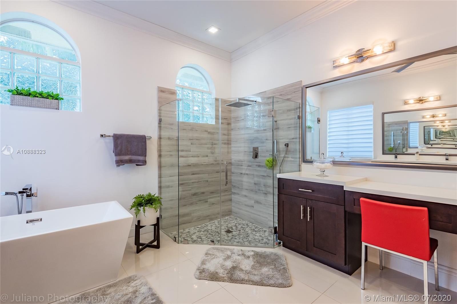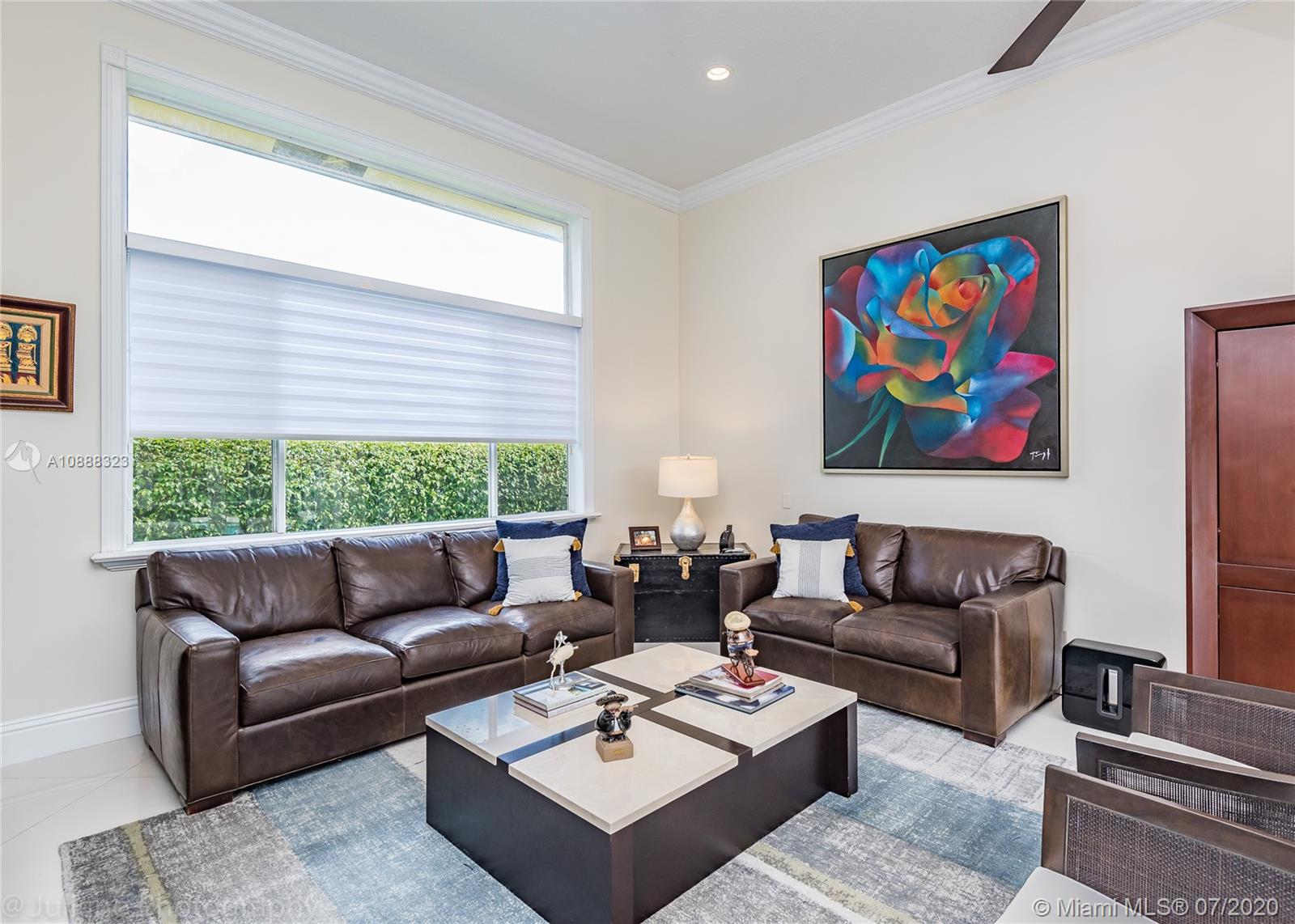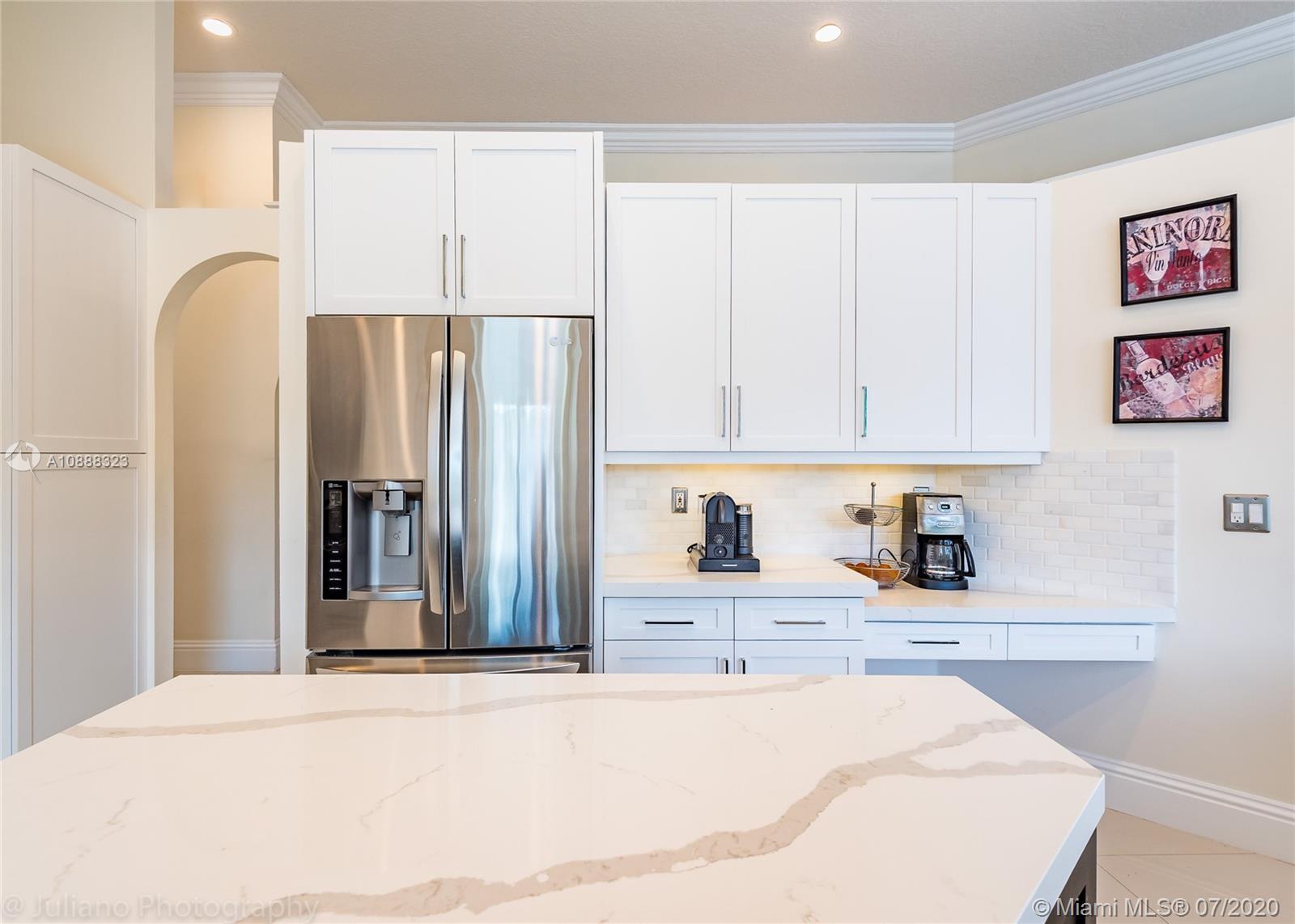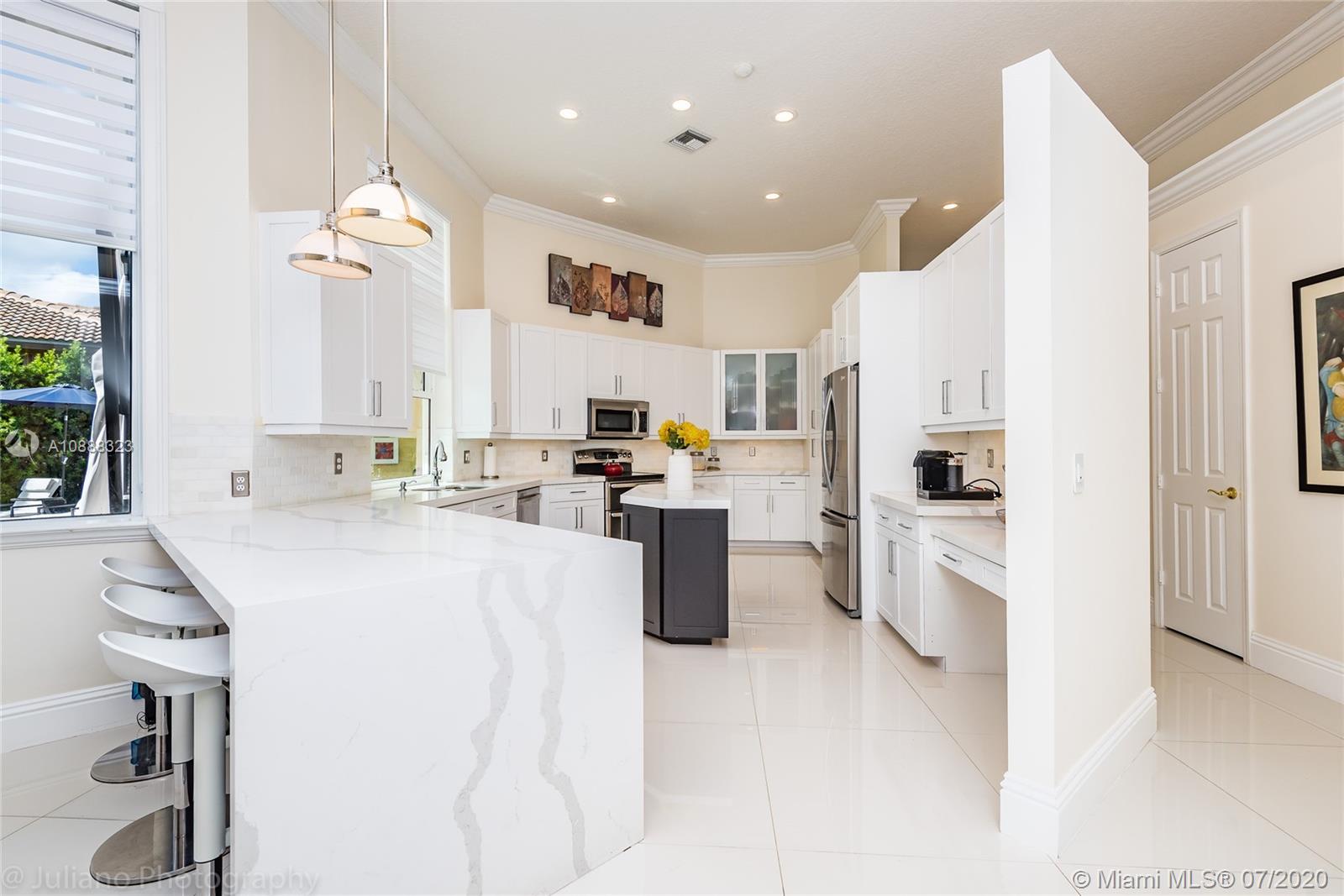Custom built expanded Kingsley model features four spacious bedrooms plus an office and playroom with 3.5 baths. Enjoy lush tropical landscaping and 11.000 square foot lot fully fenced with expansive renovated salt pool with intelligent control trough your mobile, extended paver pool deck, summer kitchen under a gazebo and long unobstructed lake views with no neighbors behind. Master bedroom with soaring ceilings. Recently renovated Contemporary kitchen with white marble countertops, stainless steel appliances flows to family room with sliders to yard, neutral tones throughout. BRAND NEW custom master bath with vessel tub and oversized shower. This home shows bright and airy. Enjoy extensive crown moldings, marble floors, hurricane shutters, 3 car garage. Must See!