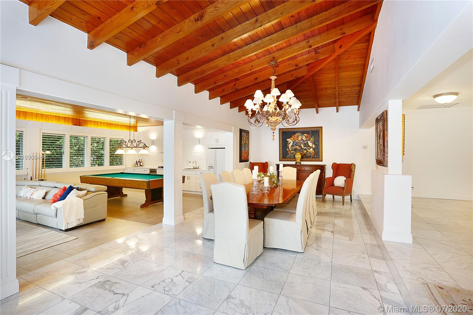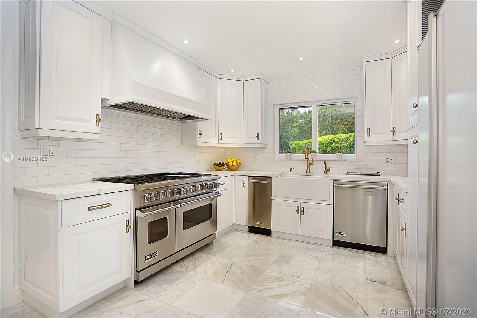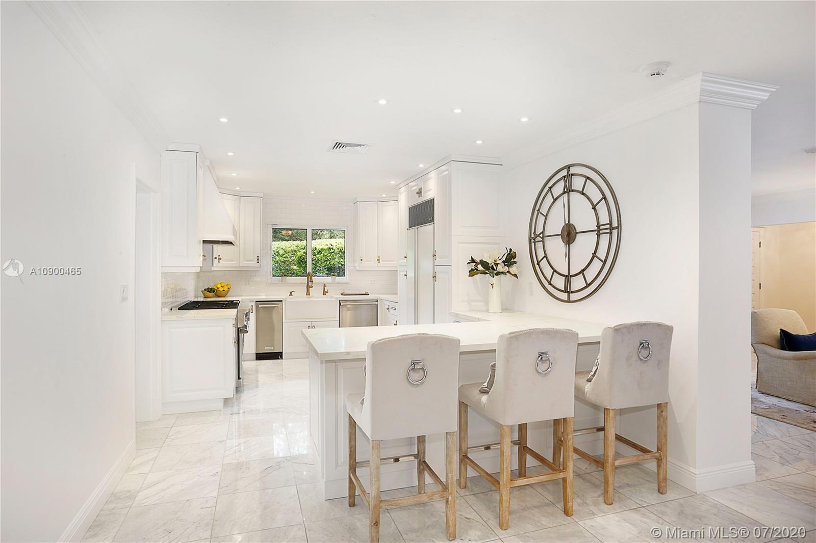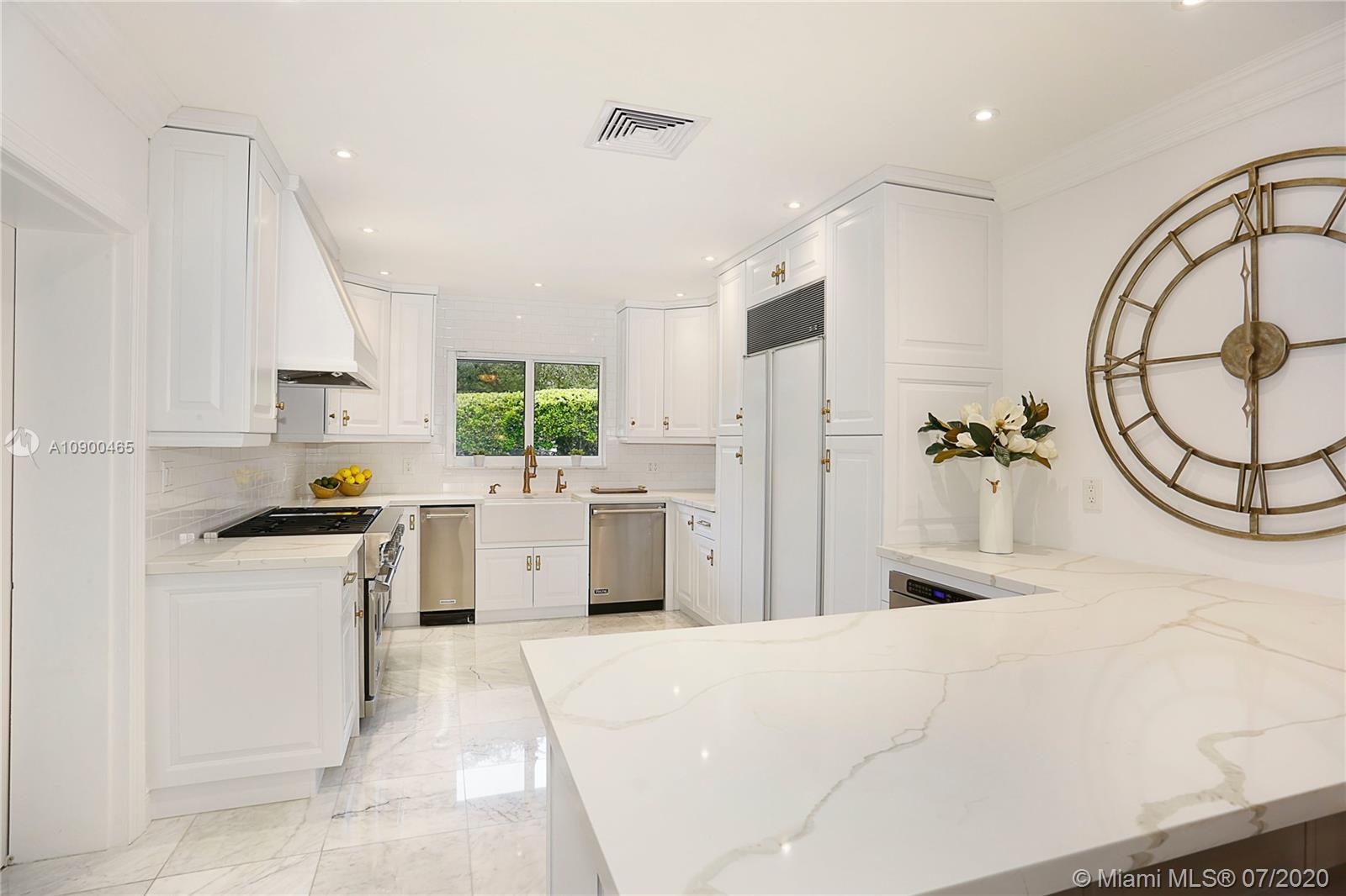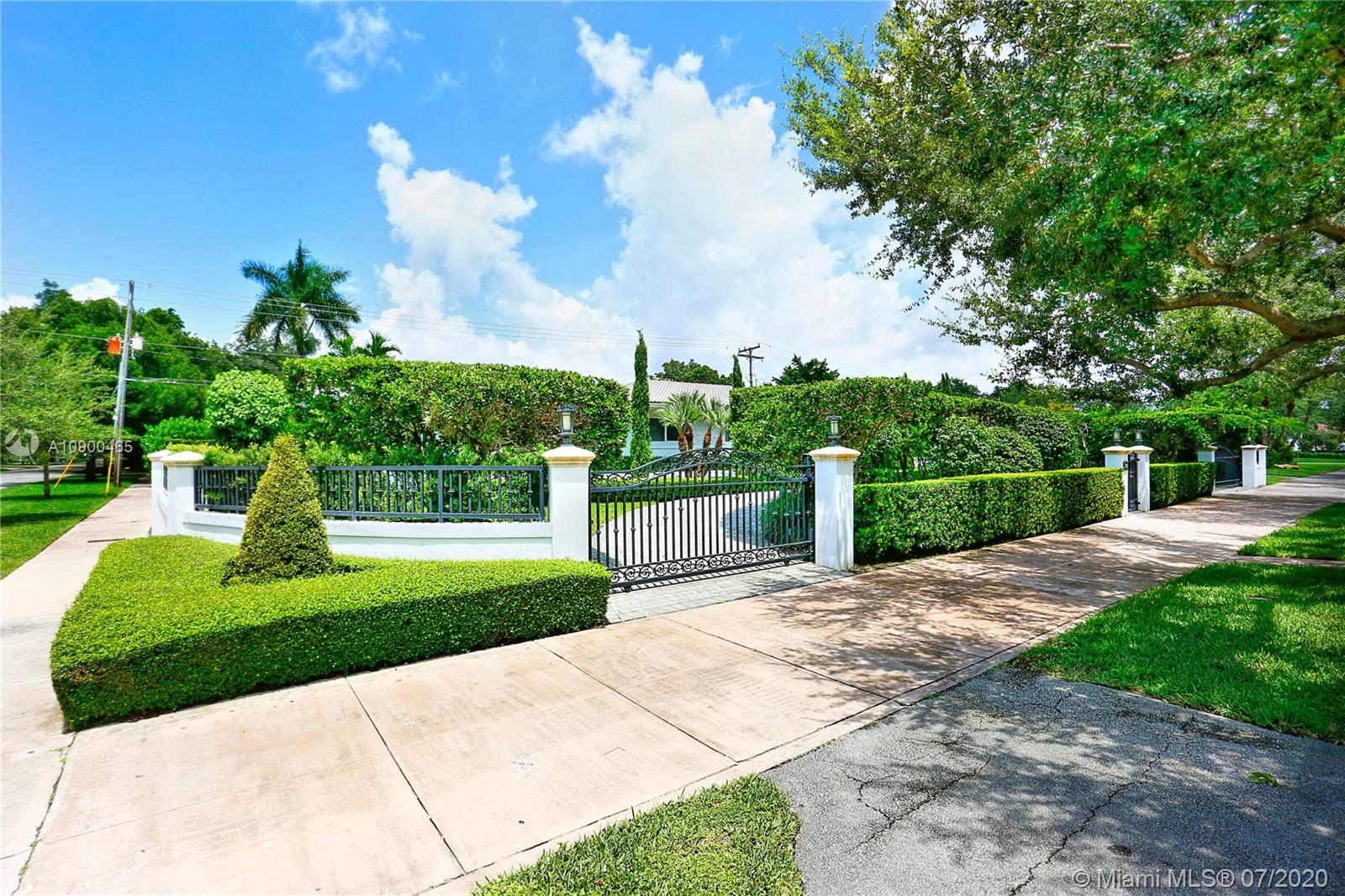 This elegant & spacious 3 bed/3 bath gated home with pool is nestled in South Coral Gables & sits on a 14,300 sq ft corner lot. The Master Suite is equipped with an oversized walk-in closet and dressing room which was previously used as a 4th bedroom. This home has many great features from an ample circular driveway, a grand dining room with high ceilings leading to the family room that's equipped with a summer kitchen. The beautiful eat-in kitchen features Viking appliances, quartz countertops, custom-made wood cabinets & a 48 dual gas range. In addition, the home has a large home office/media room with a bar. Other features include impact windows & doors, a 1-car garage, marble floors throughout & a screened-in pool. This is a wonderfully updated home perfect for relaxing & entertaining.
